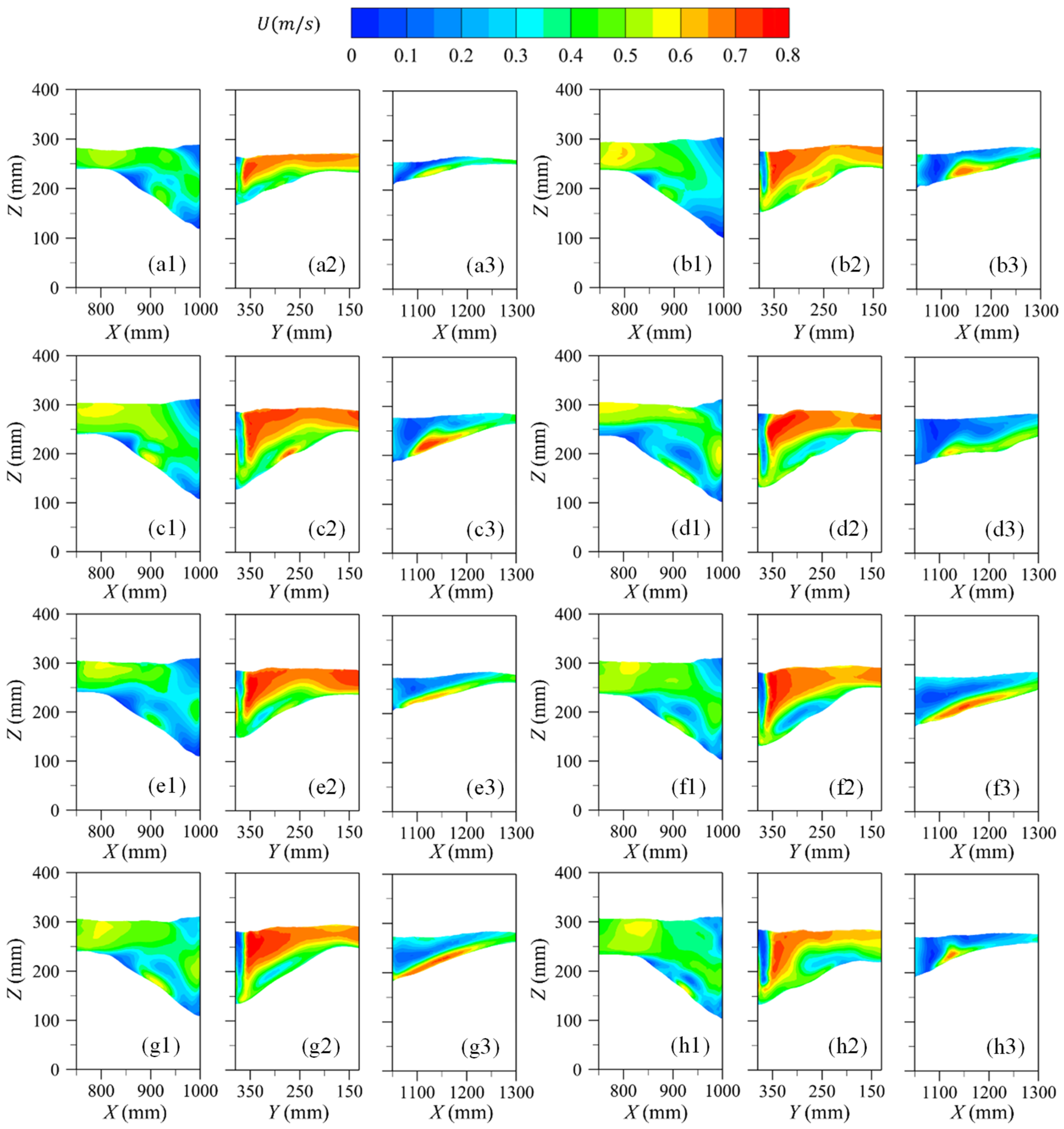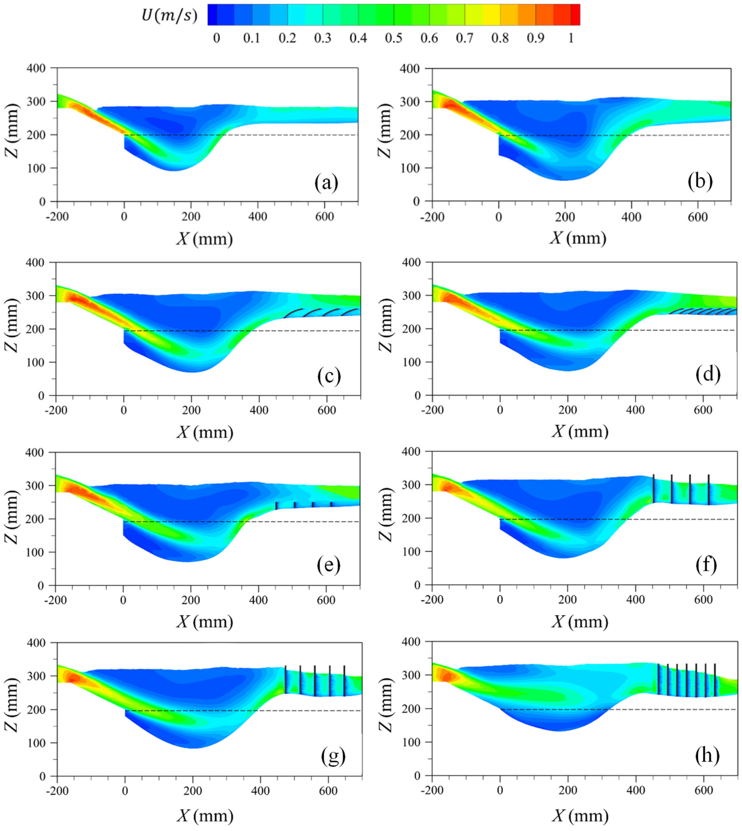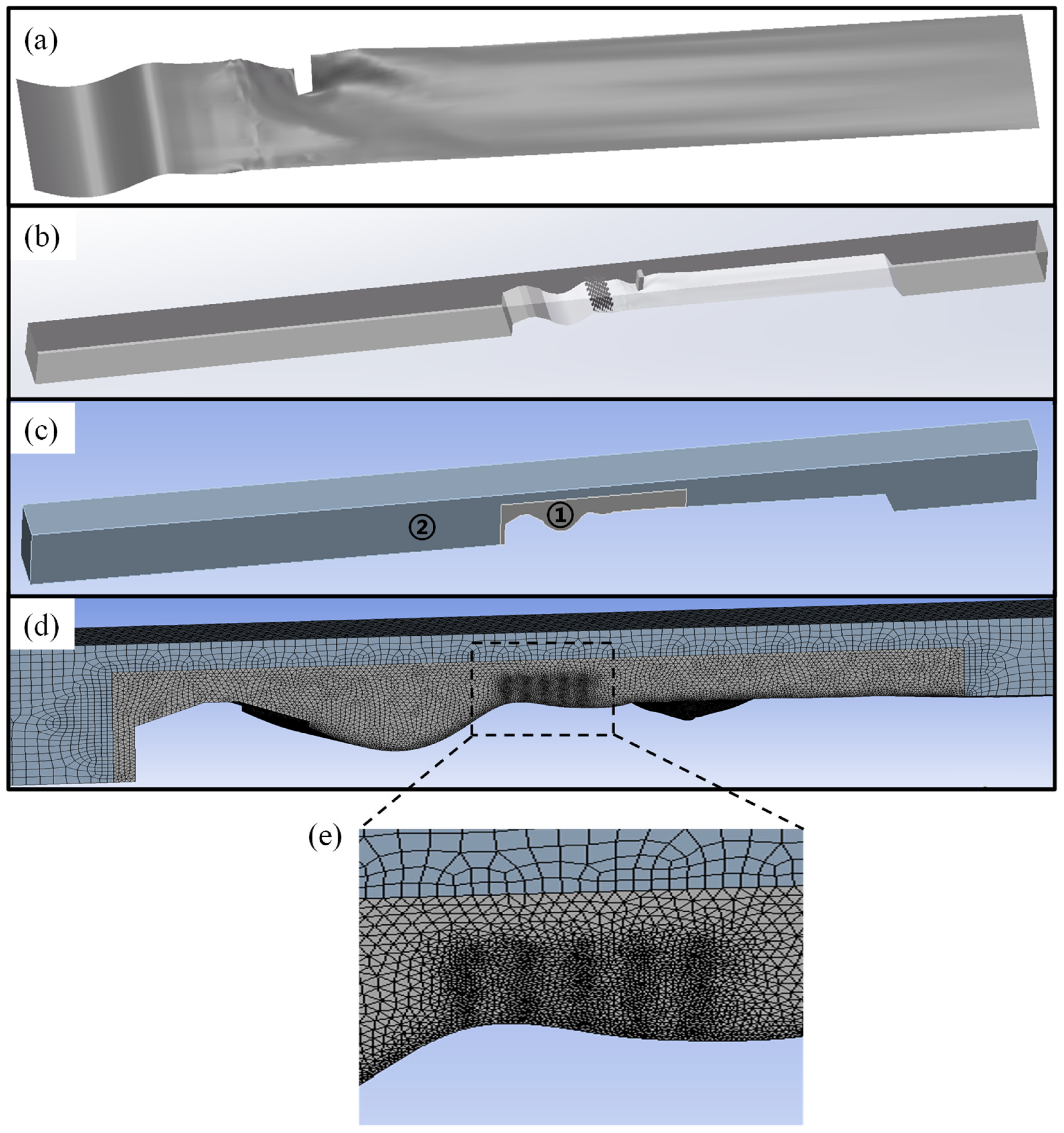 - Inlet Boundary Condition: The model’s inlet is set as a velocity inlet, with varying inlet velocities depending on the operating conditions. The average inlet velocity is calculated based on the water depth and flow rate at the inlet, as well as the inlet water depth.