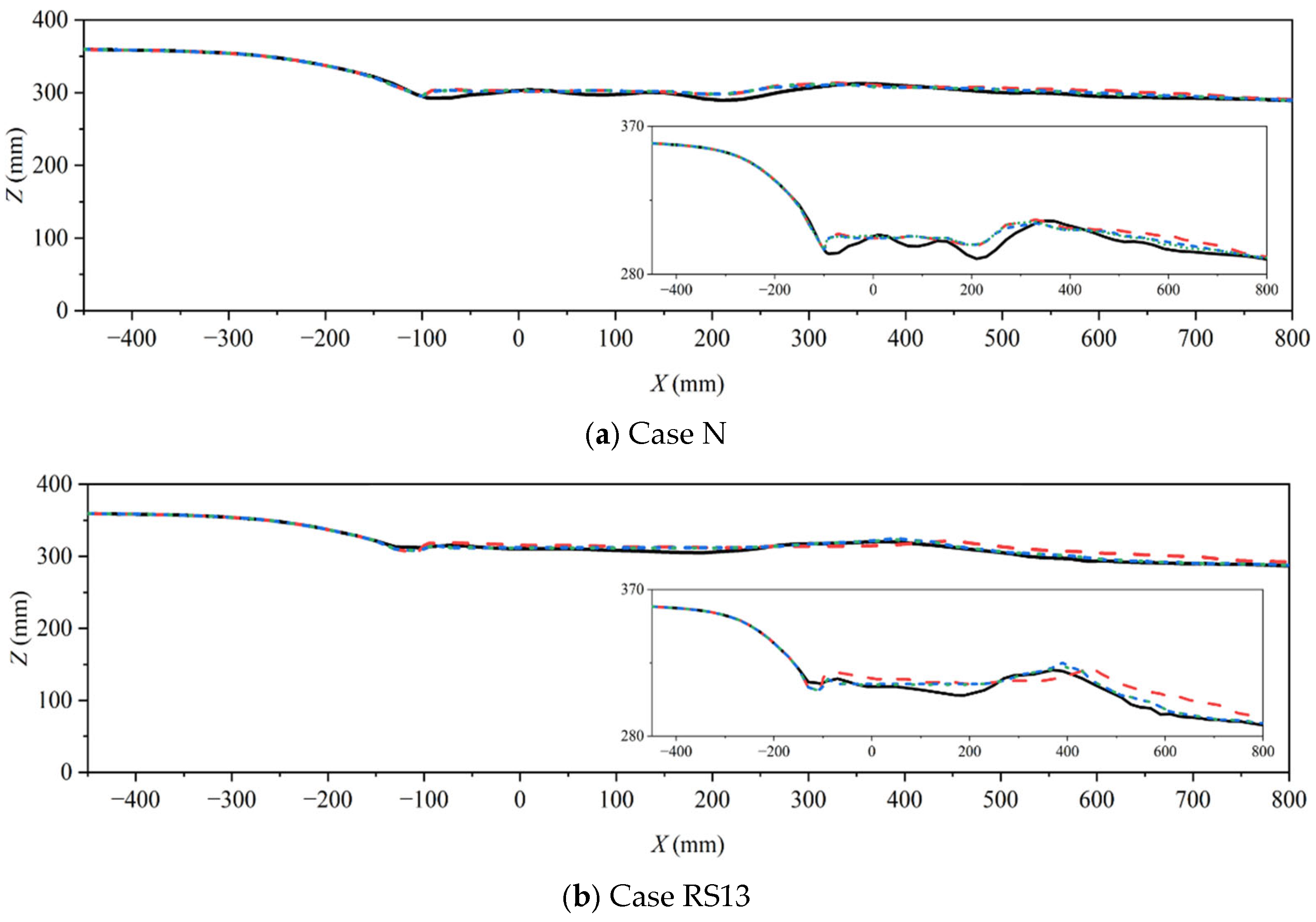 ” denote the results for course, median, and fine meshes, respectively. The inset figure enlarges the Z-axis scale and reduces the -axis scale to facilitate observation of differences in water surface elevation between the experimental results and numerical simulations.