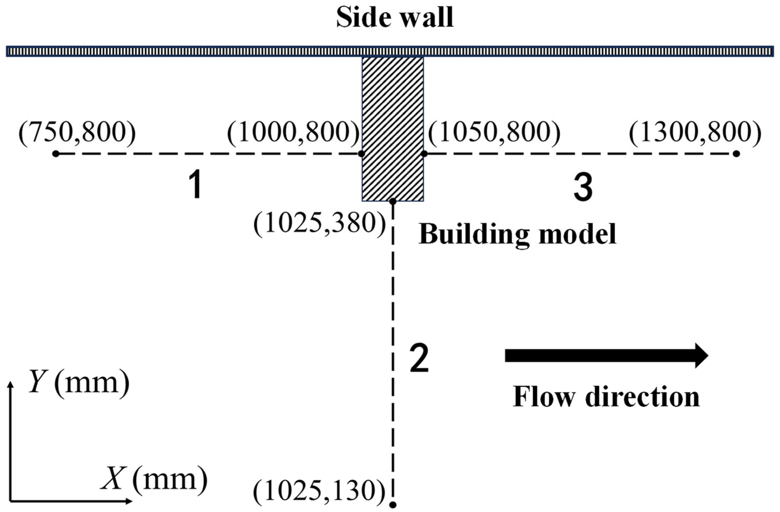 - Wall Boundary Conditions: The top boundary of the model is set as air and defined as a pressure outlet with atmospheric pressure. The surfaces of the tank walls, quartz sand bed, vegetation clusters, and building surfaces are all set as no-slip walls. In numerical simulations, the roughness of the walls must be specified according to their physical properties. The roughness height for the smooth walls on the sides and bottom of the tank is set to 0.0001 m. The roughness height of the quartz sand bed is typically set to the median particle diameter, which is 0.0028 m. The roughness of the surfaces of the vegetation clusters and building models is higher than that of the tank walls and is set to 0.0005 m [25].