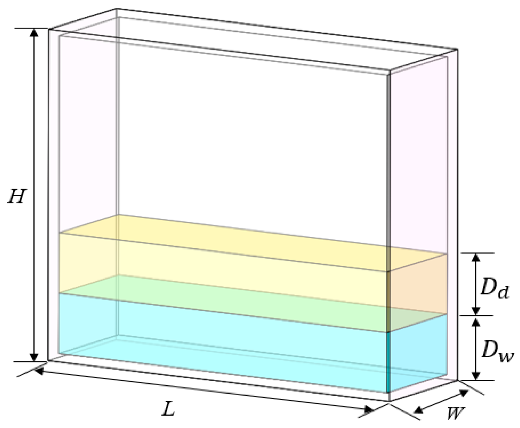 - Bauer, H.F. Oscillations of immiscible liquids in a rectangular container: A new damper for excited structures. J. Sound Vib. 1984, 93, 117–133. [Google Scholar] [CrossRef]