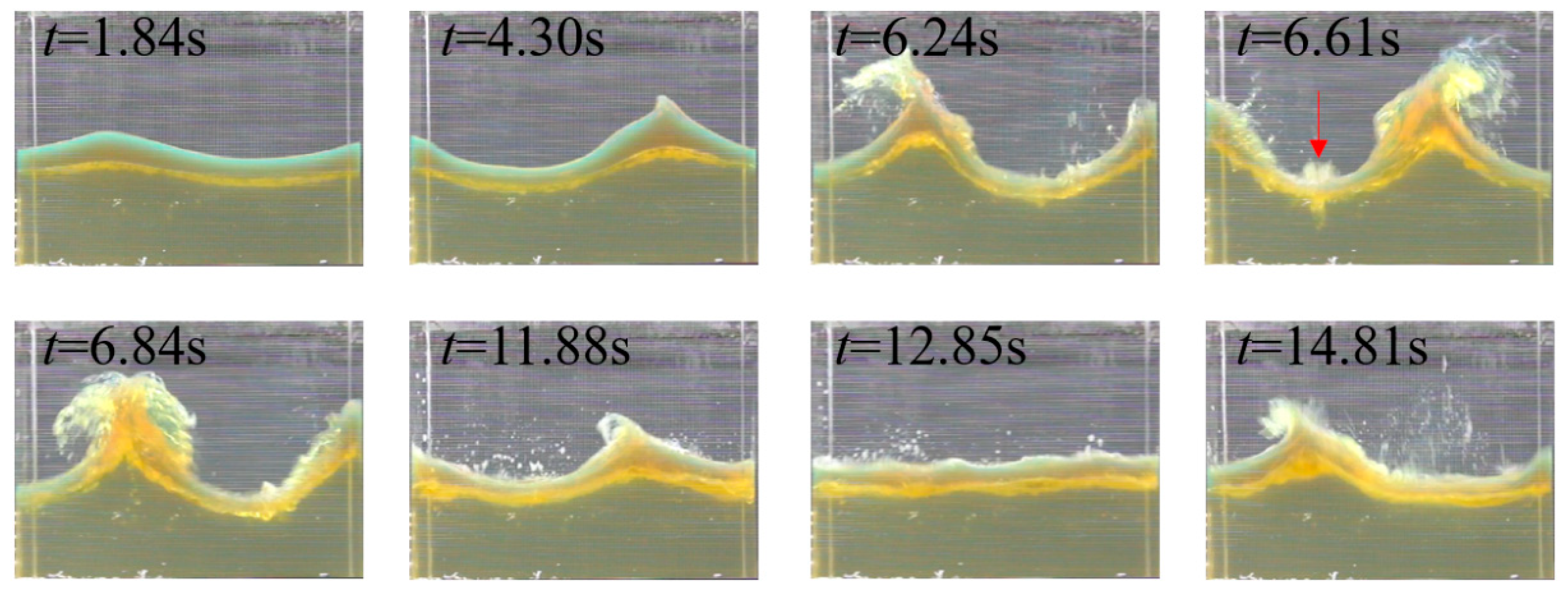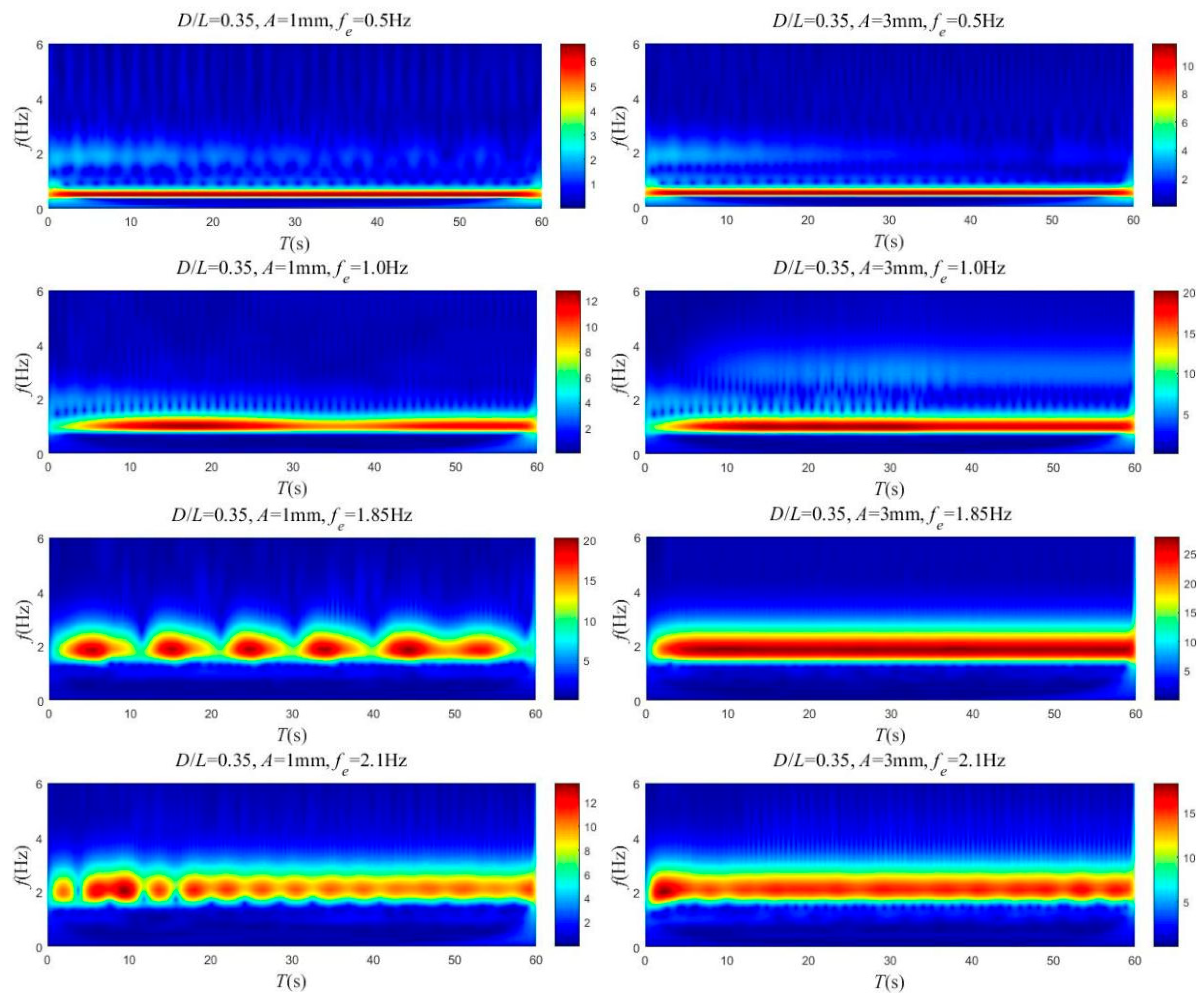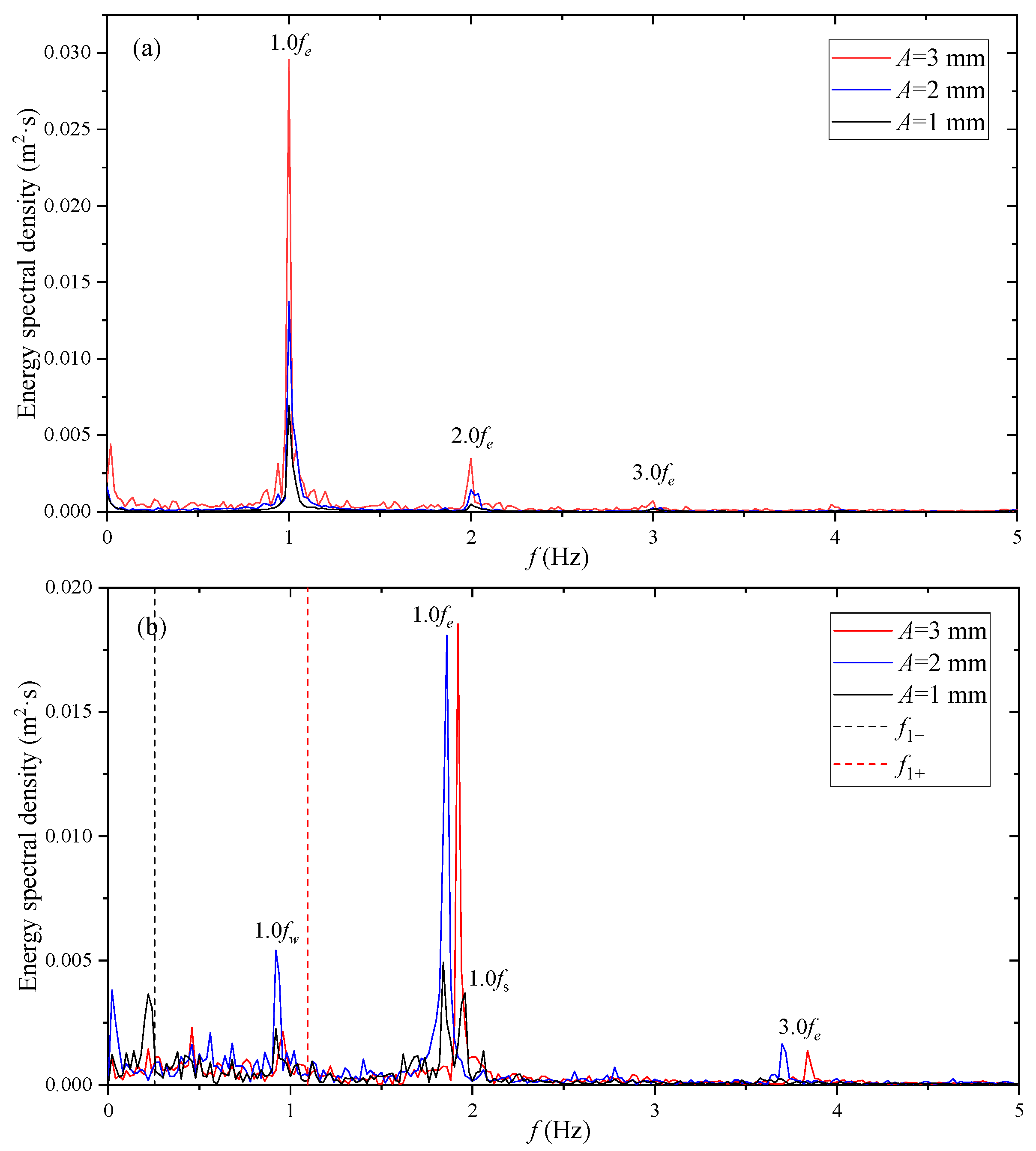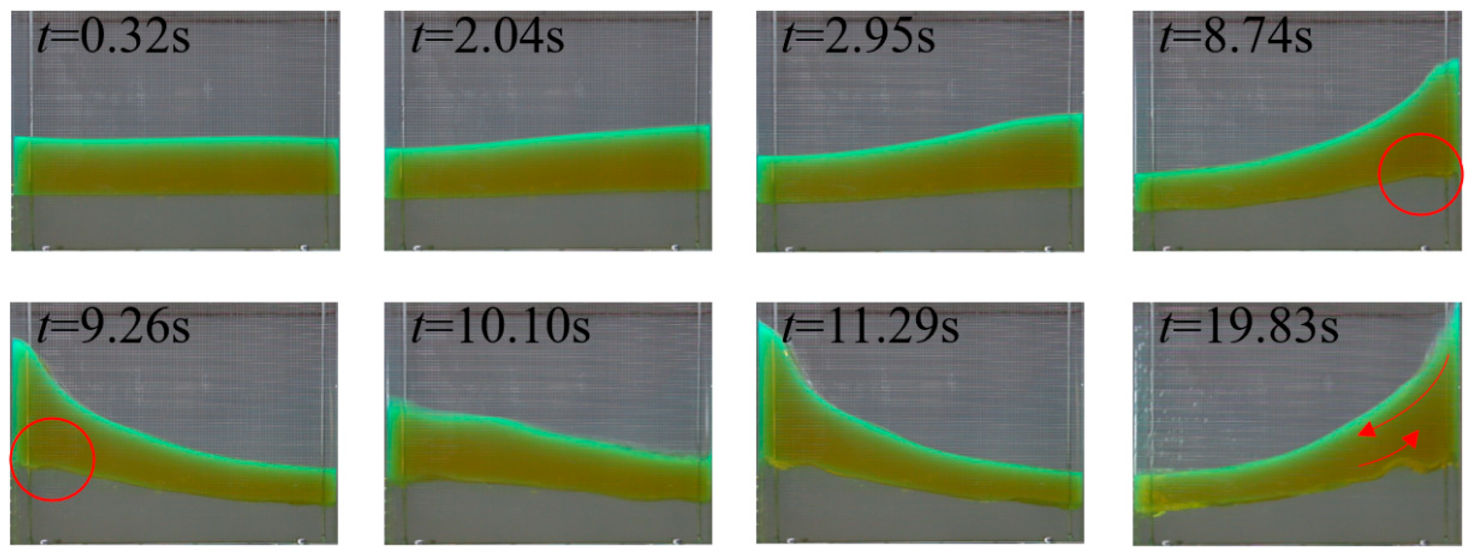 - Under small-amplitude excitation, two natural frequencies of the fluid due to density stratification can be captured, representing the separation and free surface movement, respectively, which are close to the analytical results. These can be used to adjust the frequency band of the damper according to the structural displacement response spectrum.