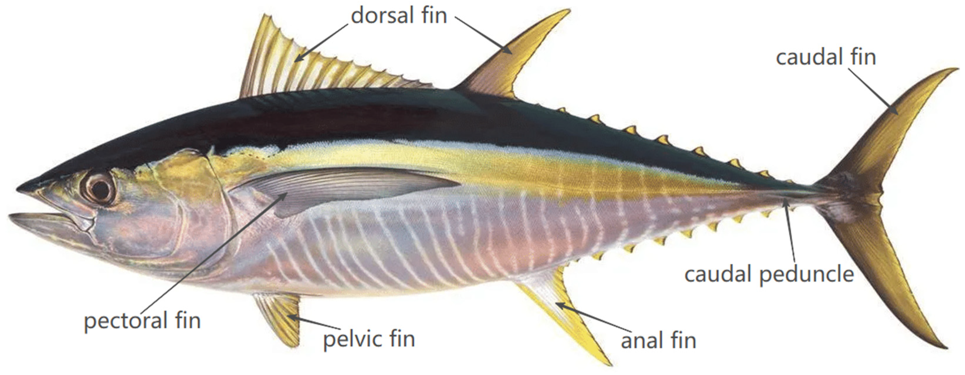 - Zhang, J.D.; Sung, H.J.; Huang, W.X. Specialization of tuna: A numerical study on the function of caudal keels. Phys. Fluids 2020, 32, 111902. [Google Scholar] [CrossRef]