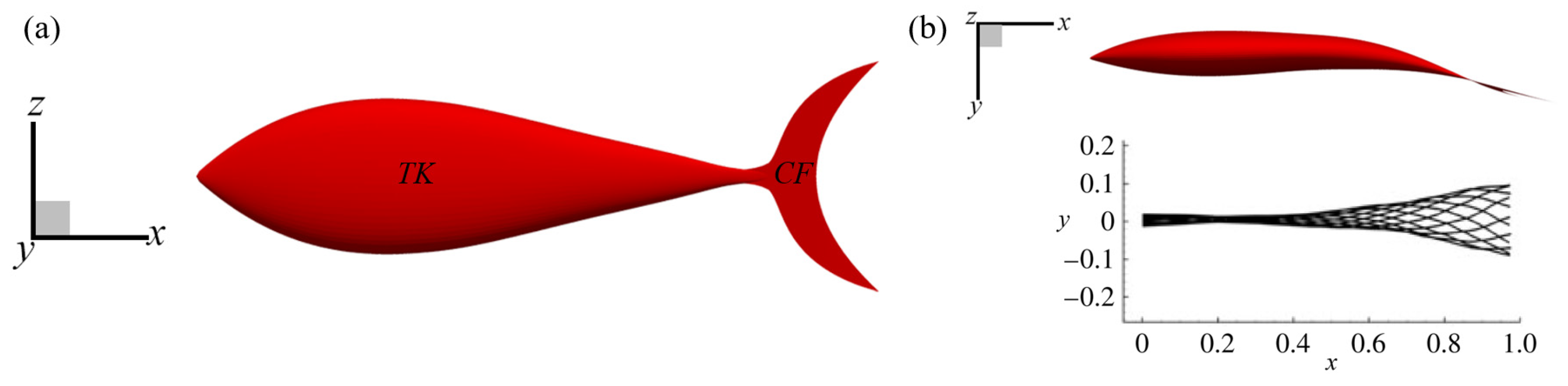 - Huang, S.; Guo, D.; Wang, Y.; Yang, G.; Yin, B. Hydrodynamics of morphology for thunniform swimmers: Effects of the posterior body shape. Ocean Eng. 2023, 272, 113866. [Google Scholar] [CrossRef]