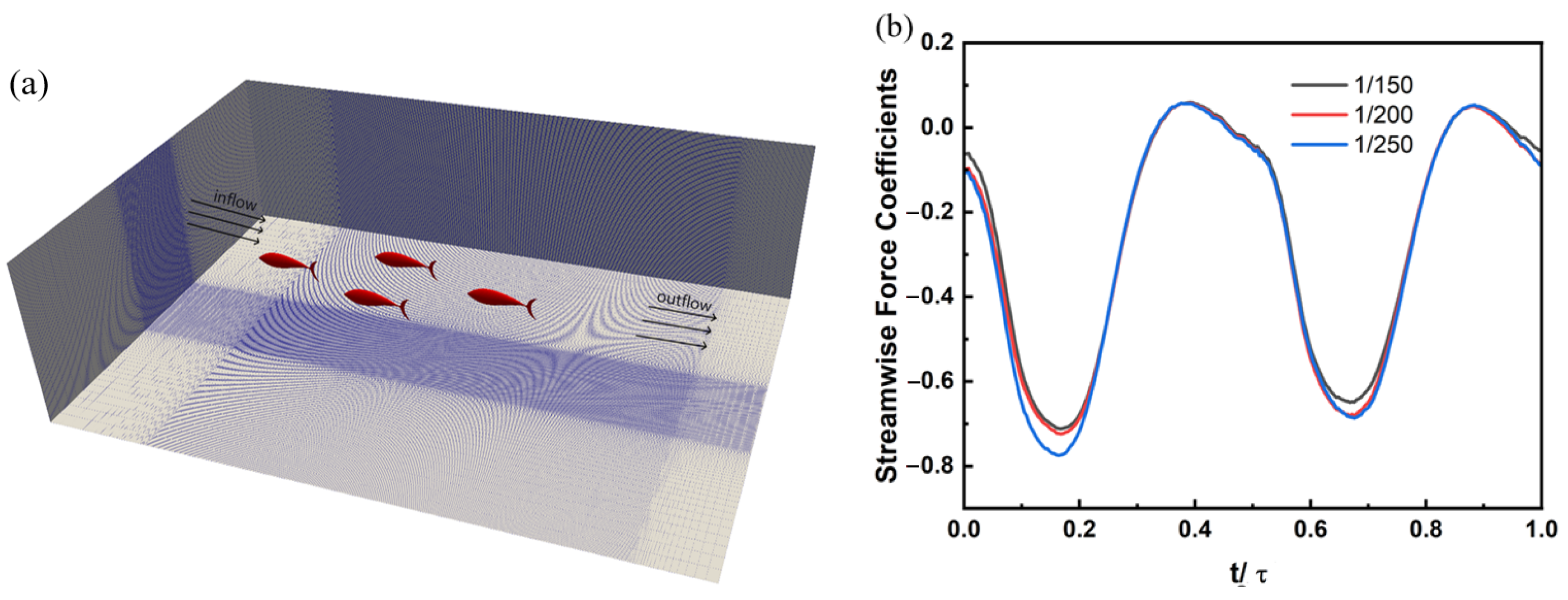 - Guo, J.C.; Dong, H.B. A computational study of in-phase and anti-phase interactions of fish in a phalanx school. ASME J. Fluids Eng. 2025, 147, 071106. [Google Scholar] [CrossRef]
