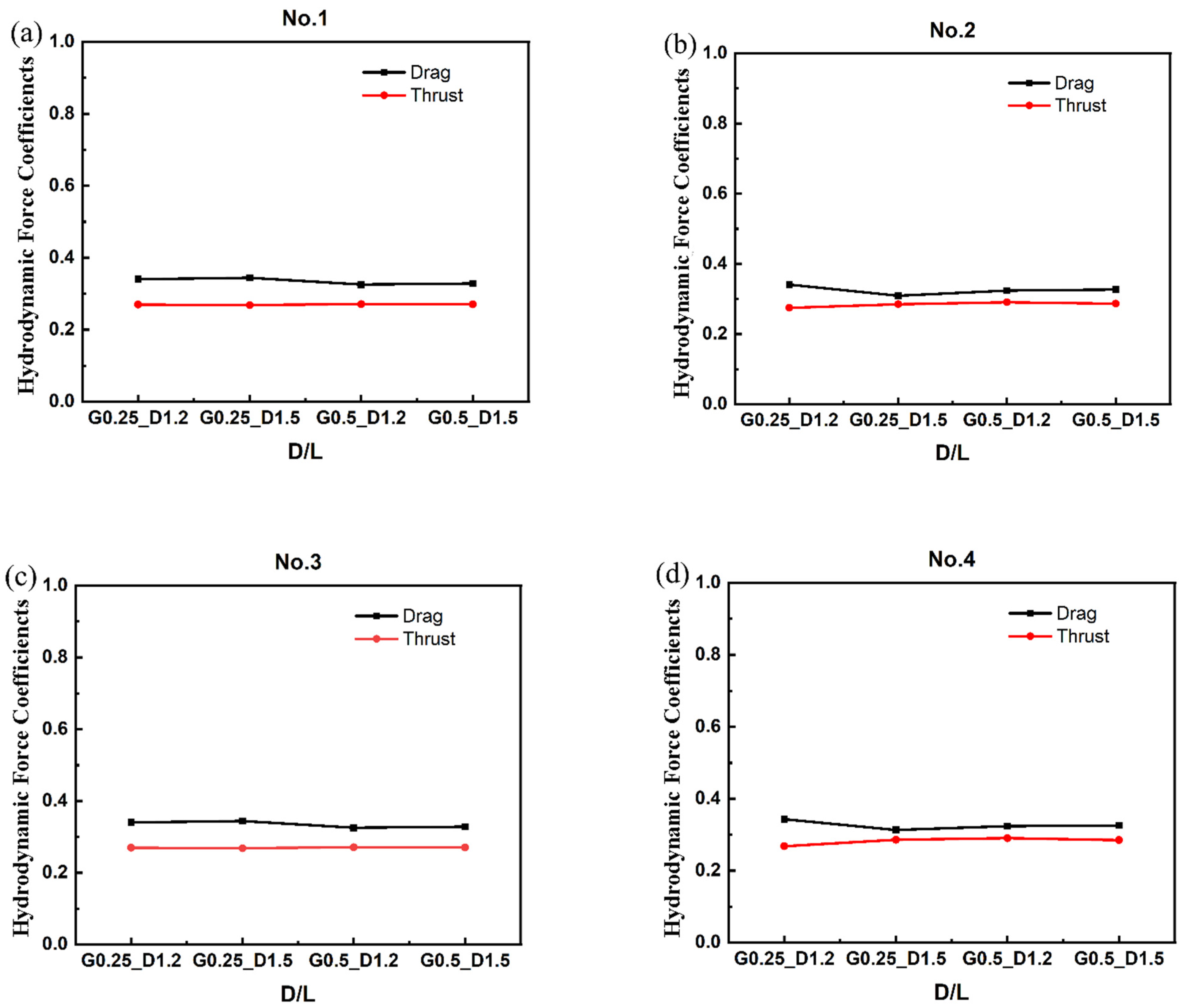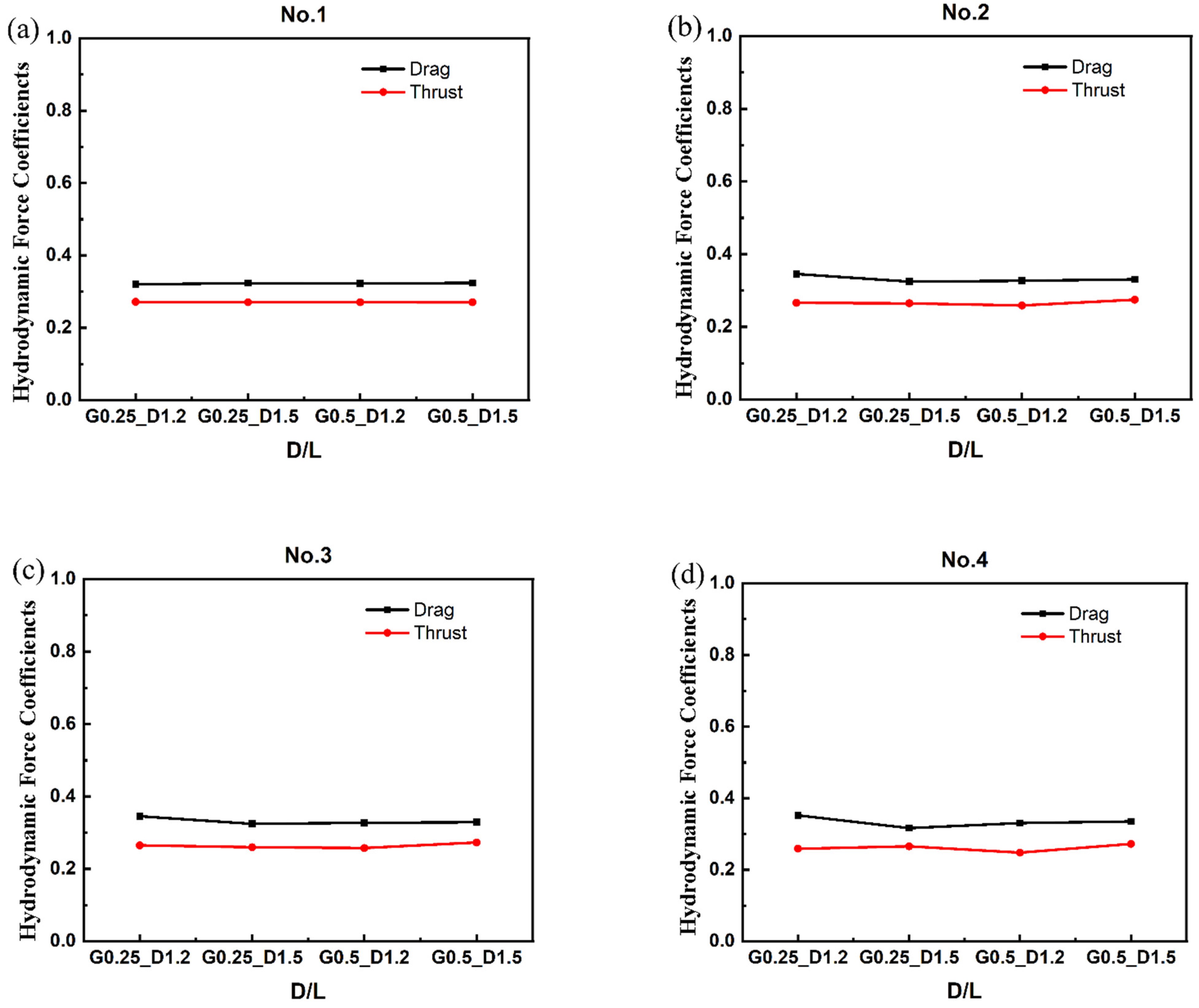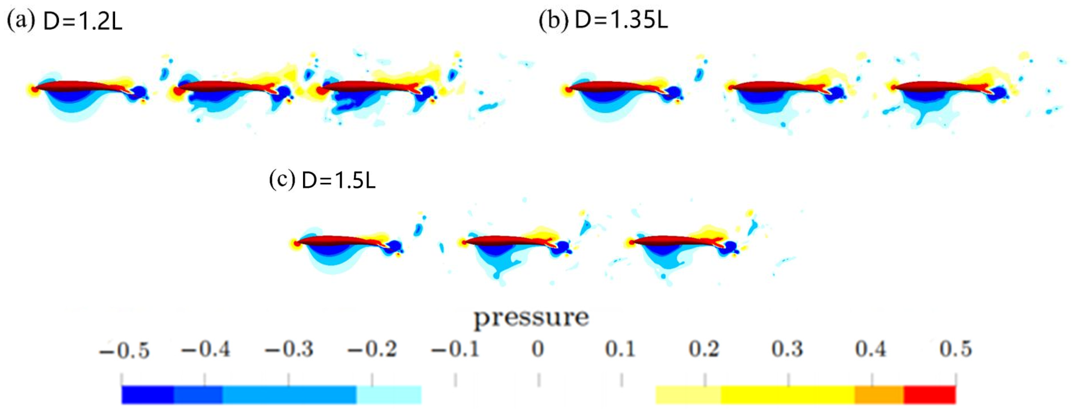 - At a larger lateral spacing (G = 0.5L): Streamwise spacing variations have a notable effect on the thrust of the fish body. Drag remains nearly unchanged, while thrust exhibits pronounced sensitivity to D. The altered wake interaction dynamics result in enhanced vortex shedding synchronization between adjacent fish.