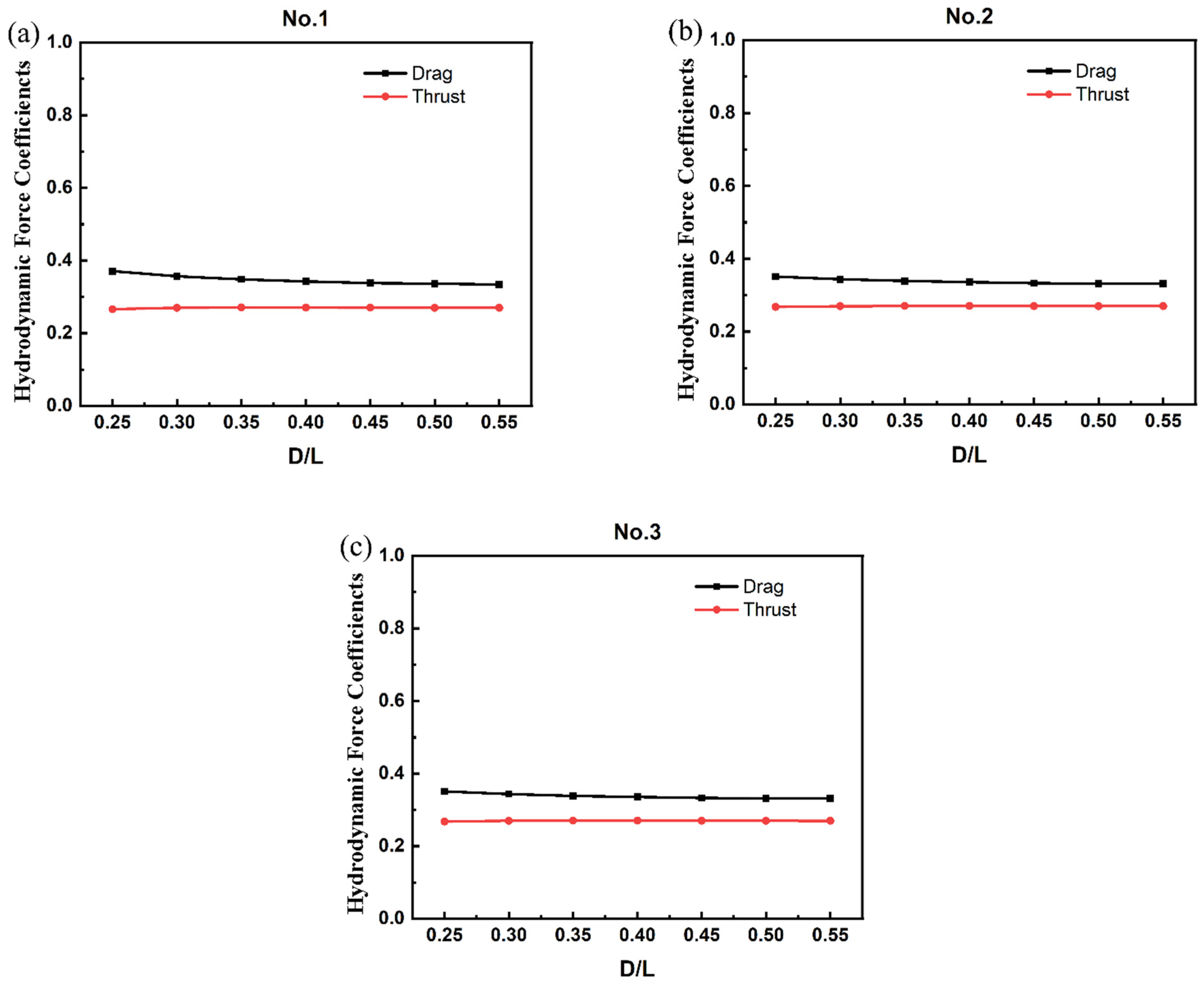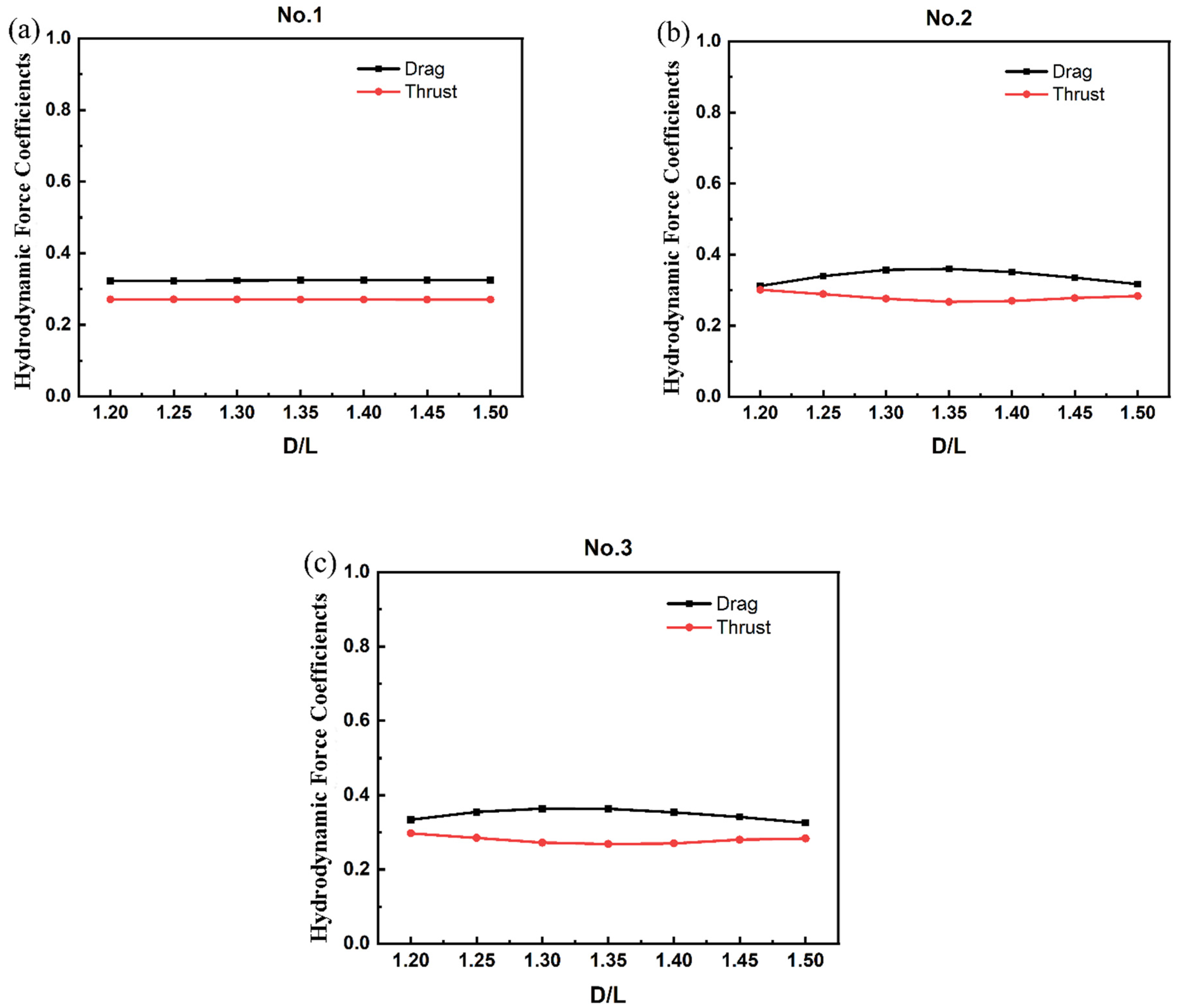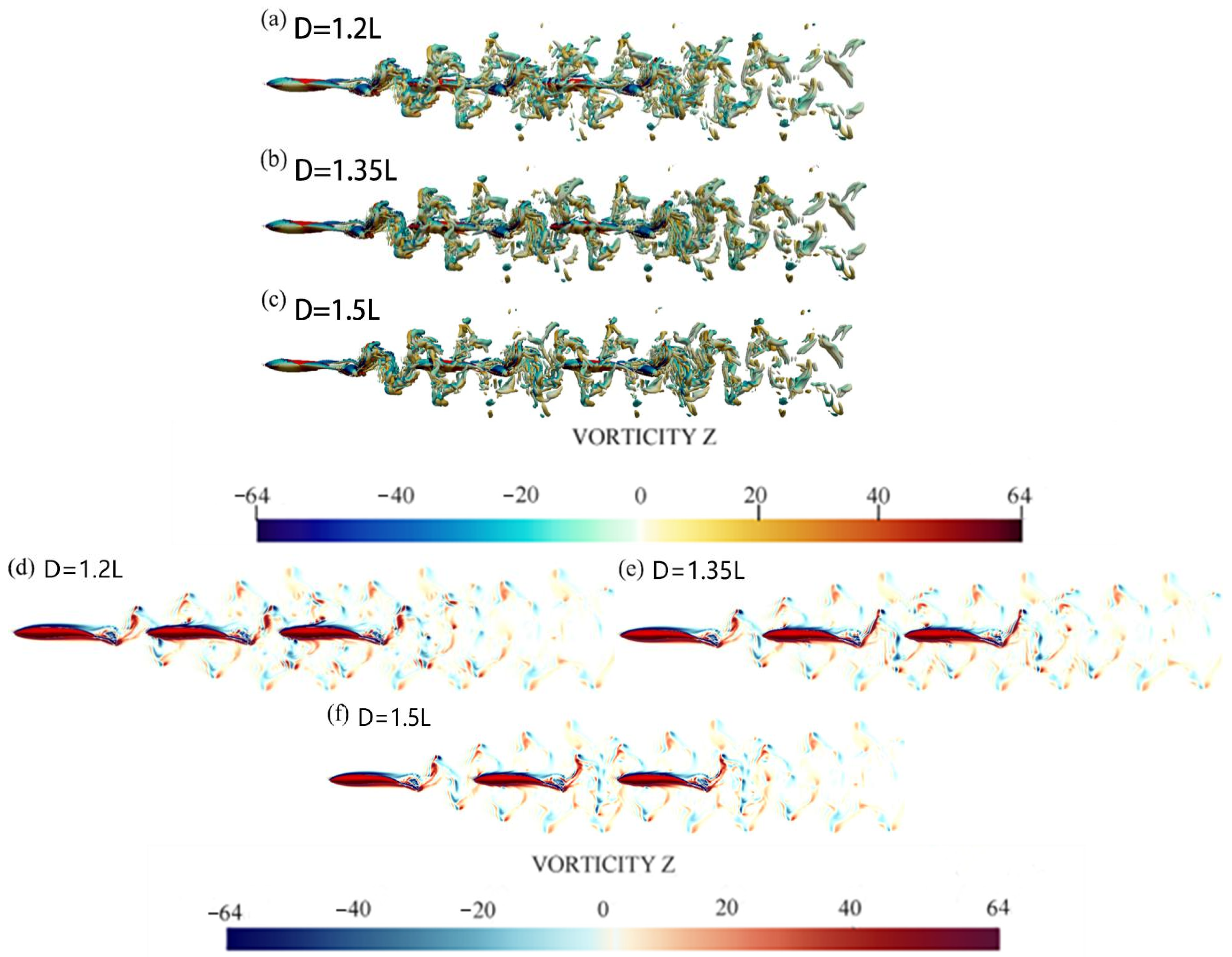 - At a larger lateral spacing (G = 0.5L): Streamwise spacing variations have a notable effect on the thrust of the fish body. Drag remains nearly unchanged, while thrust exhibits pronounced sensitivity to D. The altered wake interaction dynamics result in enhanced vortex shedding synchronization between adjacent fish.