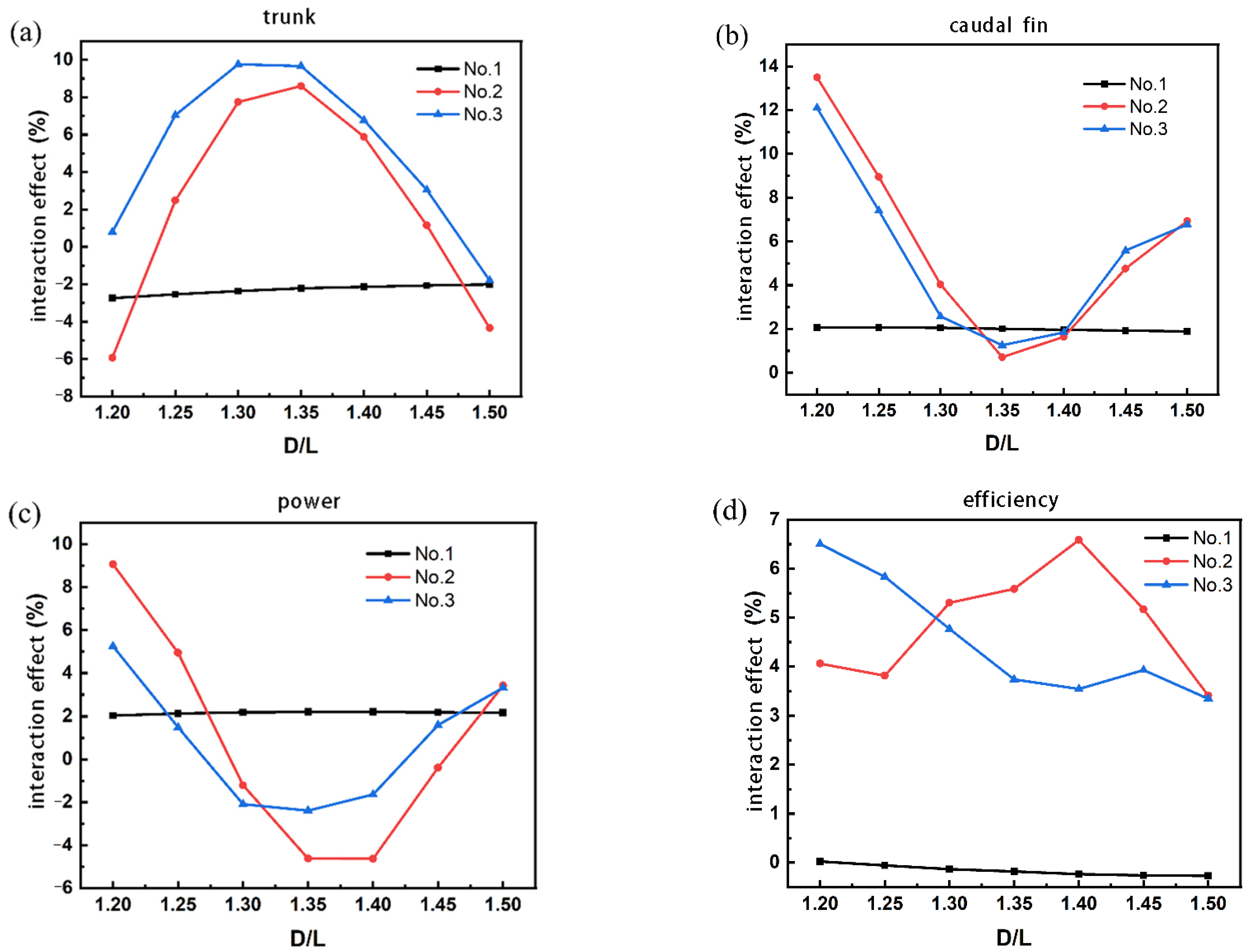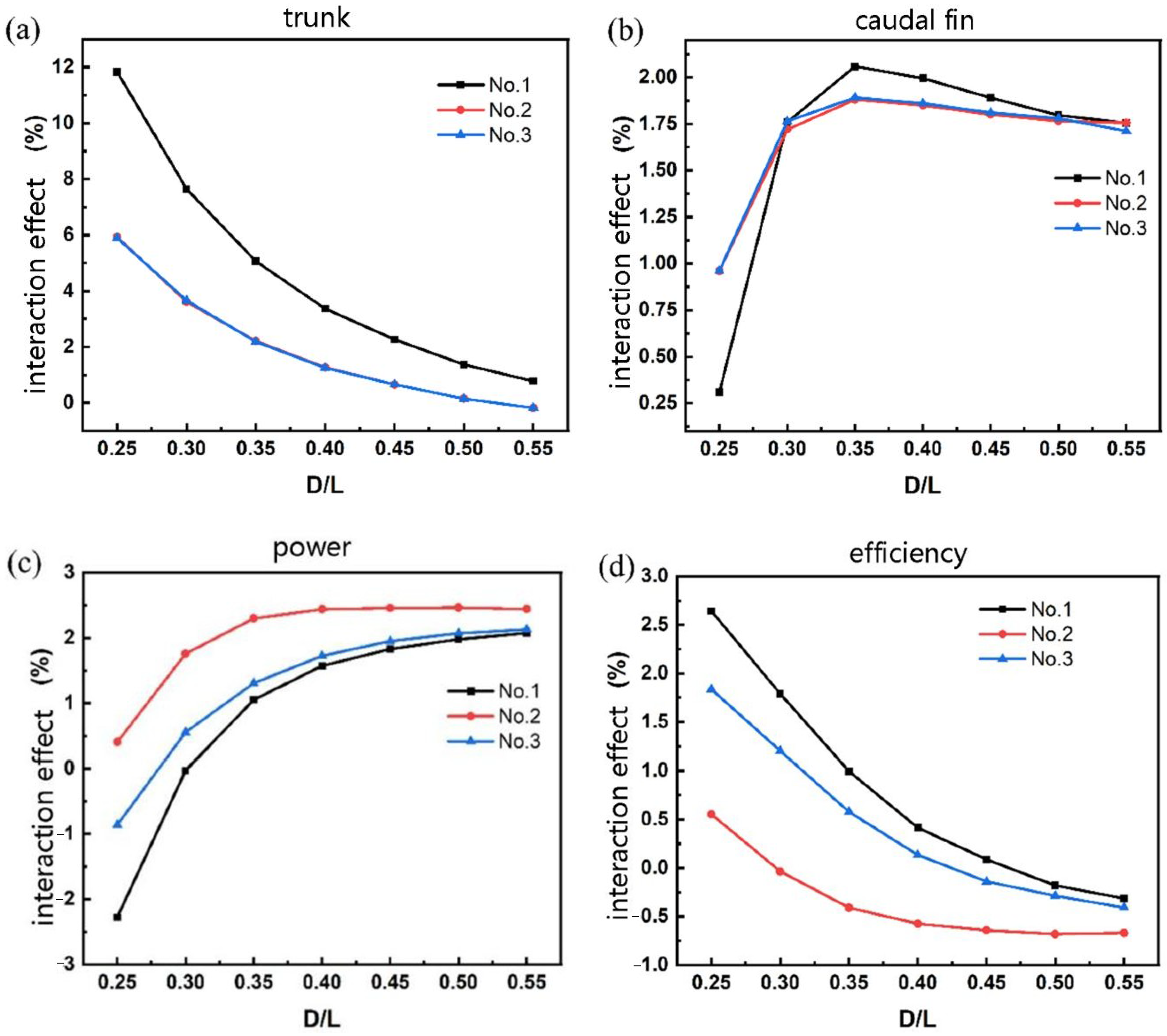 - At a small lateral spacing (G = 0.25L): Variations in streamwise spacing (D) exert a significant influence on both drag and thrust coefficients. However, the increased mechanical power consumption leads to reduced propulsive efficiency despite favorable force modifications. This inefficiency stems from excessive turbulent dissipation in the tightly packed formation.