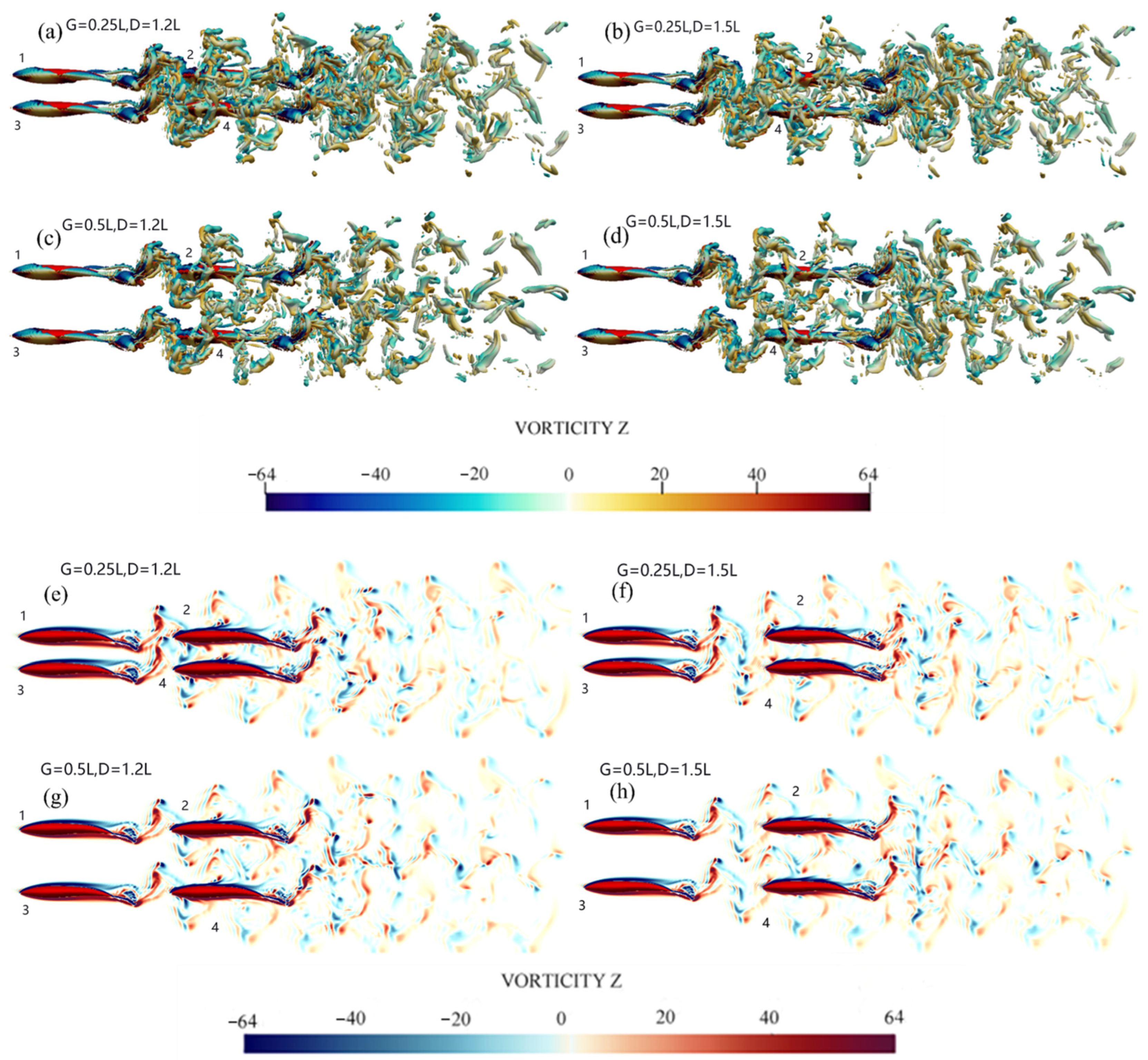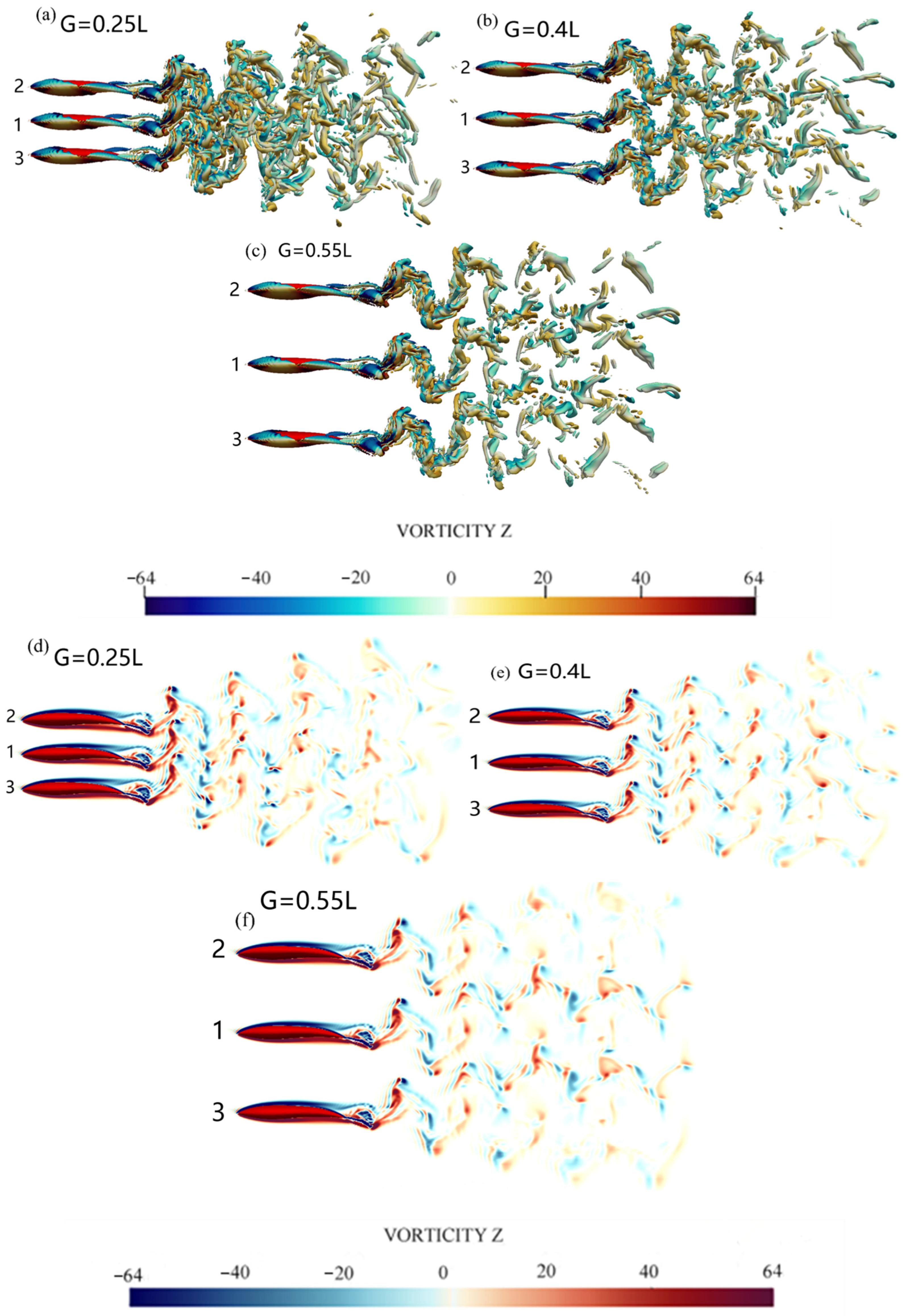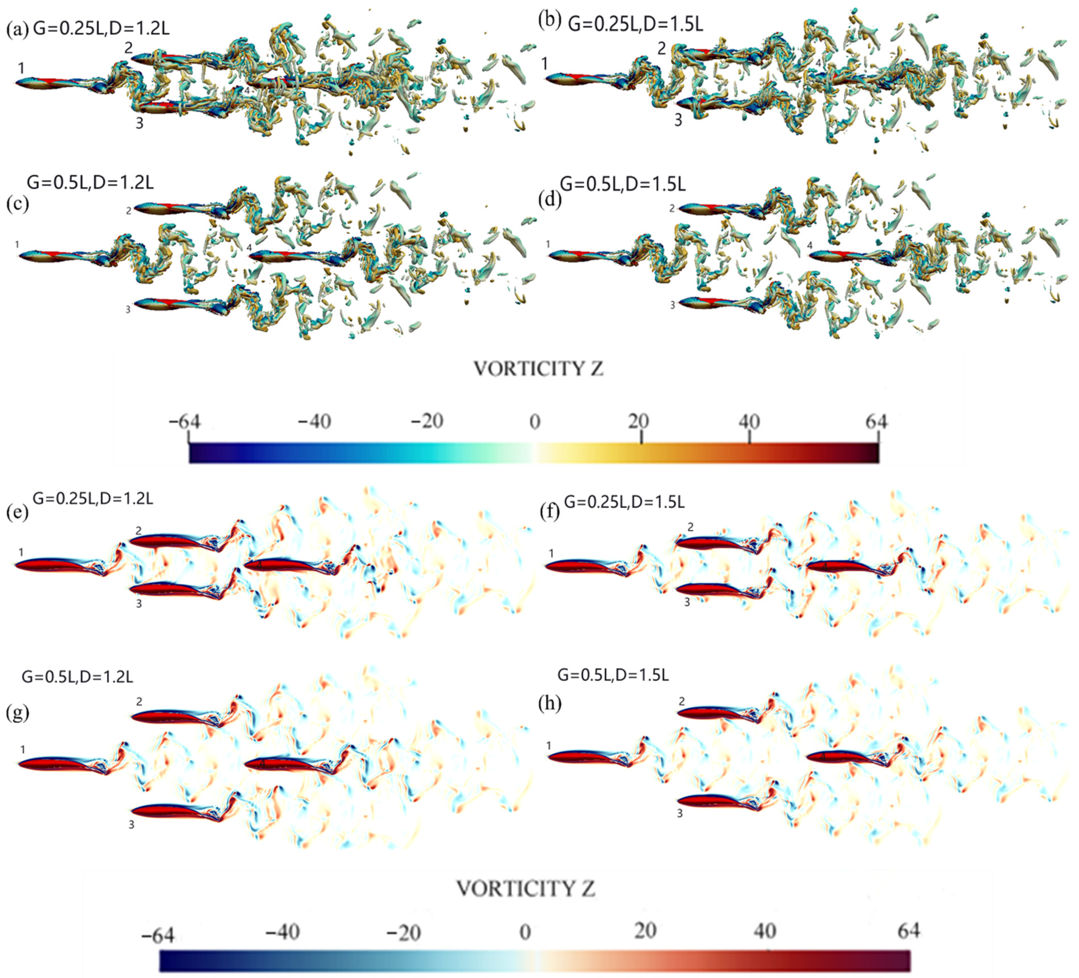 - Wake structure analysis: When both lateral and streamwise spacings are large (G = 0.5L and D = 1.5L), a stable 2S (two-signature) vortex structure emerges in the wake. This organized vortex pattern is highly conducive to thrust generation through constructive vortex shedding synchronization. The 2S wake configuration represents an optimal hydrodynamic arrangement for energy-efficient collective swimming.