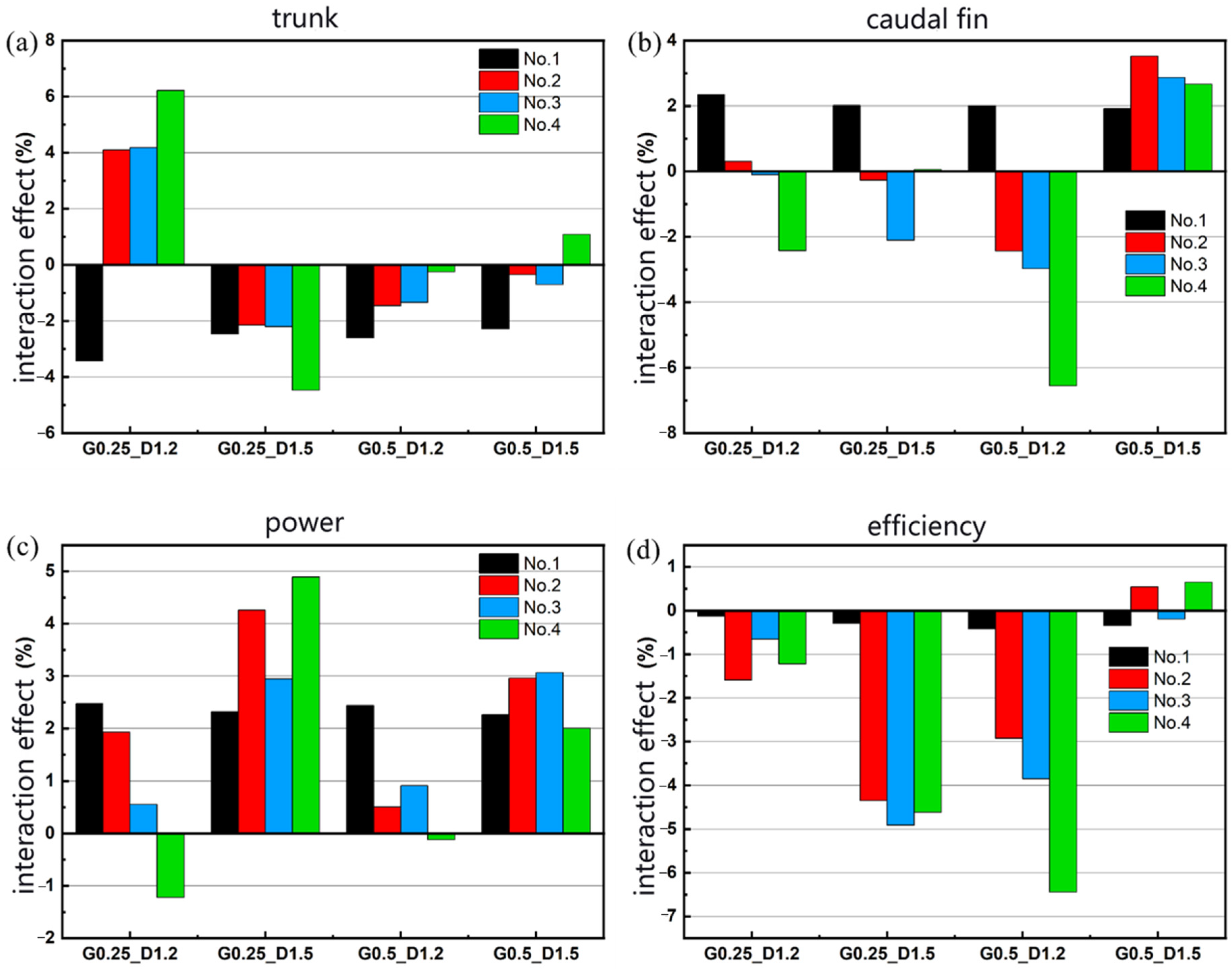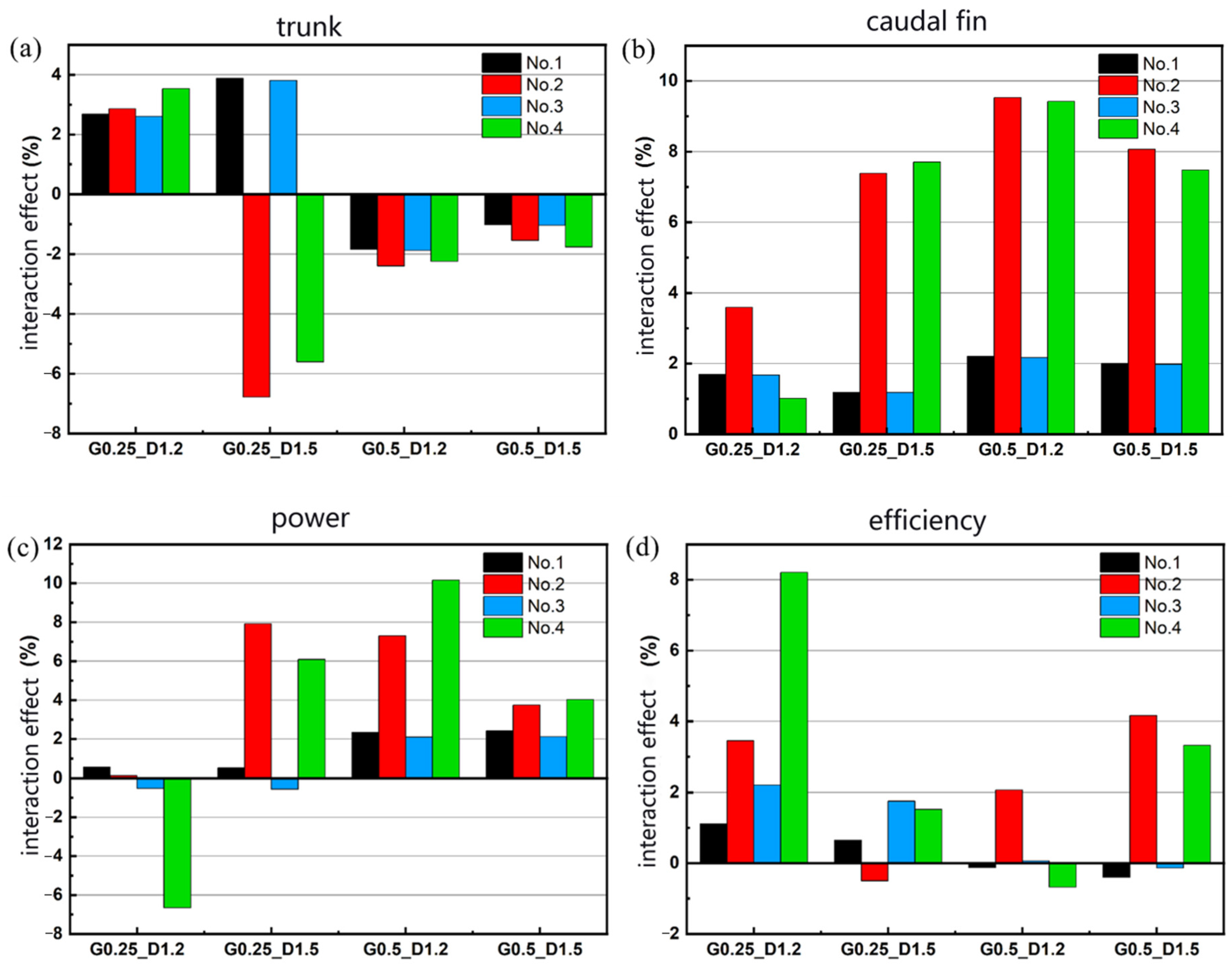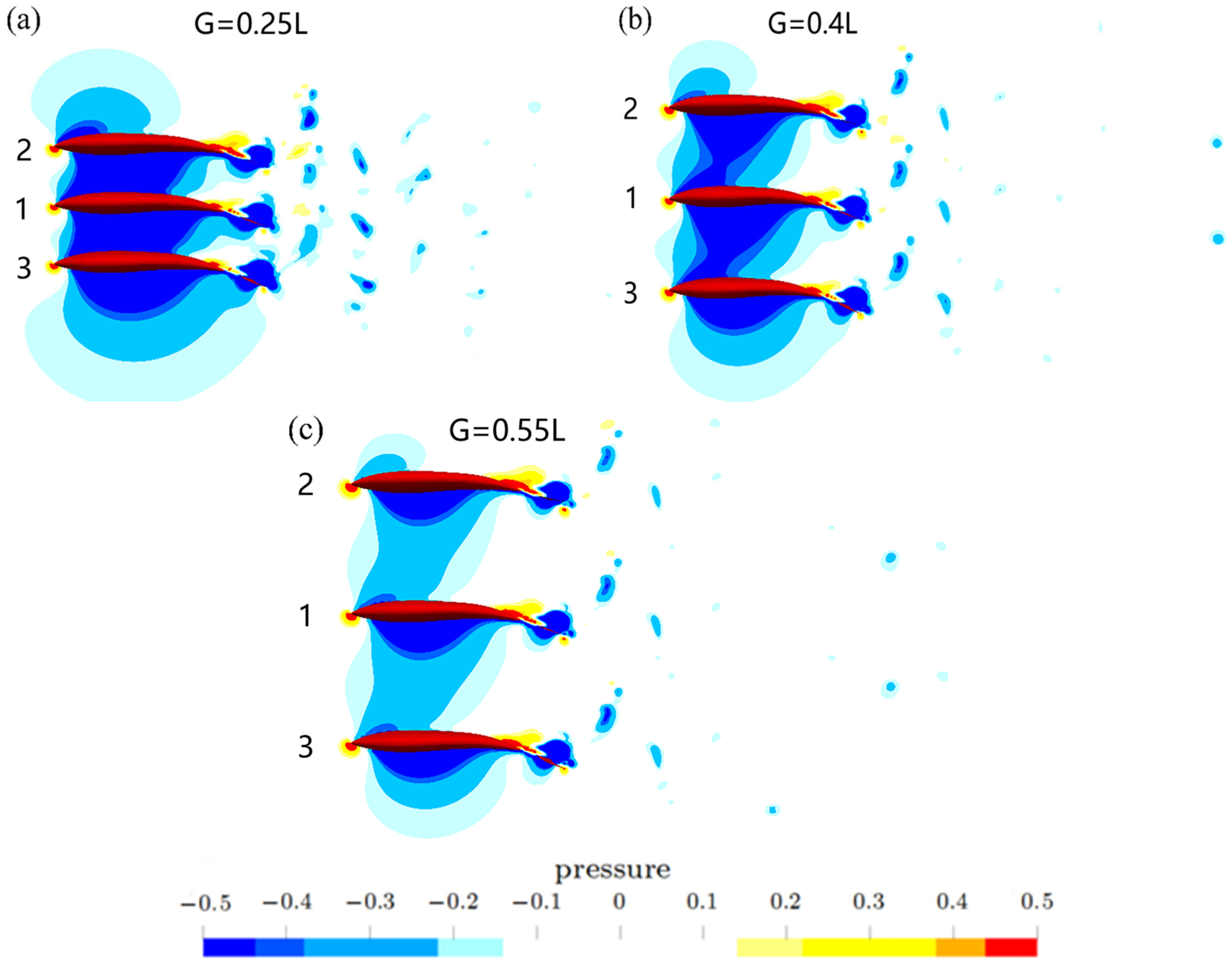 - Physical mechanism analysis: The differential effects stem from spatial variation in wake impingement. At a small G, Fish 1’s wake predominantly interacts with the body regions of Fish 2 and 3, affecting their drag. At a larger G, the wake impinges on the caudal regions of Fish 2 and 3, directly influencing their thrust. Fish 4, positioned centrally between Fish 2 and 3, experiences amplified hydrodynamic loading with physical quantities approximately twice those of Fish 2 and 3.