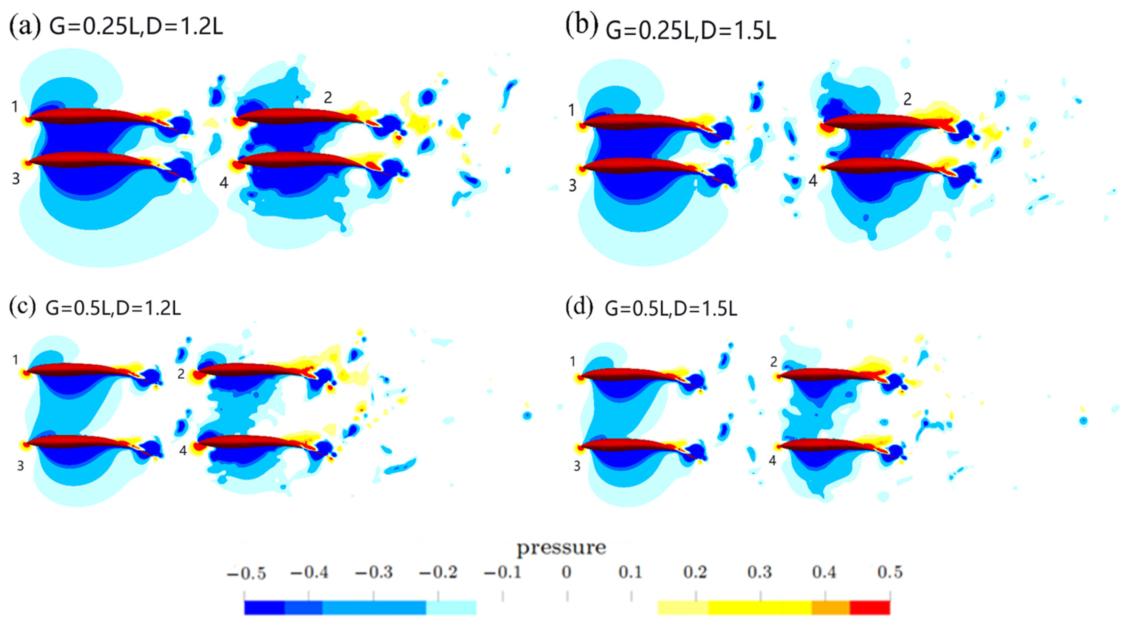 - At a small lateral spacing (G = 0.25L): Variations in streamwise spacing (D) induce significant drag modulation on the fish bodies. Fish 4 experiences an 11% reduction in drag coefficient with a minimal change in thrust. This drag reduction is attributed to constructive wake capture, where the lateral proximity enables Fish 4 to exploit the low-pressure regions between Fish 2 and 3.