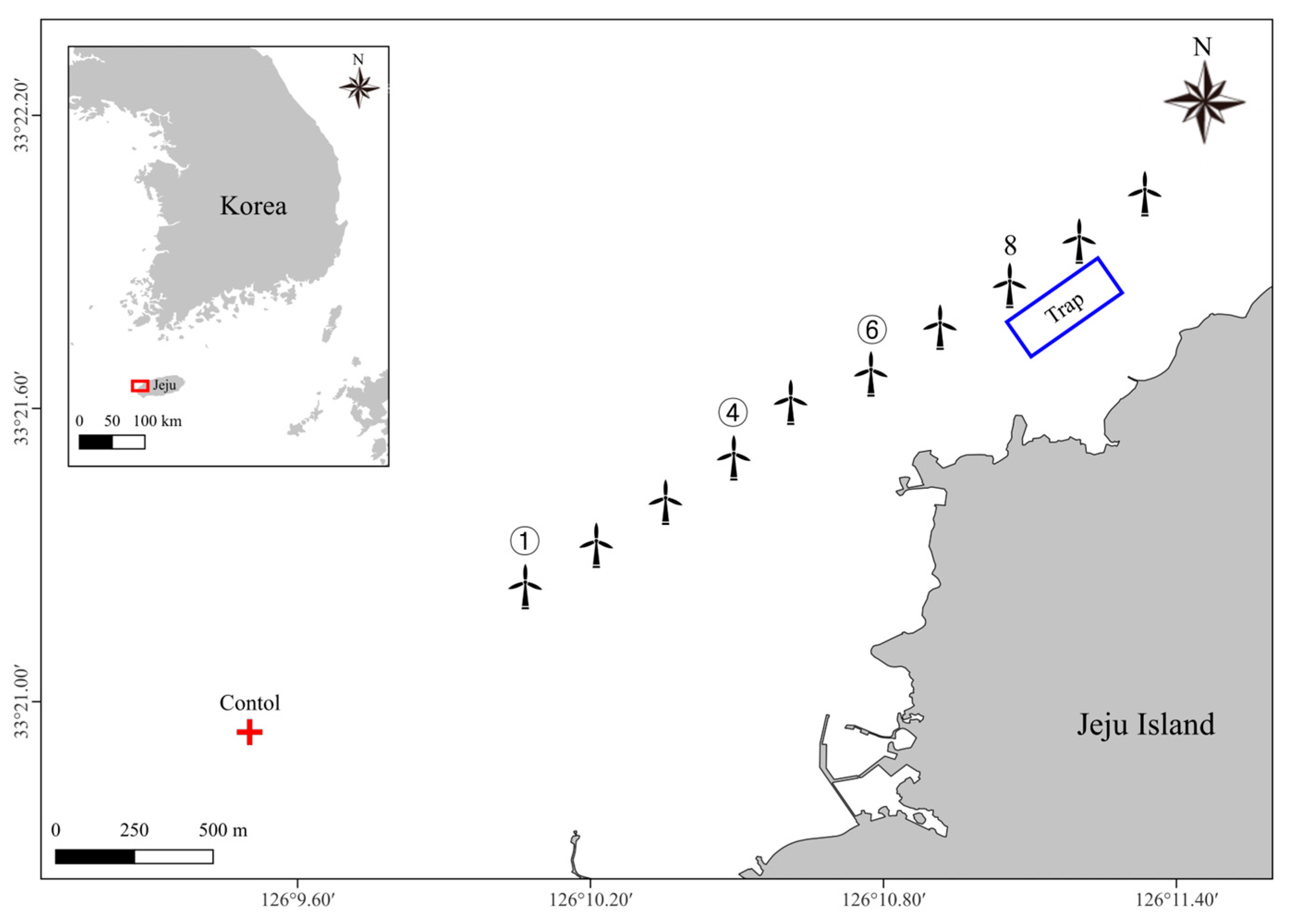 This study was conducted at the Jeju Tamra Offshore Wind Farm (also reported as “Tamna” in some sources; commissioned in 2017) and adjacent coastal waters off Hangyeong-myeon, Jeju Island, Korea (centered at approximately 33°21′41″ N, 126°10′31″ E; WGS84). The wind farm is located approximately 0.5–1.2 km offshore of the coast. The seabed in the study area is characterized by a predominantly rocky substrate, with sand deposits accumulated locally depending on micro-topography. The site has been described as exhibiting typical features of subtropical rocky-reef environments around the southern Korean Peninsula (Figure 1).
