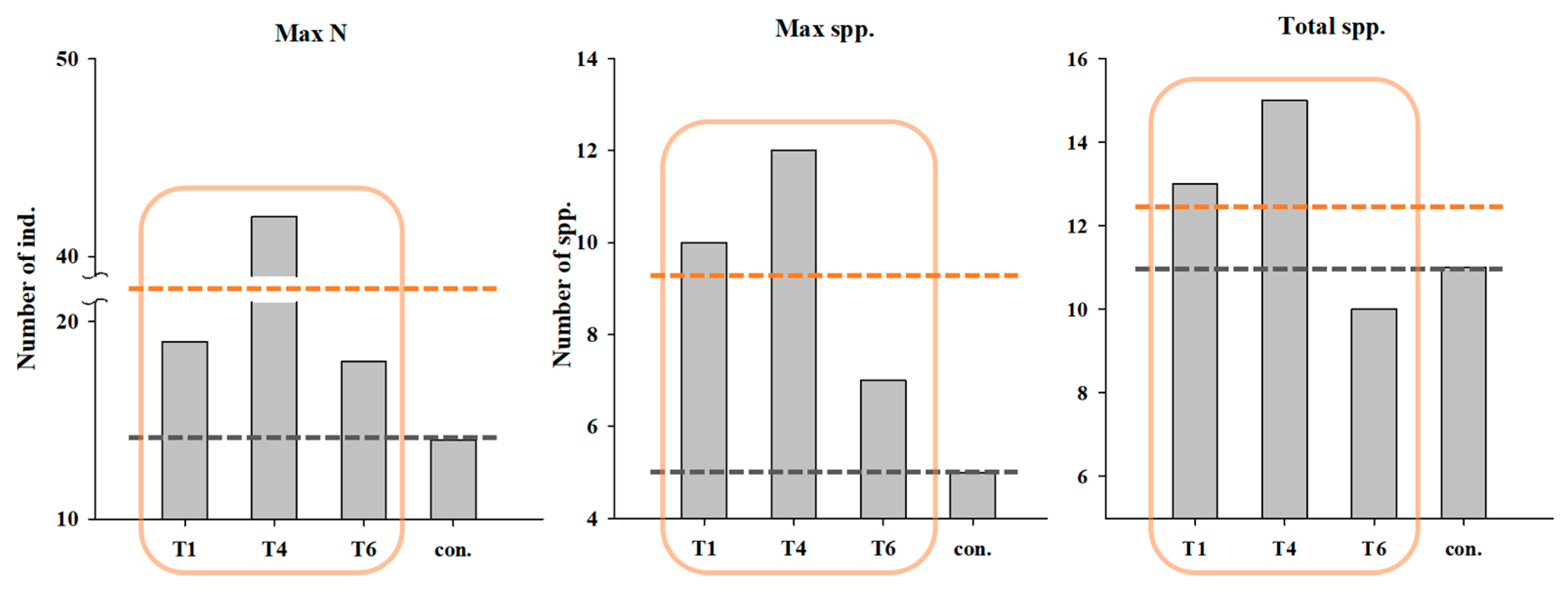 At T6, dominant species were H. poecilopterus, H. tenuispinis, P. sieboldi, and S. marmoratus; mean TL (range) was 147.42 ± 25.86 (82–192), 107.20 ± 22.33 (71–200), 150.33 ± 26.24 (93–227), and 230.20 ± 27.79 (195–268) mm, respectively.