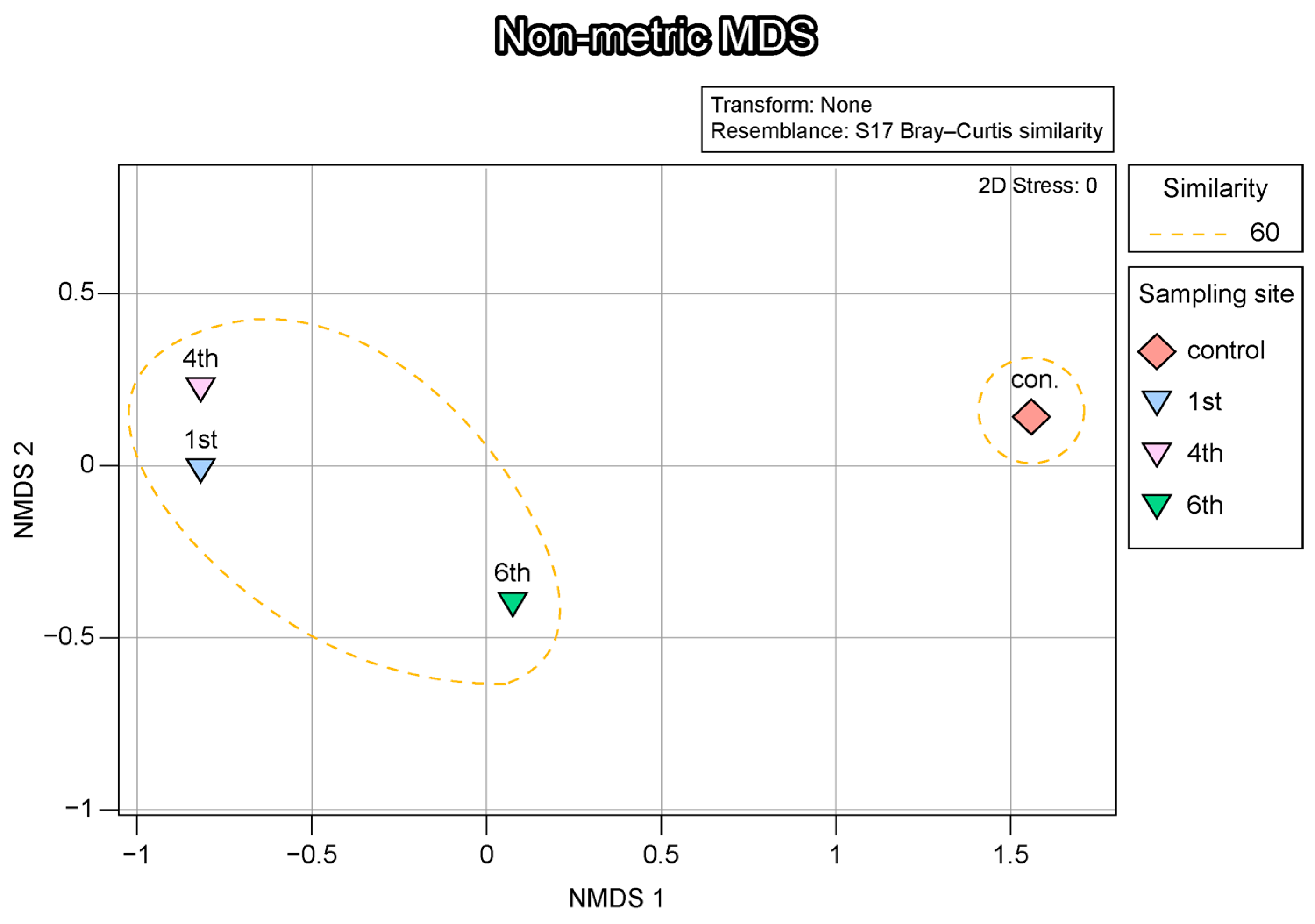 All statistical analyses were conducted using PRIMER v7 (PRIMER-e, Plymouth, UK) for multivariate procedures (Bray–Curtis similarities, nMDS, and SIMPER) and SPSS ver. 19.0 (SPSS Inc., Chicago, IL, USA) for univariate tests (Levene’s test: car package; Welch’s t-test: stats).