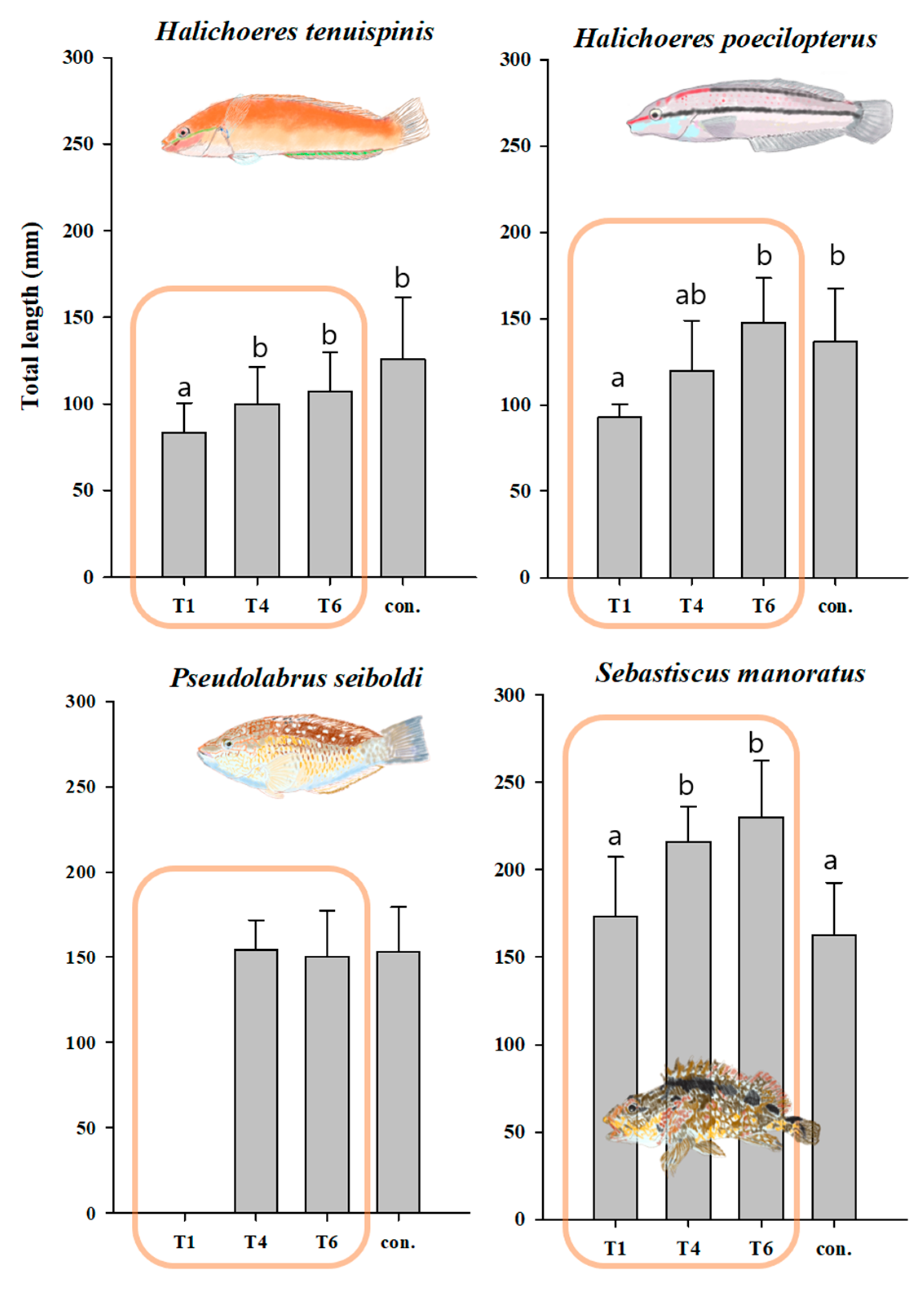 At the control site, dominant species were M. strigatus, S. marmoratus, P. sieboldi, and P. eoethinus; mean TL (range) was 97.92 ± 16.37 (70–155), 162.75 ± 29.06 (87–219), 153.16 ± 25.43 (116–239), and 138.84 ± 27.77 (87–219) mm, respectively (Figure 4).