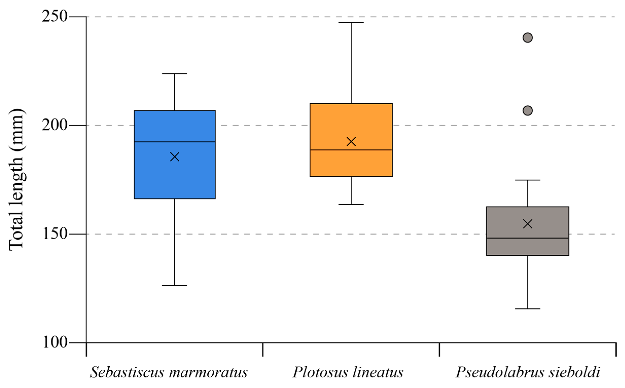 Figure 5. Total length (TL) distributions of the three dominant fish species collected by traps at the Tamra Offshore Wind Farm. Boxplots show TL (mm) for S. marmoratus (n = 59), P. lineatus (n = 35), and P. sieboldi (n = 19). The central line indicates the median, boxes represent the interquartile range (25th–75th percentiles), whiskers extend to 1.5 × IQR, and points denote outliers.