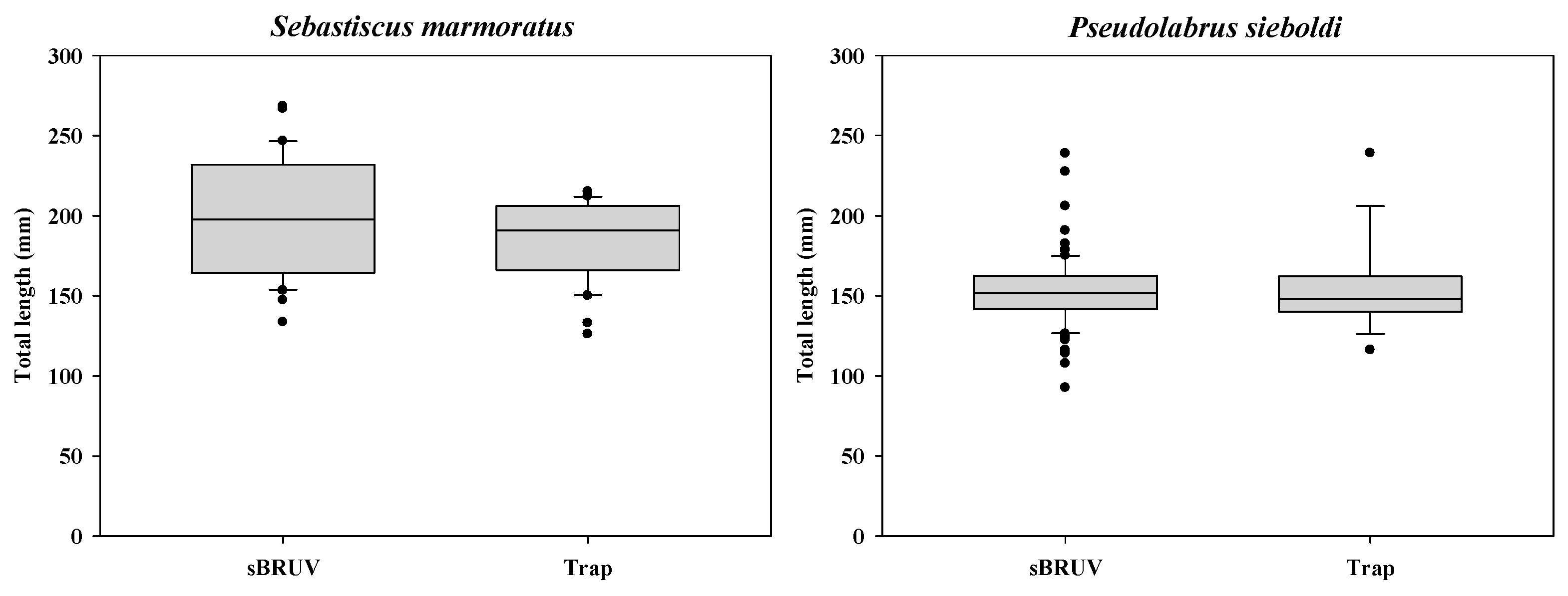 A key advantage of sBRUV is its capacity to generate stereo-based length measurements. In this study, TL distributions derived from sBRUV did not differ from those measured from trap-captured specimens for S. marmoratus and P. sieboldi. Although S. marmoratus showed heterogeneous variance between methods, mean TL differences were near zero and effect sizes were essentially zero for both species (Hedges’ g ≈ 0), indicating negligible systematic bias in stereo-derived TL under the sampling conditions applied here. This supports the use of sBRUV-derived TL as body-size data for describing size structure and for station-level comparisons in the present study, while acknowledging that video- and trap-derived datasets represent independent samples and may differ in selectivity for particular size classes.