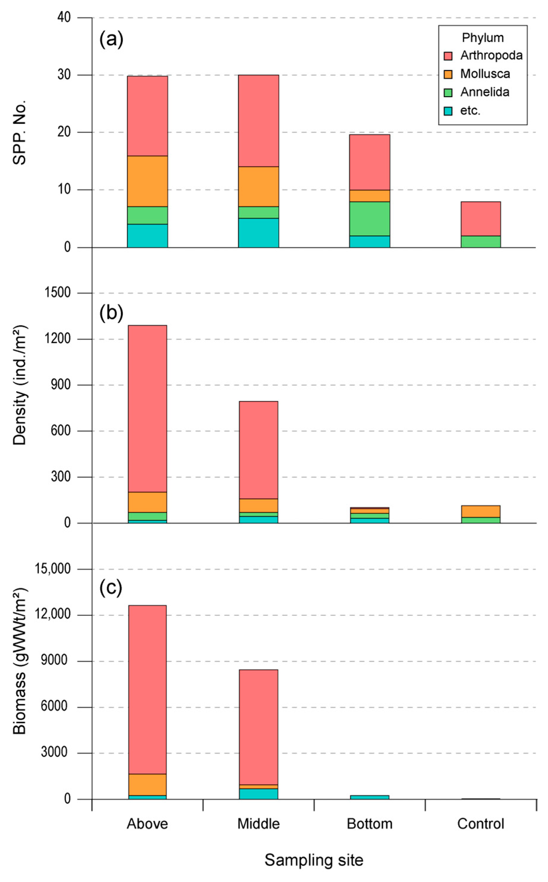 Community density (individuals m−2) was dominated by arthropods. Across all samples, Arthropoda accounted for the majority of individuals (552 ind. m−2; 77.9%), followed by Mollusca (86 ind. m−2; 12.8%), Polychaeta (37 ind. m−2; 5.6%), and other groups (23 ind. m−2; 3.8%). Total epifaunal density by sampling point ranged from 66 ind. m−2 to 1940 ind. m−2 (mean 670 ind. m−2), with densities tending to be higher at the upper and middle levels than at the bottom level and the control site.