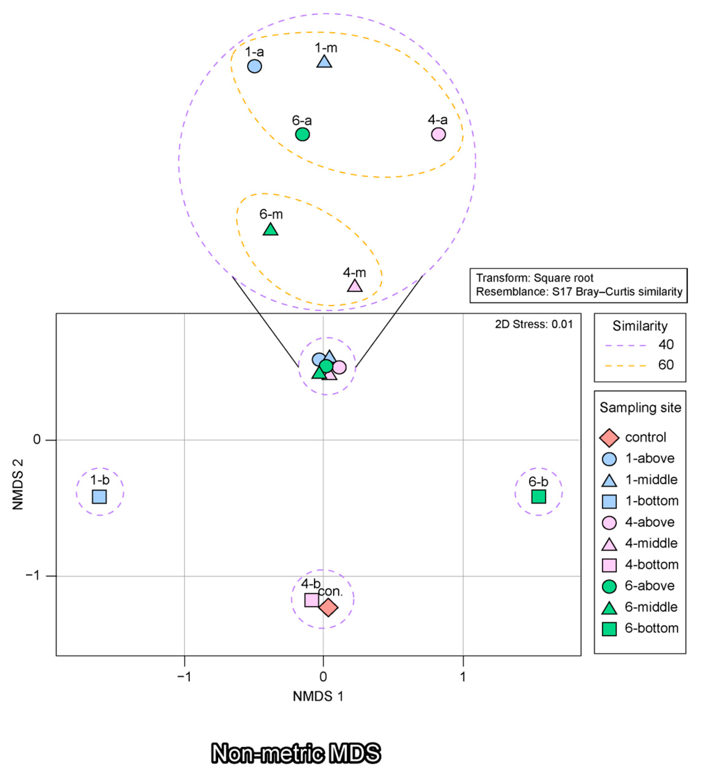 Figure 8. Epifauna community similarity (nMDS). Non-metric multidimensional scaling (nMDS) ordination of epifaunal assemblages based on square-root-transformed abundance data using Bray–Curtis similarity. Points represent individual samples from turbines 1, 4, and 6 across depth strata (upper: 2–5 m; middle: 8–10 m; bottom: ~20 m), with the control site included for comparison. Grouping at the 40% similarity level is indicated in the plot.