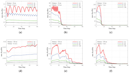 Maximum adjacent pressure difference (max ) curves of the artificial lateral line sensor array under different conditions: (a) Distance = 10 cm, m/s; (b) Distance = 10 cm, m/s; (c) Distance = 10 cm, m/s; (d) Distance = 100 cm, m/s; (e) Distance = 100 cm, m/s; (f) Distance = 100 cm, m/s.