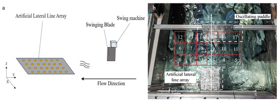 Figure 10a,b illustrate the experimental configuration and coordinate system for the perception tests. The artificial lateral line array is installed horizontally at a depth of below the water surface. As defined in the schematic, the coordinate origin is located at the center of the array’s trailing edge, with the longitudinal axis (Y-axis) aligned parallel to the flow direction. The excitation source, comprising a reciprocating motor and a partially submerged blade, is positioned upstream to generate hydrodynamic disturbances that propagate toward the sensing nodes.
