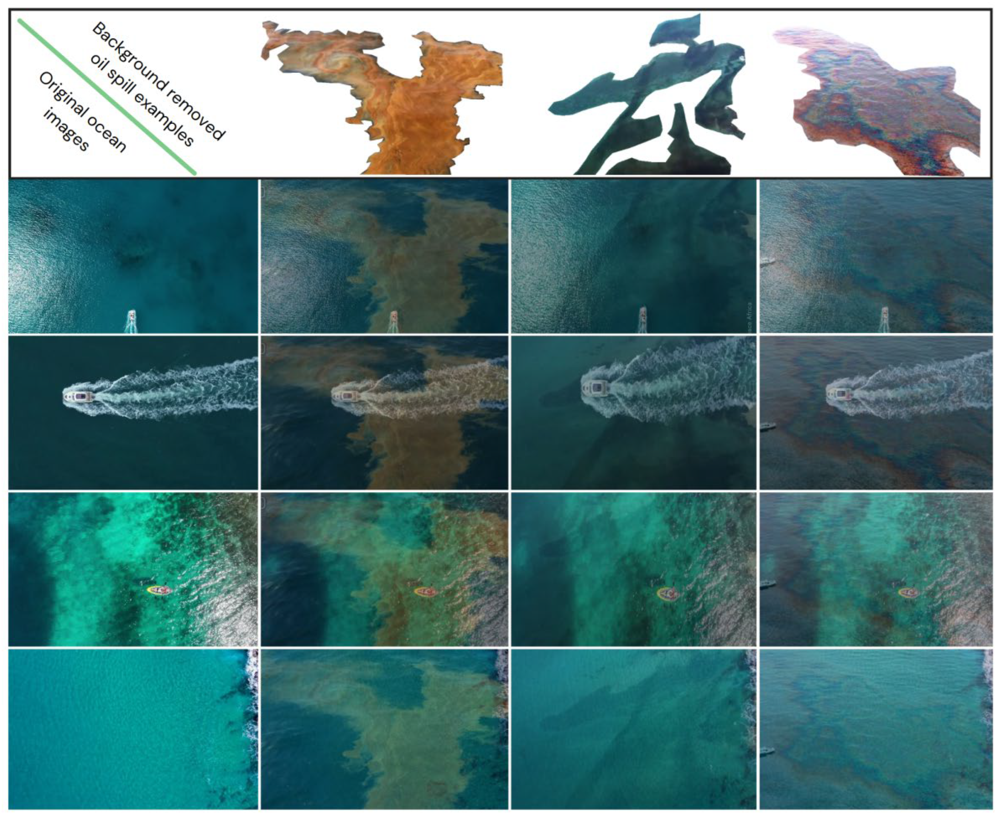 - Akhmedov, F.; Khujamatov, H.; Abdullaev, M.; Jeon, H.-S. A Novel Oil Spill Dataset Augmentation Framework Using Object Extraction and Image Blending Techniques. Remote Sens. 2025, 17, 336. [Google Scholar] [CrossRef]