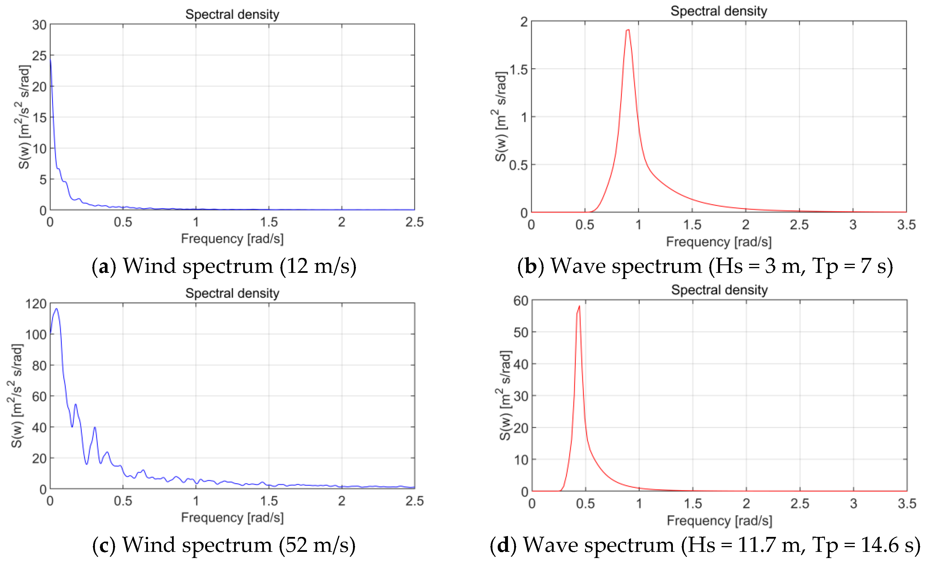 Wind spectra and wave spectra for operational and extreme conditions.
