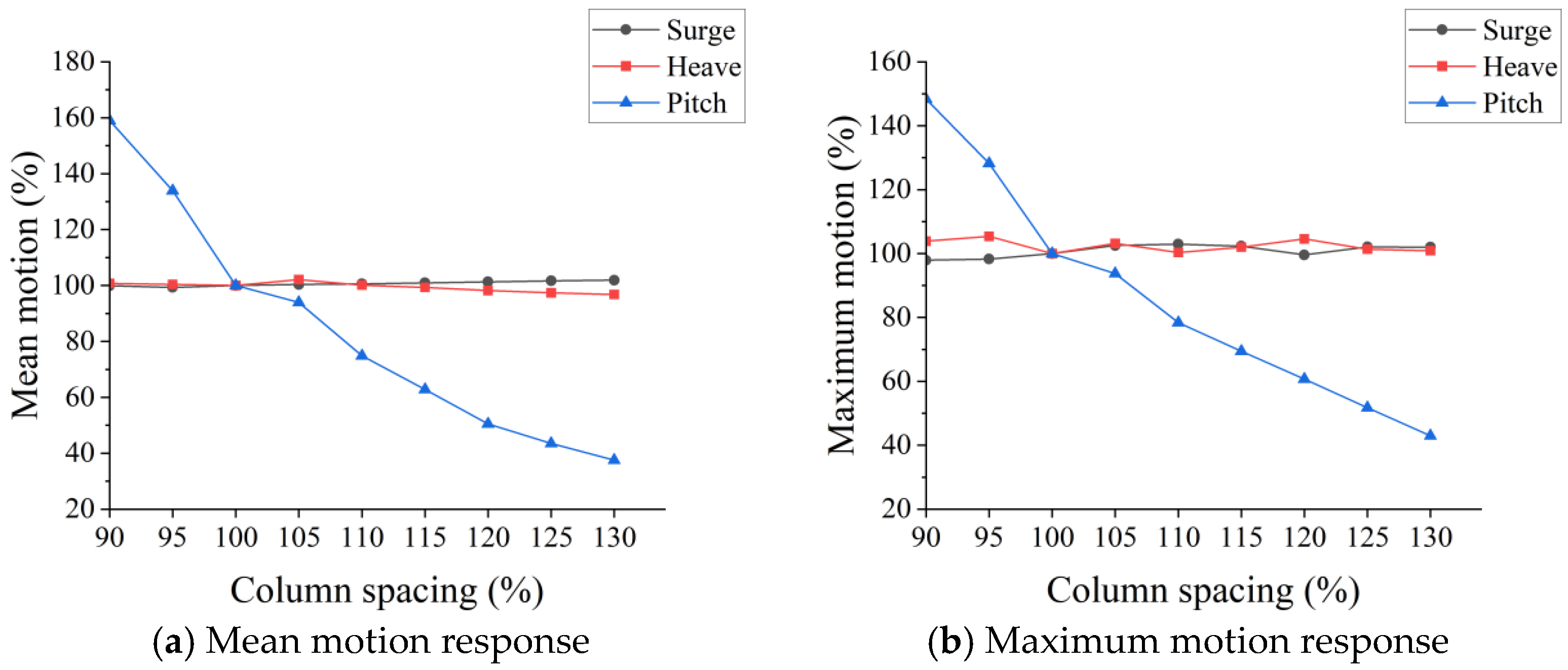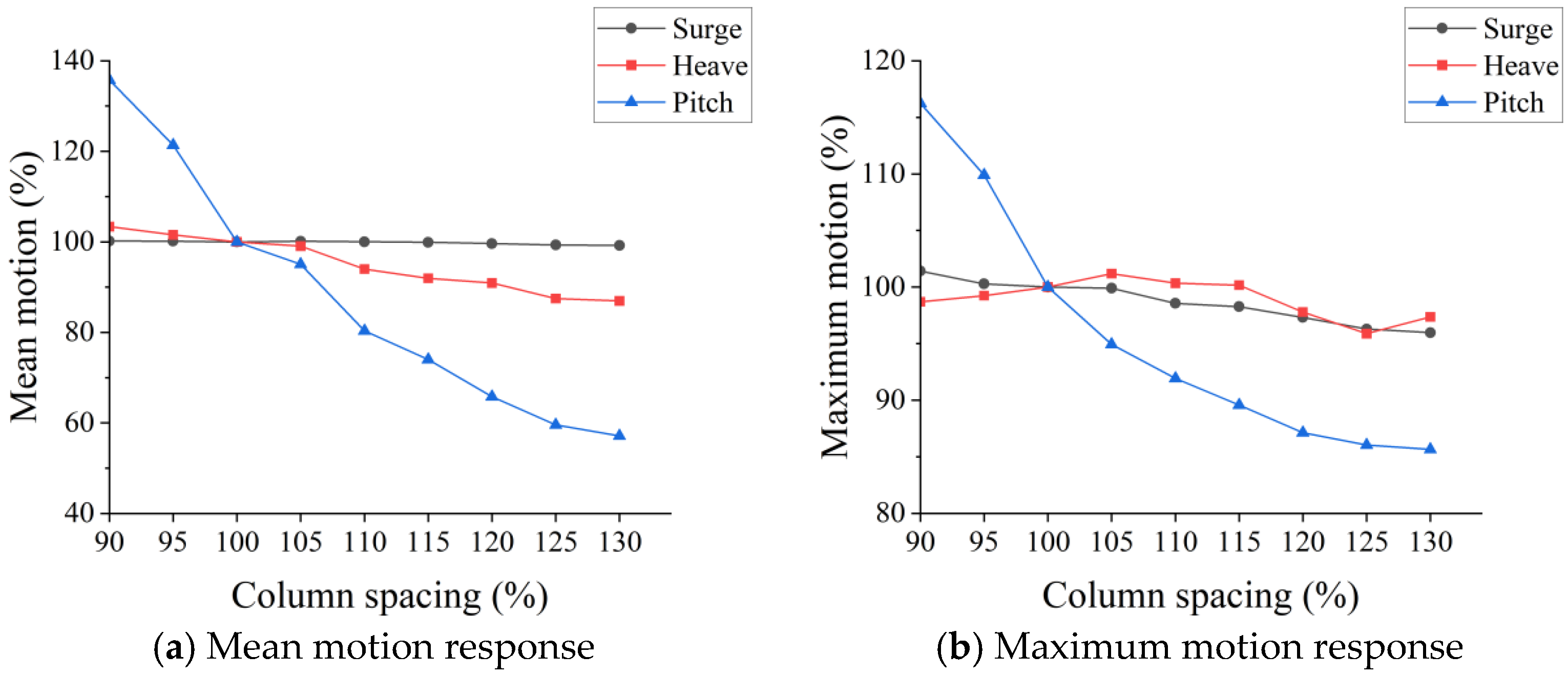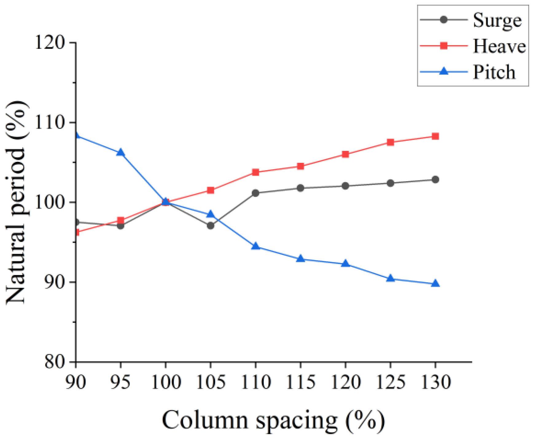| Column Spacing | Surge Natural Period (s) | Heave Natural Period (s) | Pitch Natural Period (s) |