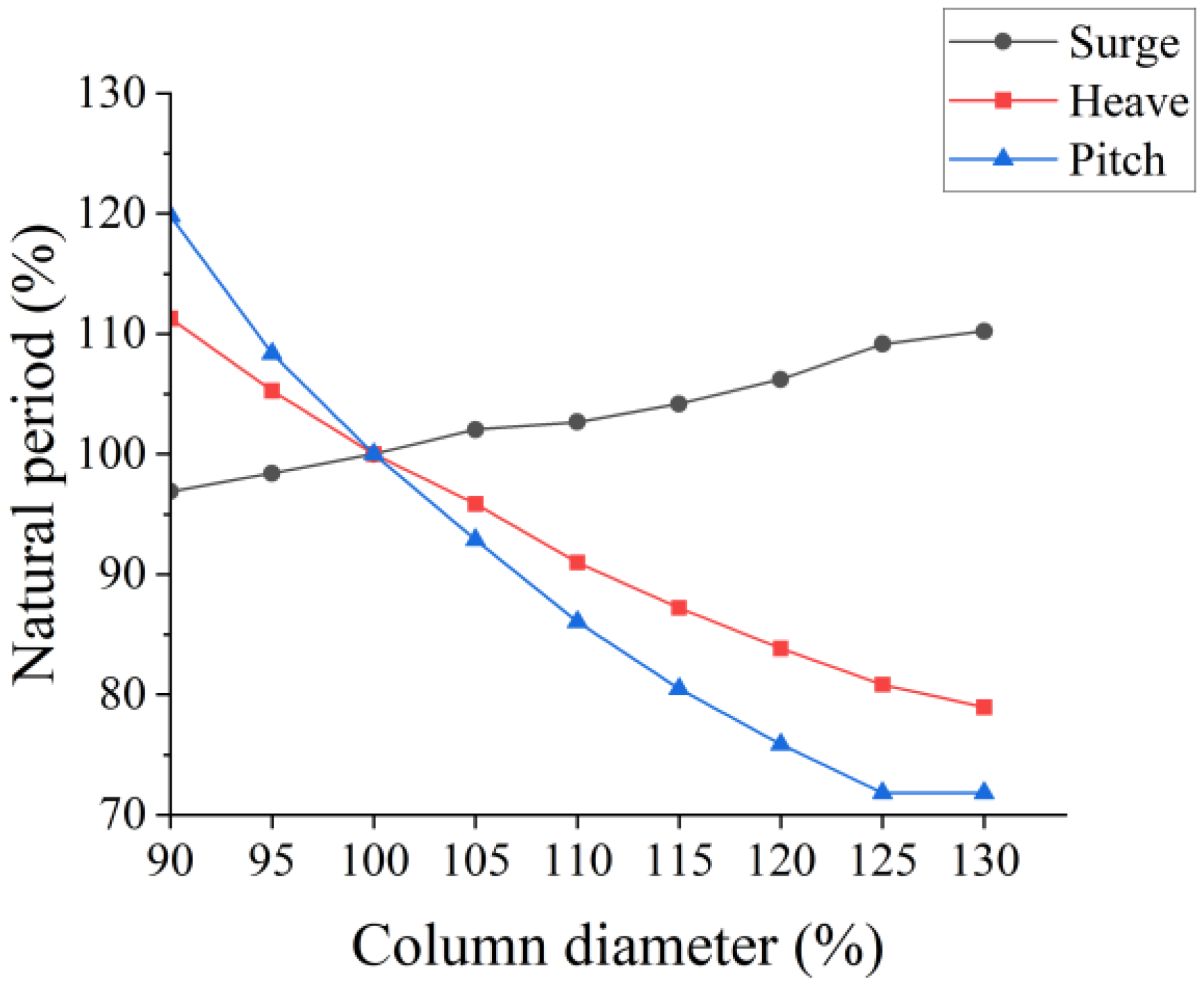 | Column Diameter | Surge Natural Period (s) | Heave Natural Period (s) | Pitch Natural Period (s) |