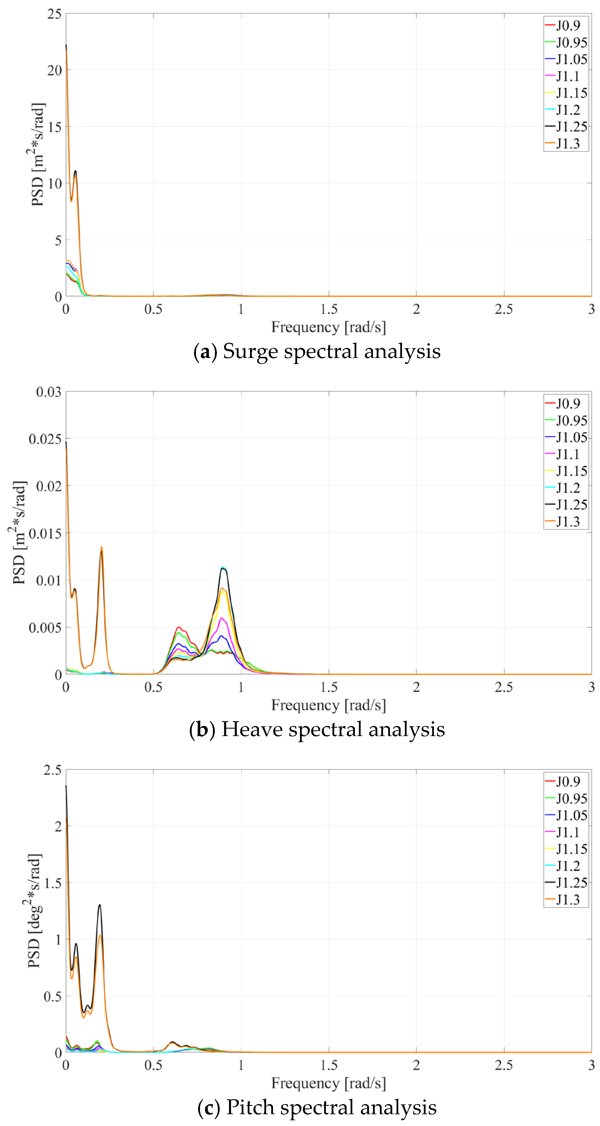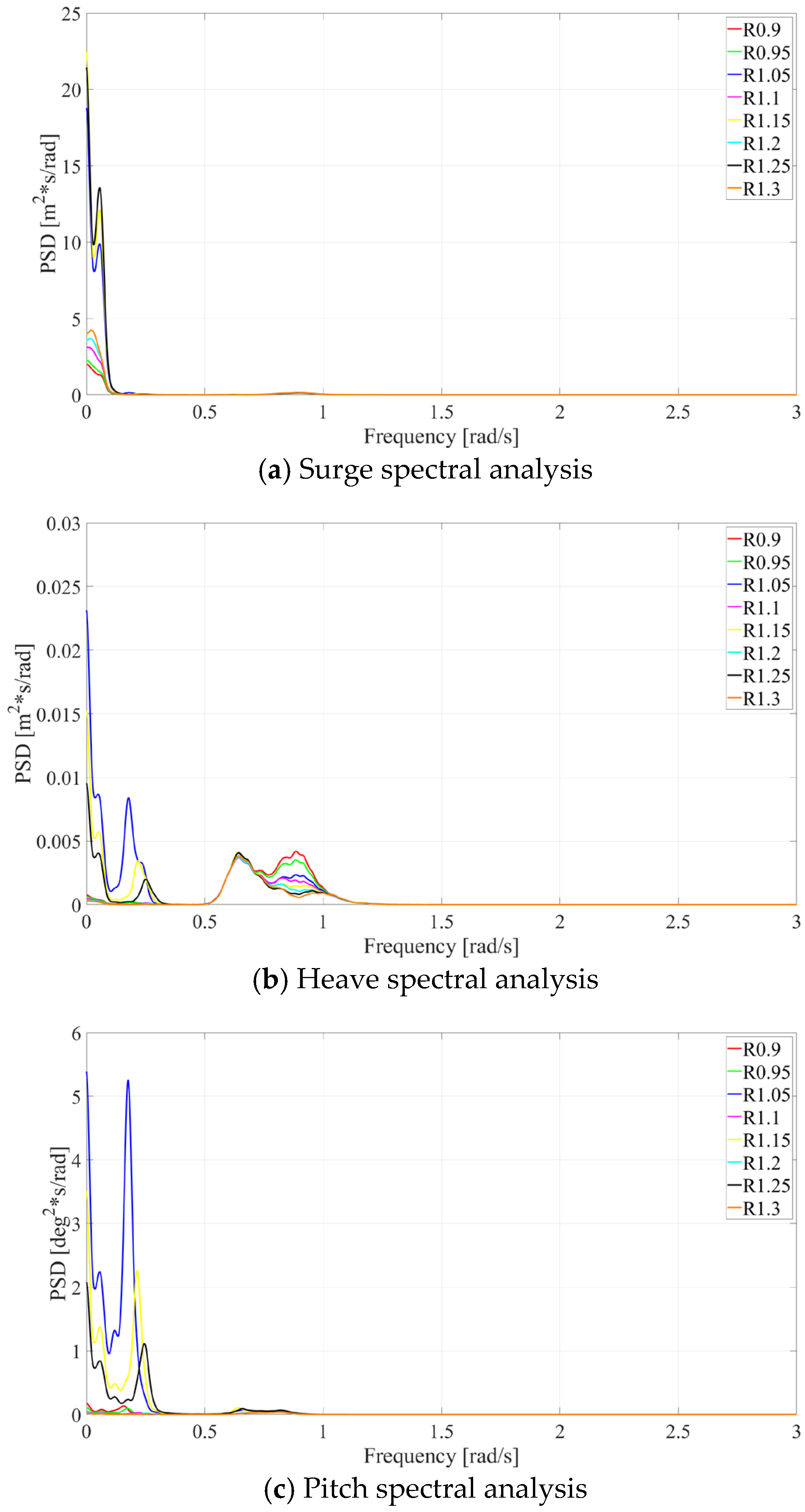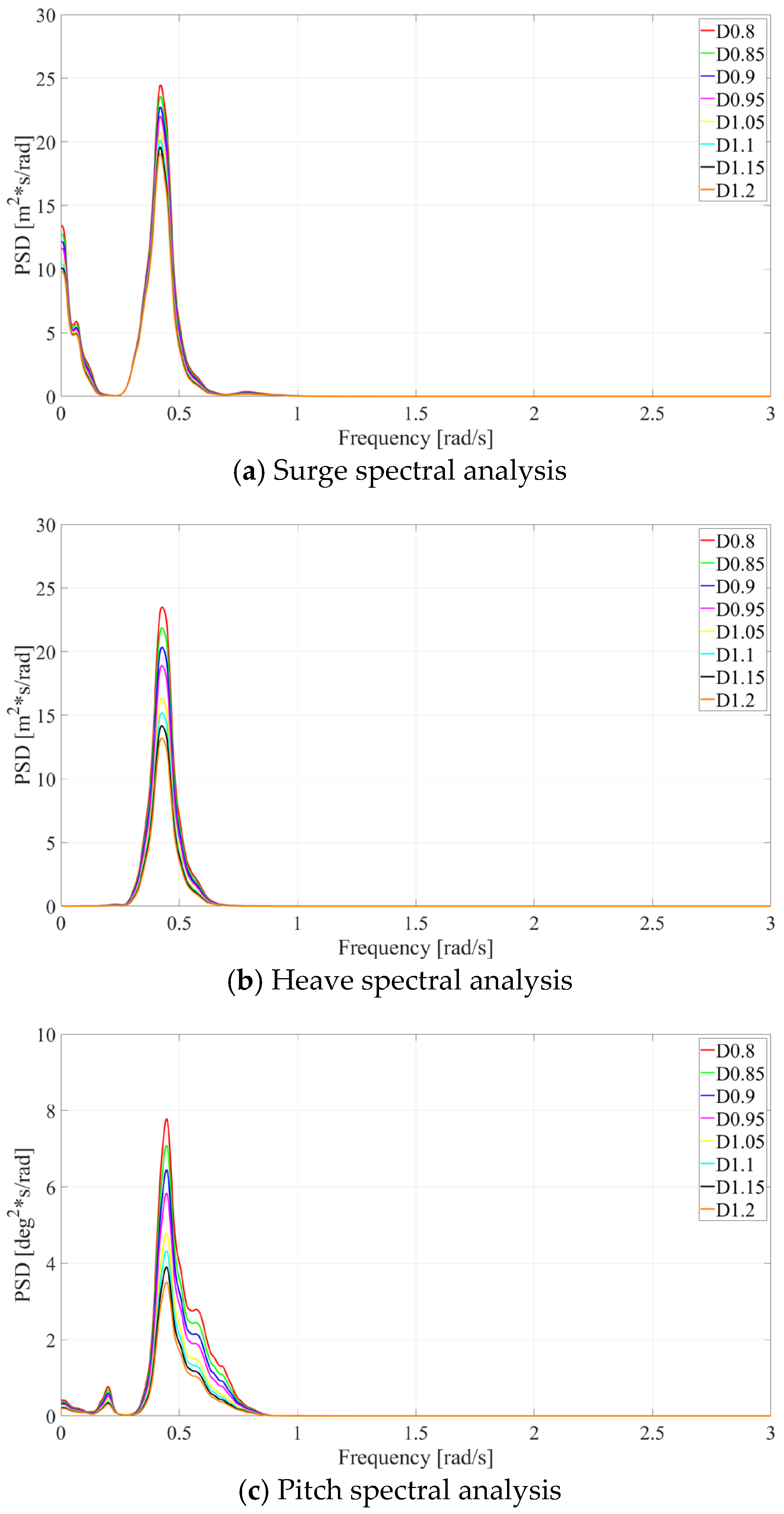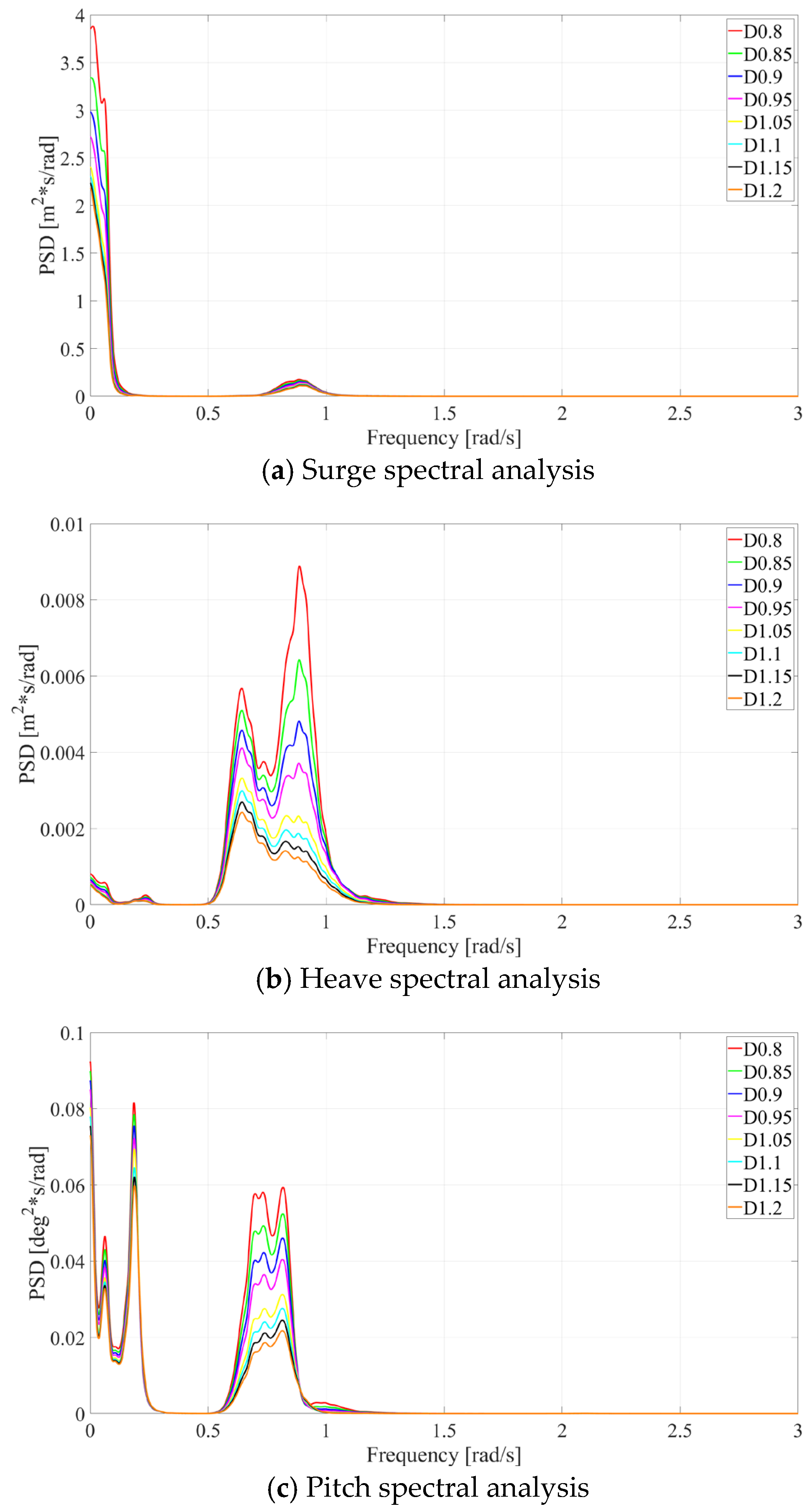 Motion response spectral analysis for different drafts under operational conditions.
