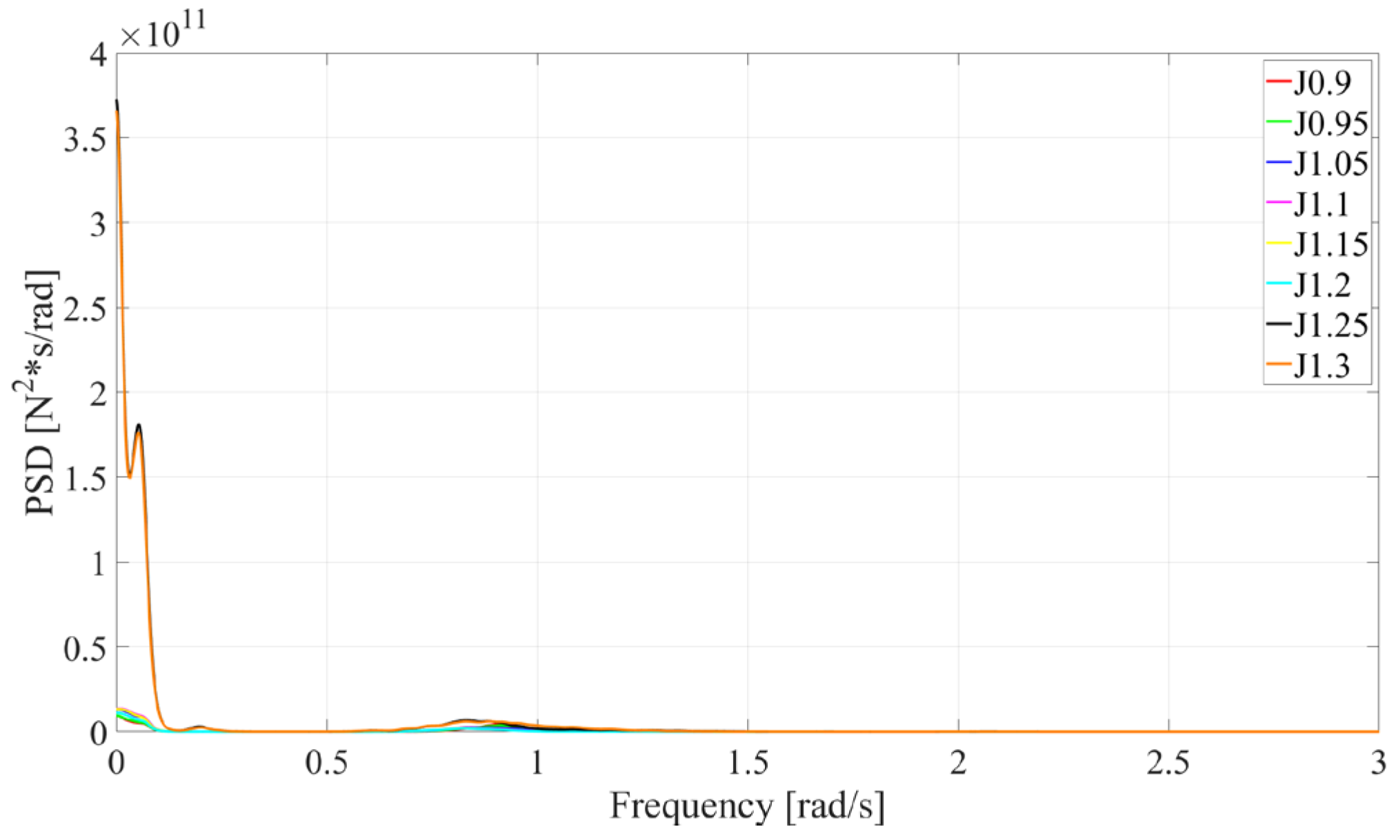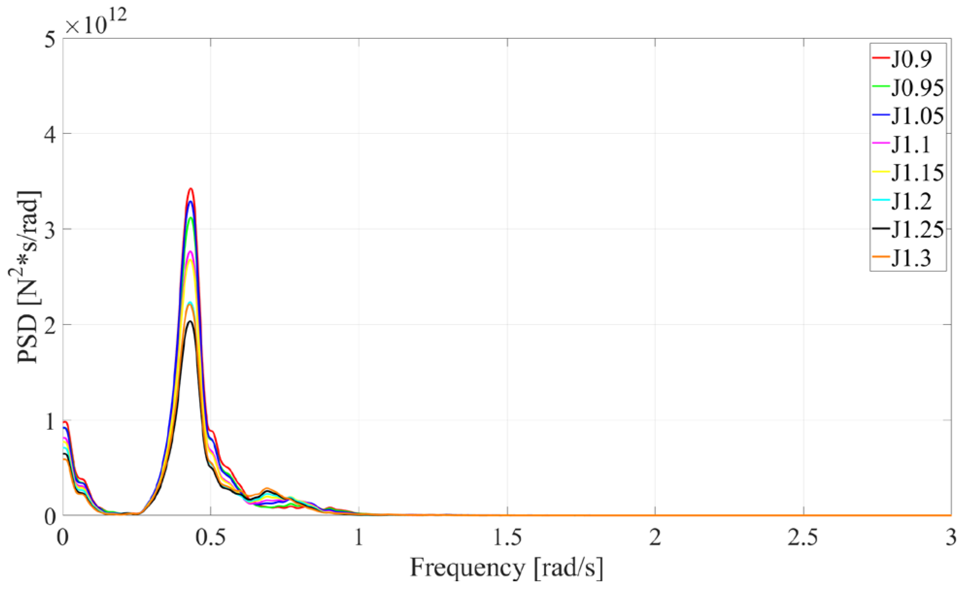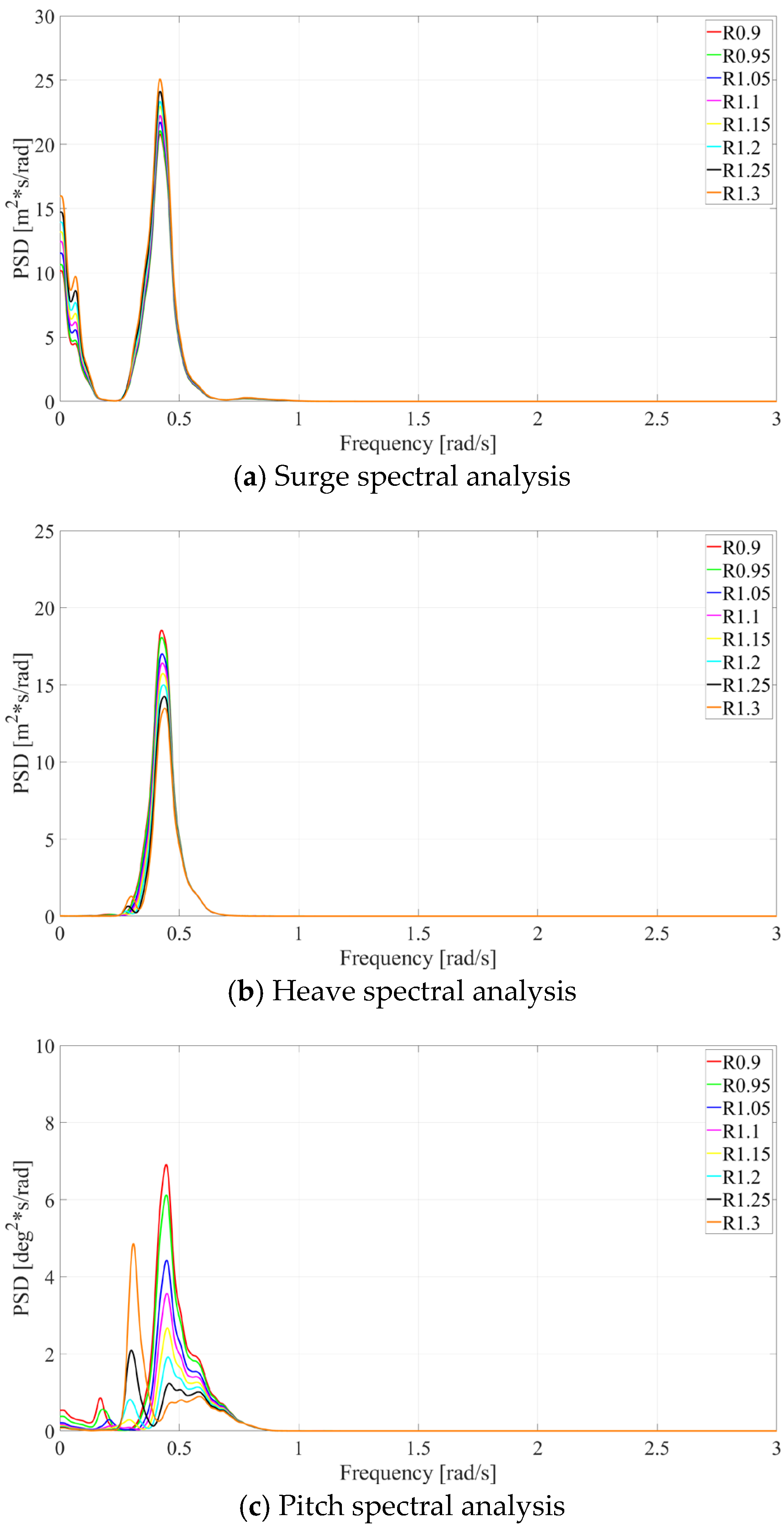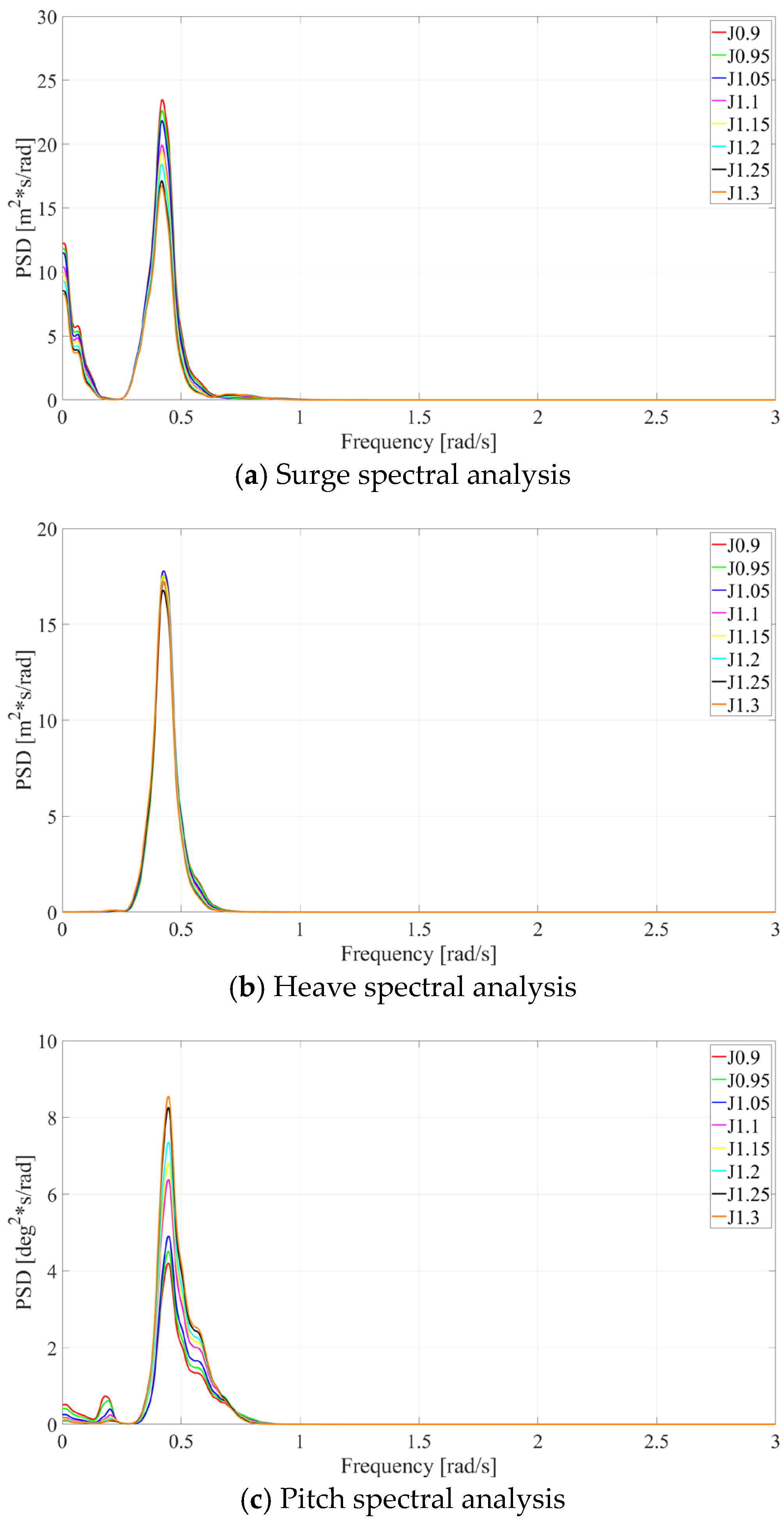 Motion response spectral analysis for different drafts under operational conditions.