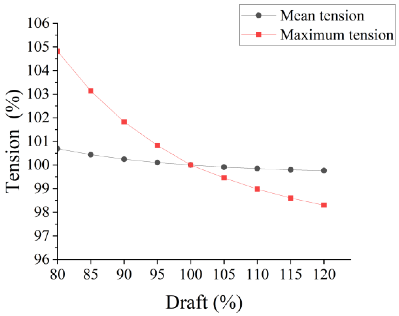 Tension values of mooring line 2-2 for different drafts under operational conditions.