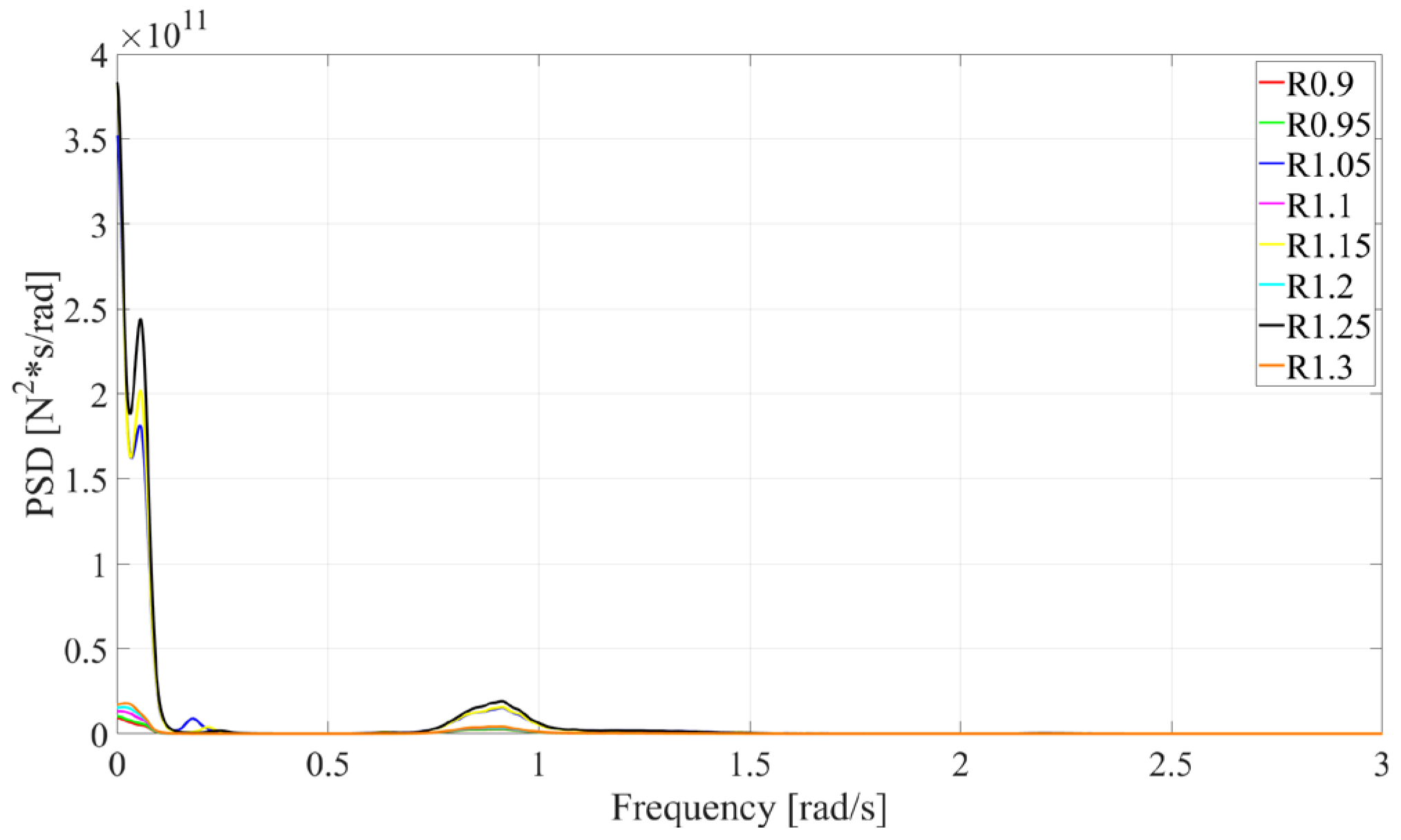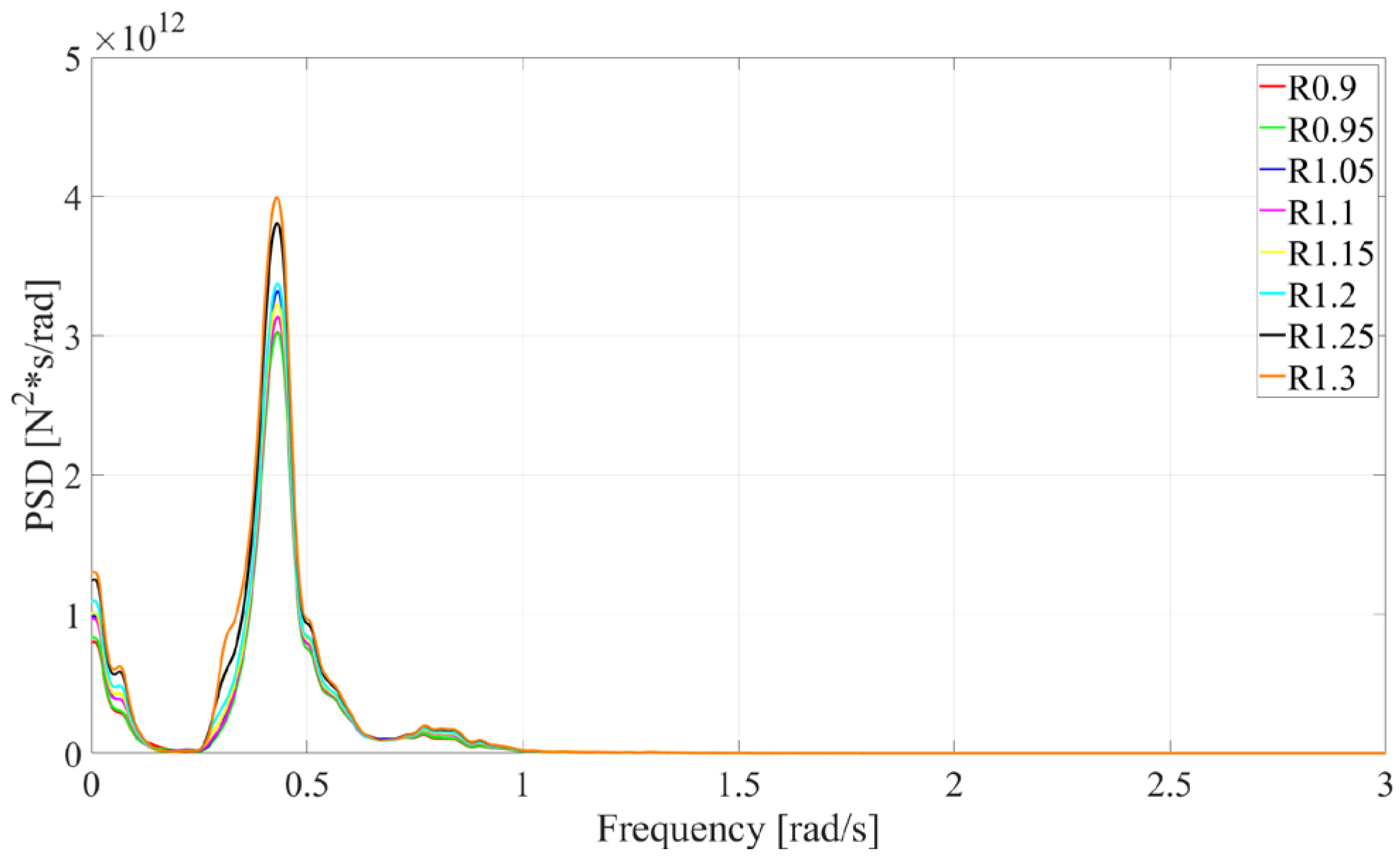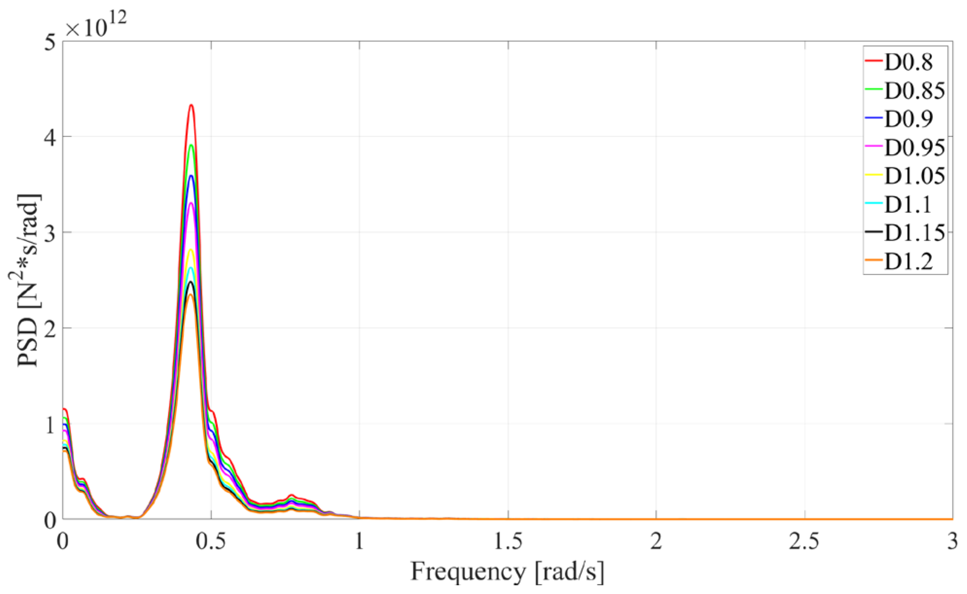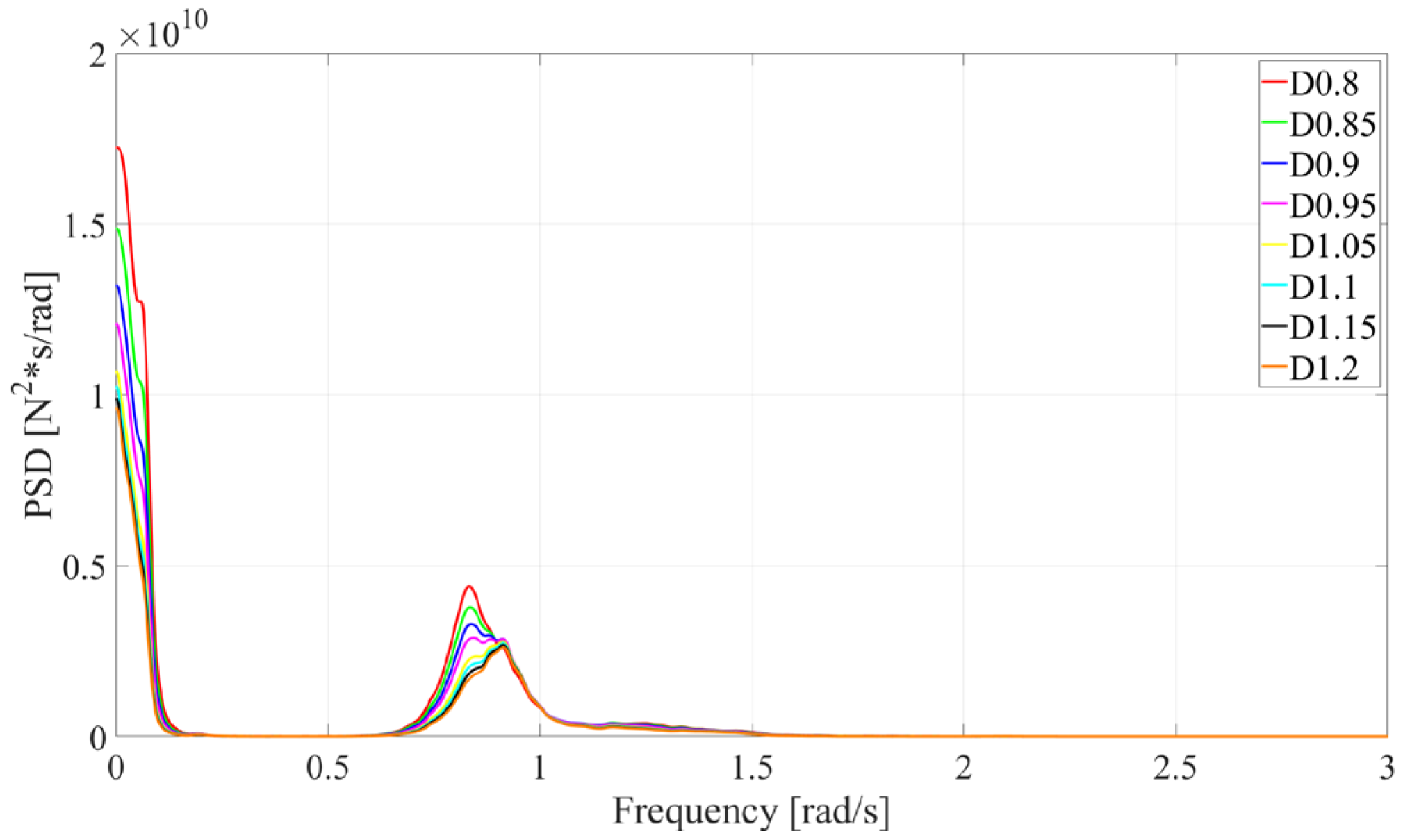 Motion response spectral analysis for different column diameters under operational conditions.