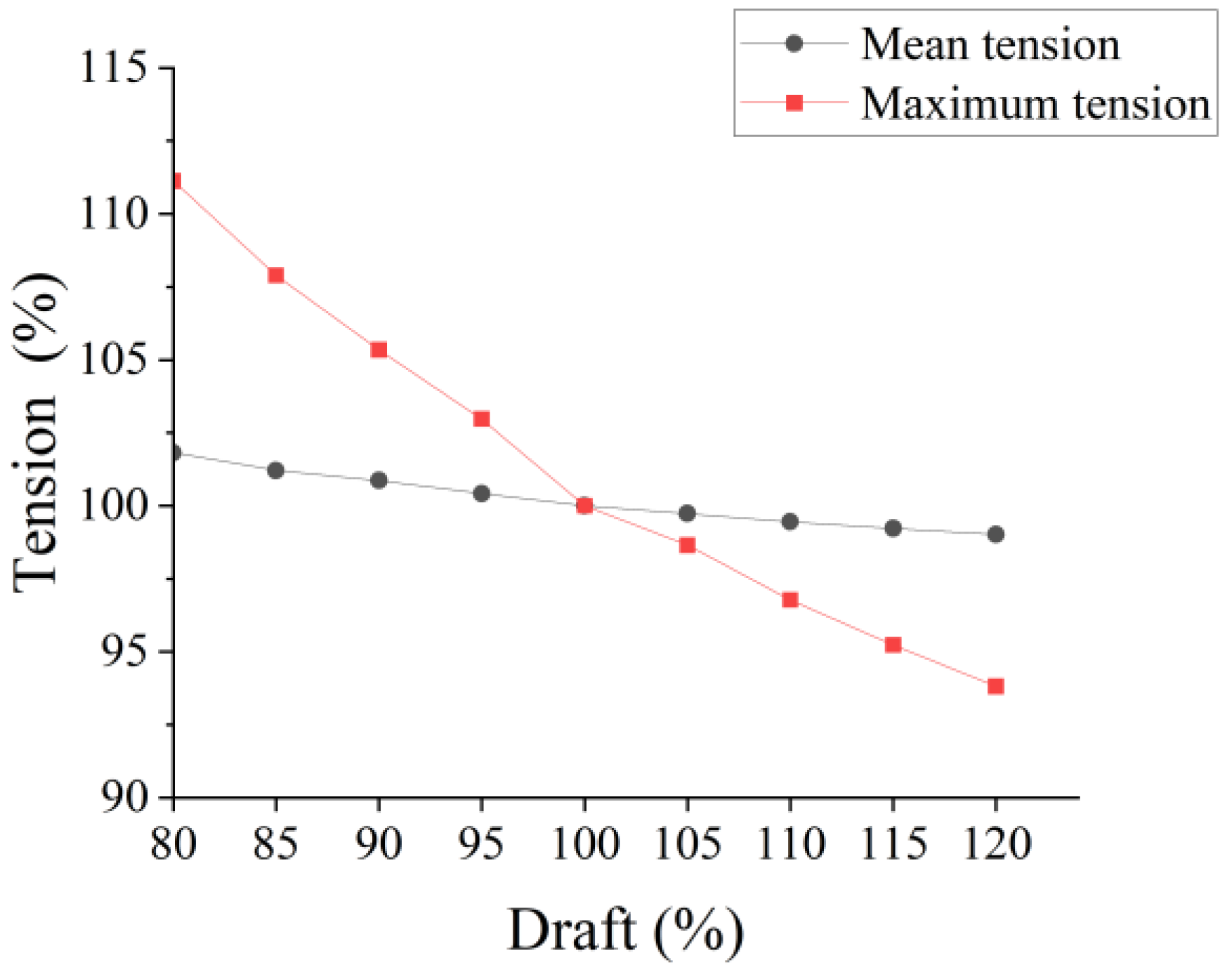 Tension values of mooring line 2-2 for different drafts under extreme conditions.
