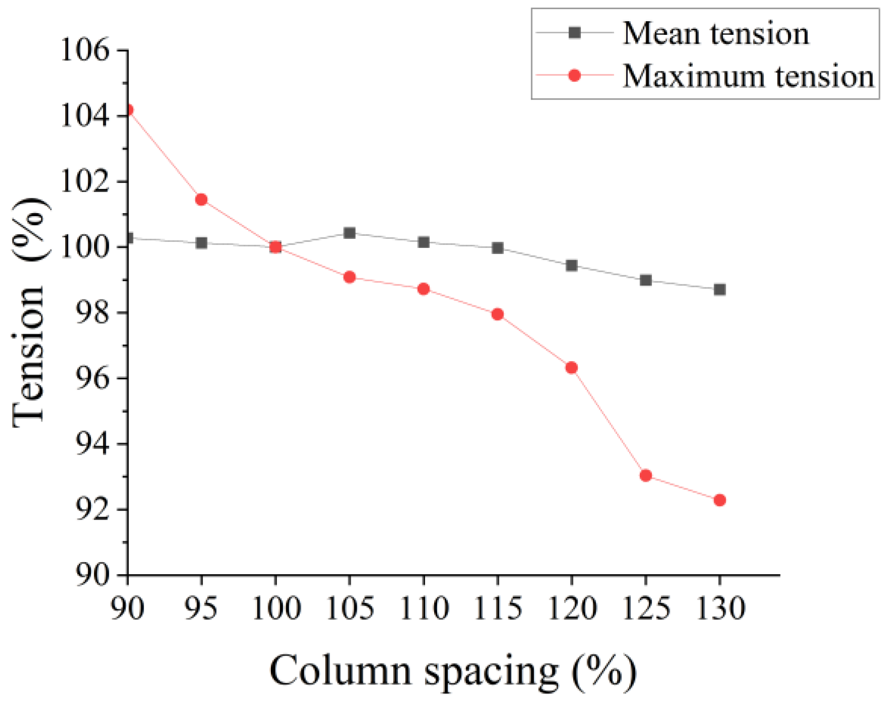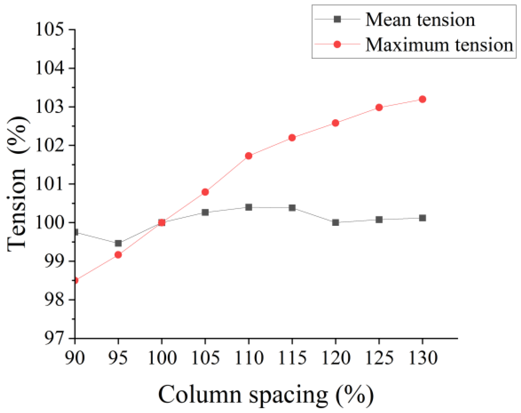 Tension values of mooring line 2-2 for different column spacings under extreme conditions.
