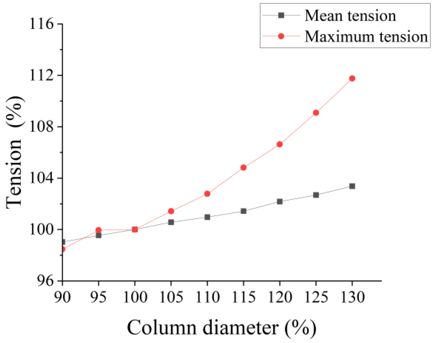 Tension values of mooring line 2-2 for different column diameters under extreme conditions.