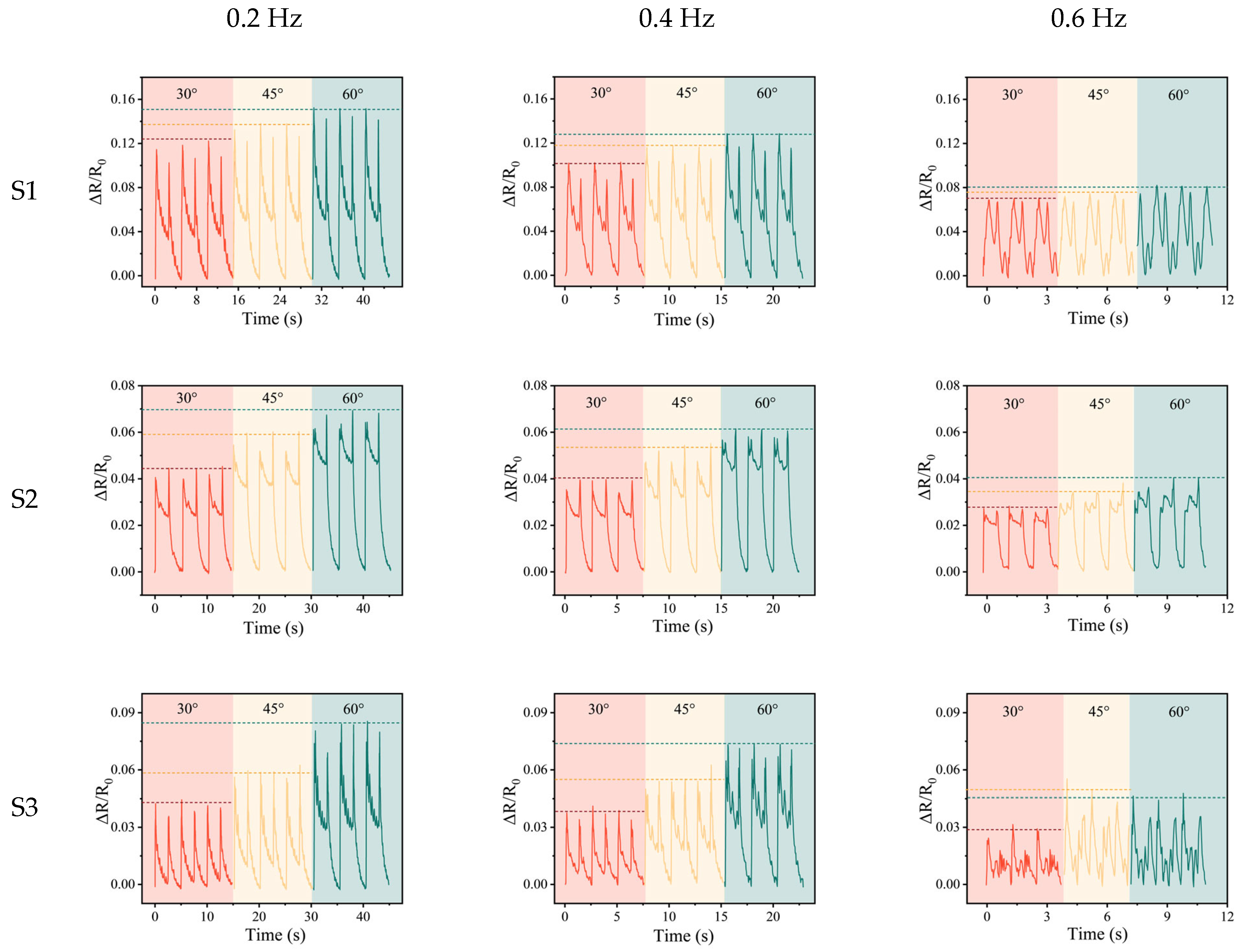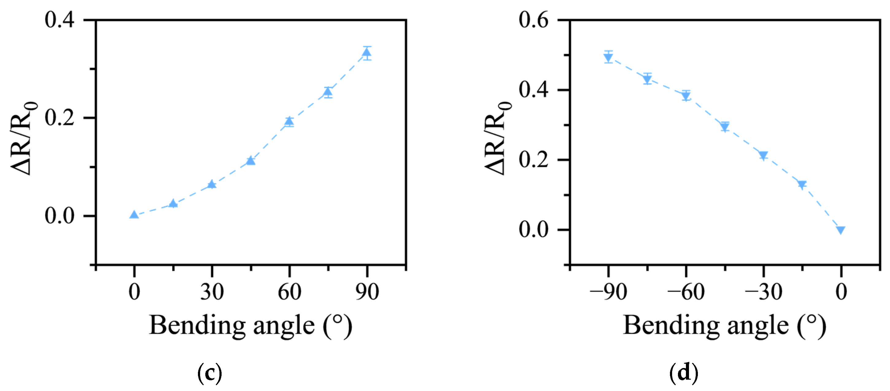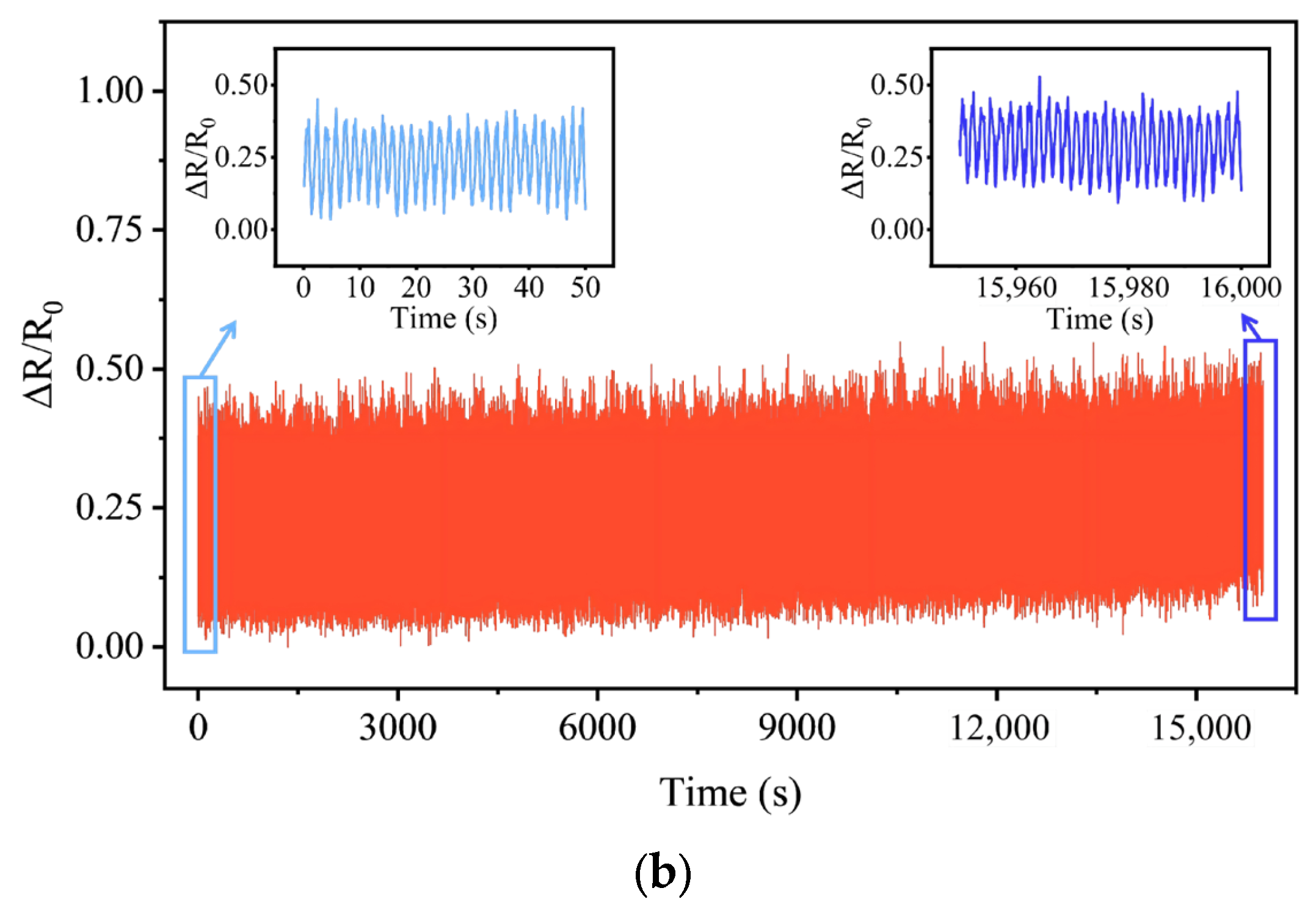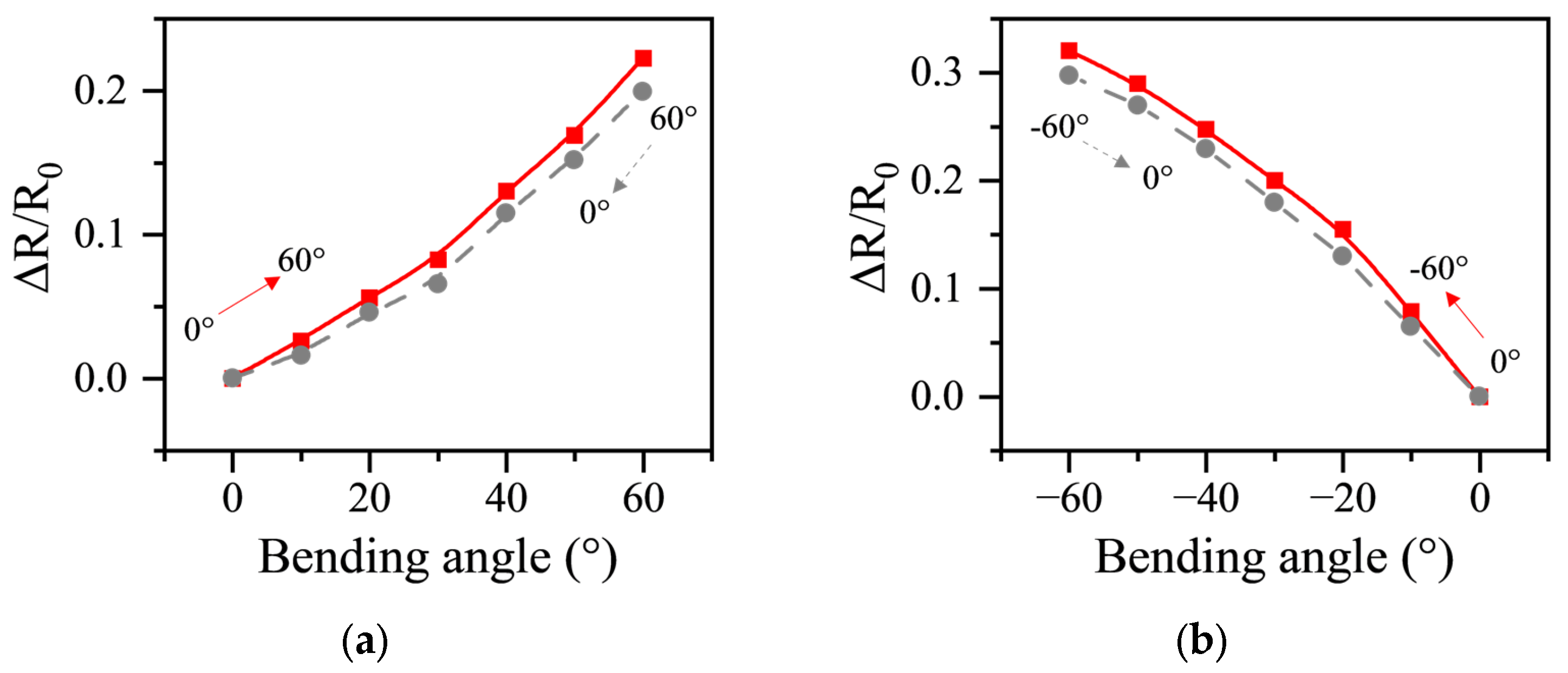 2.5.4. Cyclic Stability and Hysteresis Characterization of the Flexible Sensor Film