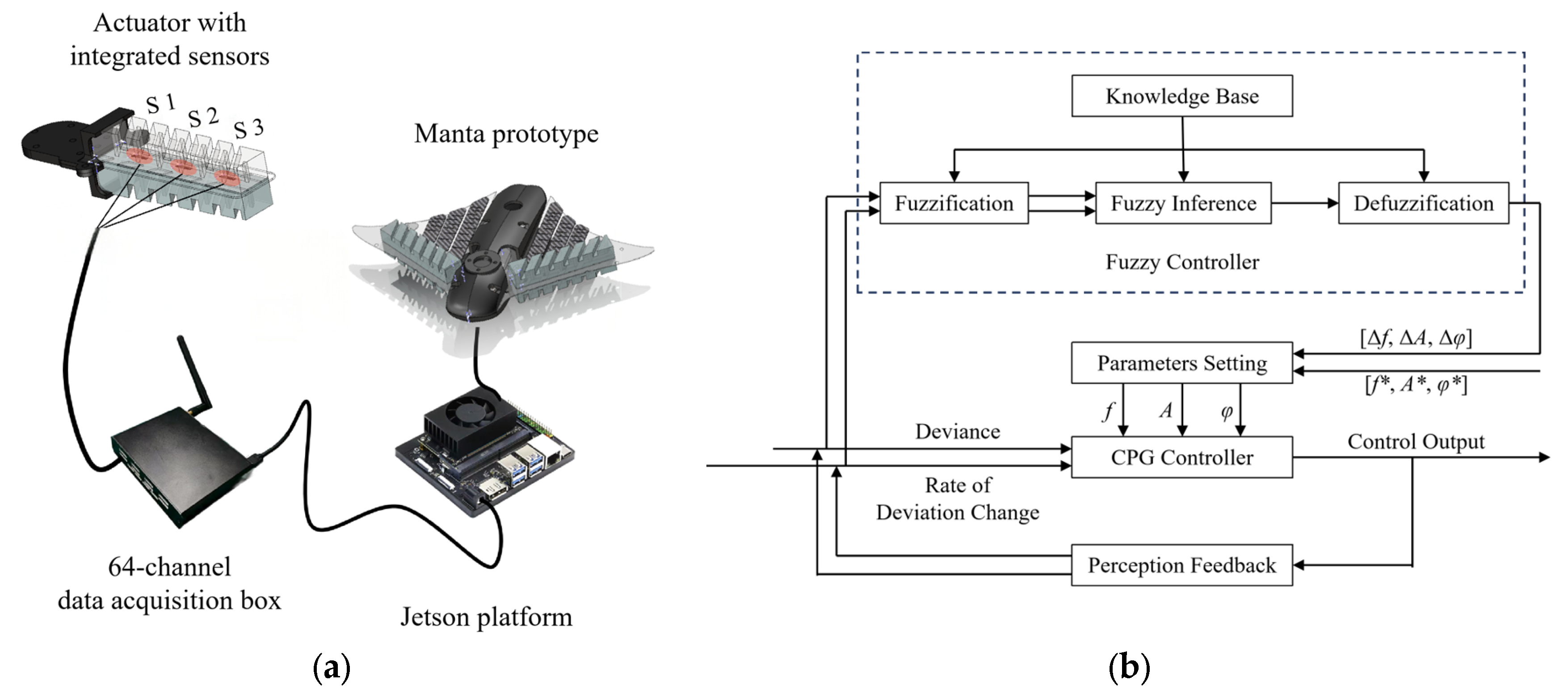 - Hao, Y.; Cao, Y.; Cao, Y.-H.; Huang, Q.; Pan, G. Course control of a manta robot based on amplitude and phase differences. J. Mar. Sci. Eng. 2022, 10, 285. [Google Scholar] [CrossRef]