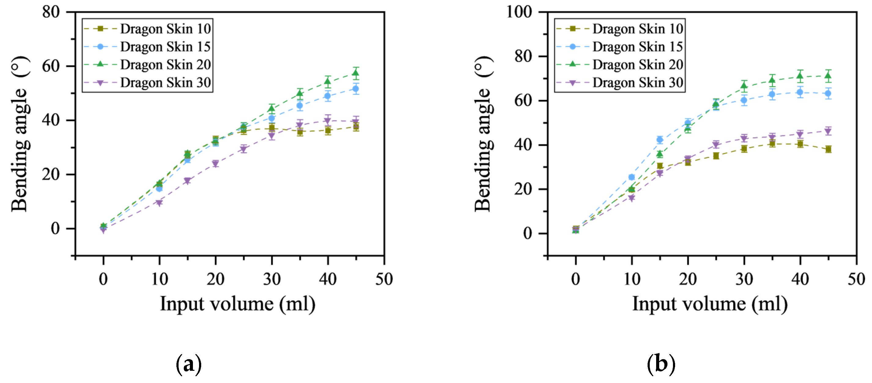 - Material optimization: Through systematic evaluation of the mechanical properties of candidate silicone materials, Dragon Skin 20 was identified as the optimal material for the biomimetic muscle. It combines large deformation capability with sufficient structural strength, meeting the requirements of the pectoral fin’s flapping motion.