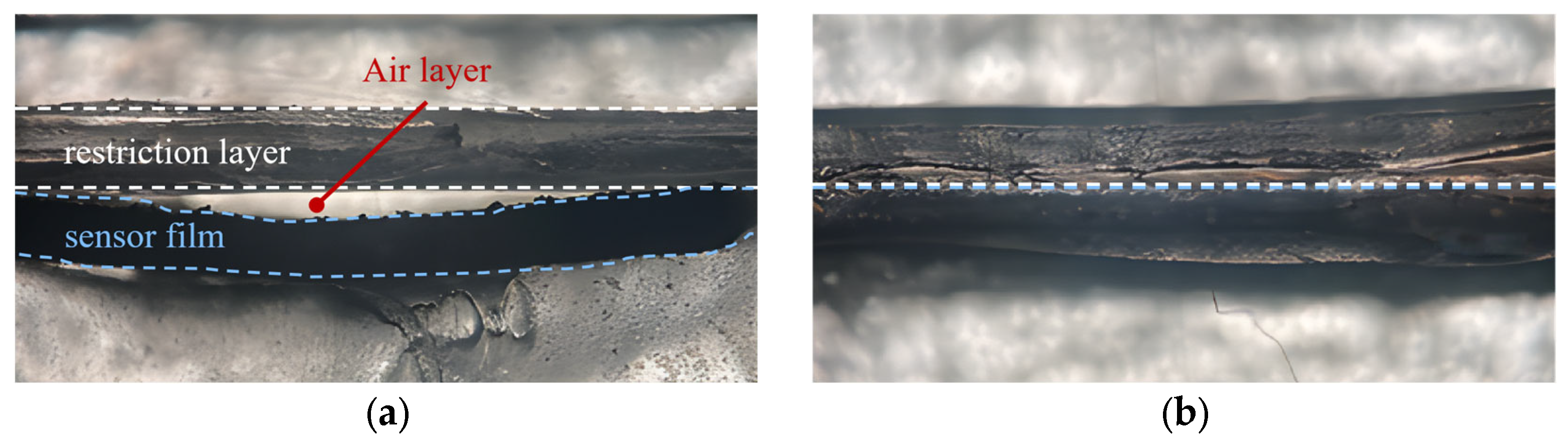 - Integration method: An embedded cast-molding method was employed to integrate the flexible sensor within the deformable restriction layer, eliminating interfacial air gaps and ensuring synchronized deformation between the sensing film and actuating muscle. Cyclic tests demonstrated that the embedded sensor maintained stable output throughout 9600 oscillation cycles.