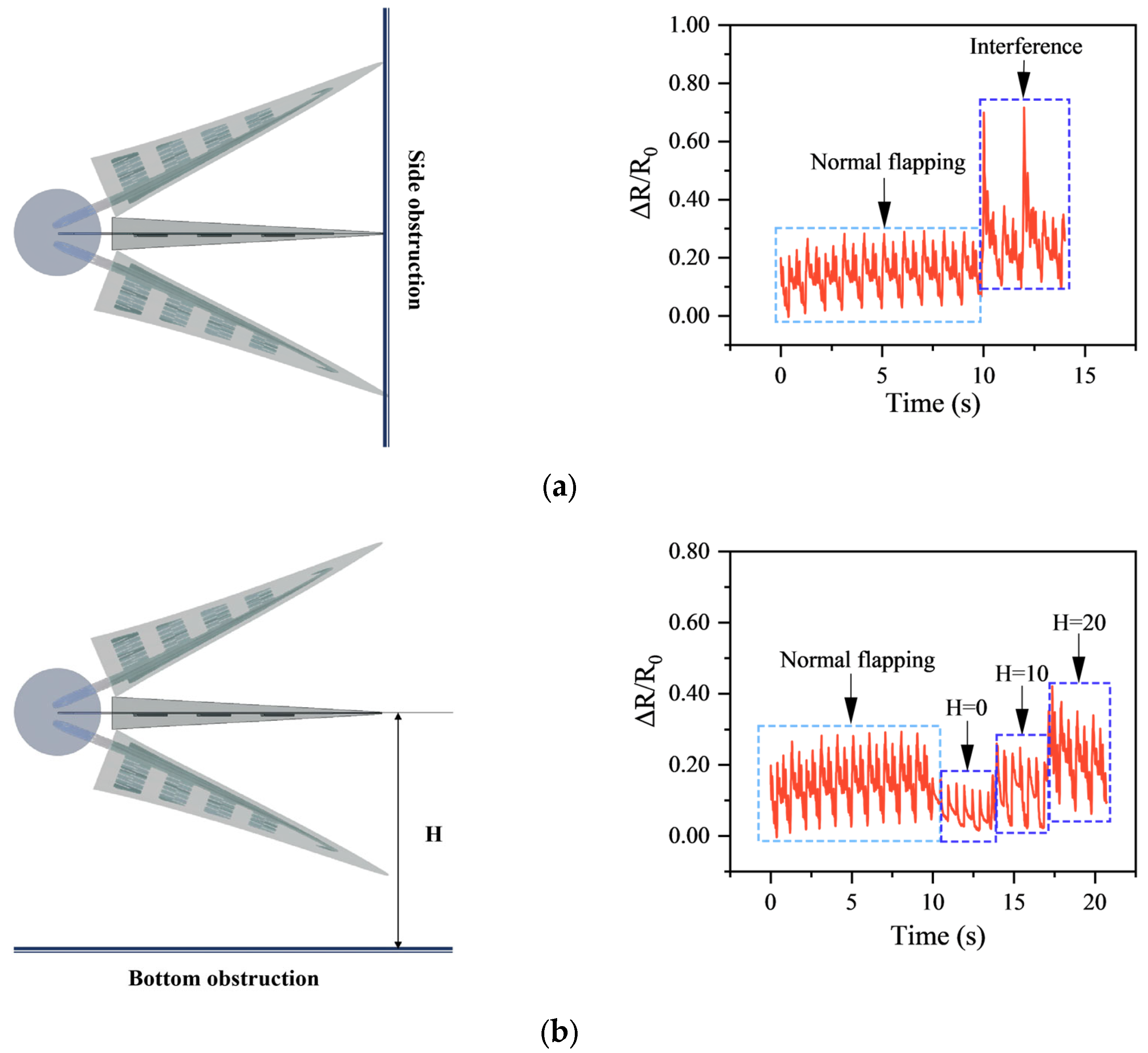 - Sensing performance: The distributed sensor array can effectively detect electrical signals generated by bending deformations of the pectoral fin caused by self-flapping or external environmental contact. By establishing a mapping relationship between electrical signal features under normal and abnormal conditions, the fin motion state as well as the external disturbances can be identified.
