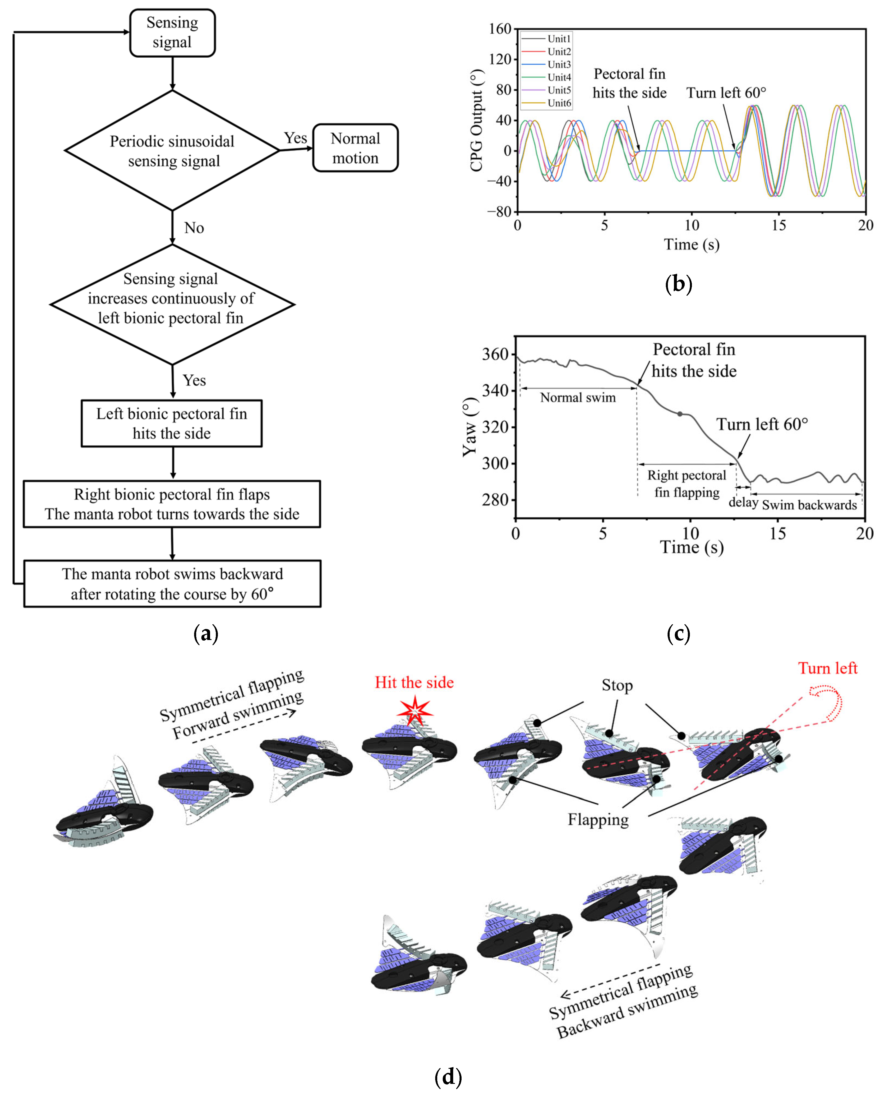 - Control validation: The “environmental perception-feedback control” functionality was validated through water tank experiments. The robot could identify side collision or bottom contact disturbances based on abnormal sensing signals and trigger corresponding obstacle avoidance responses, such as turning or lifting, by modulating CPG parameters.