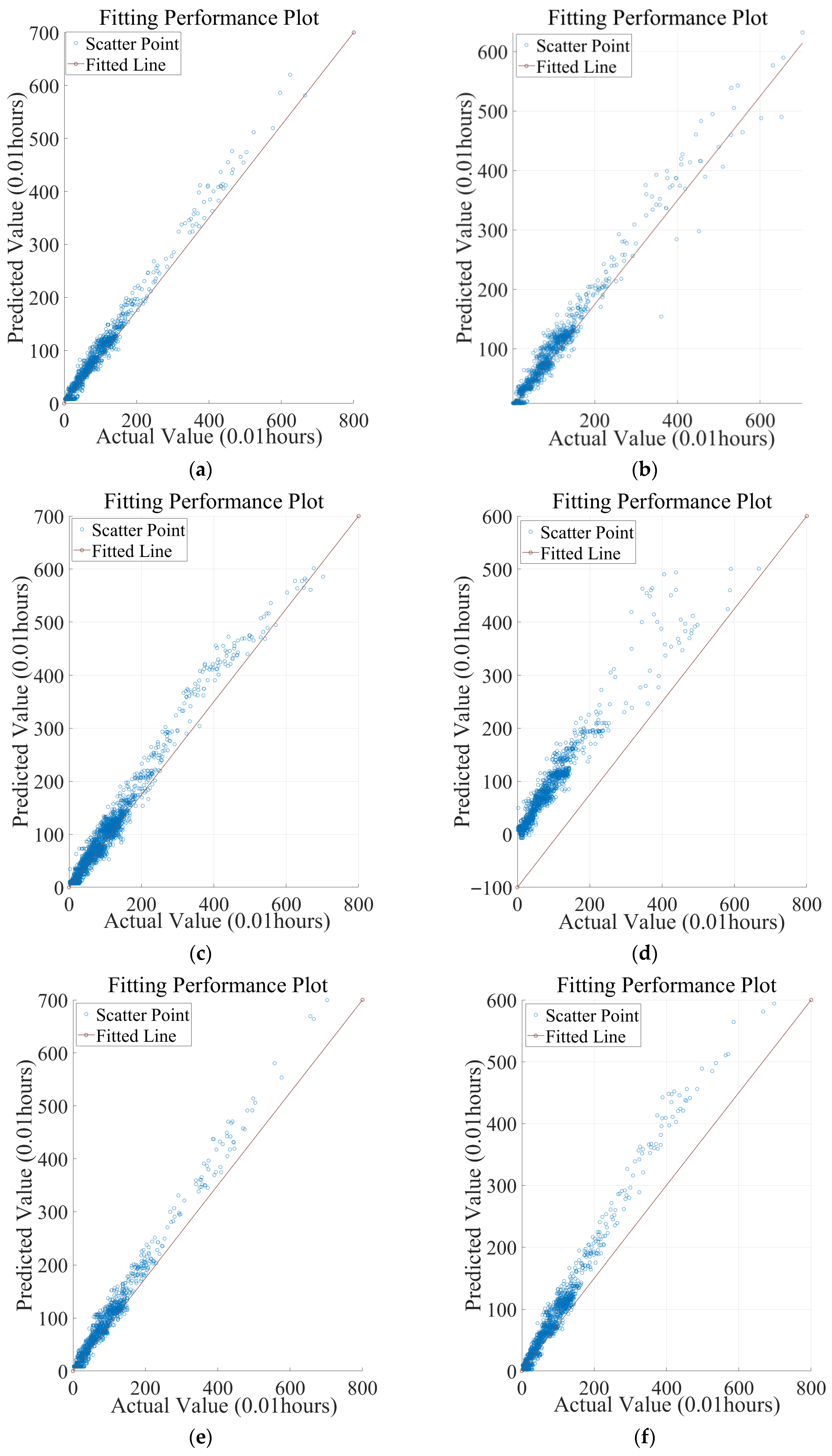 Figure 9d, the BO-CNN model displays poor fitting performance, with widely scattered points and several significant outliers where predictions deviate substantially from actual values. This suggests that relying solely on CNN and BO optimization is insufficient to capture temporal dependencies in voyage prediction tasks.