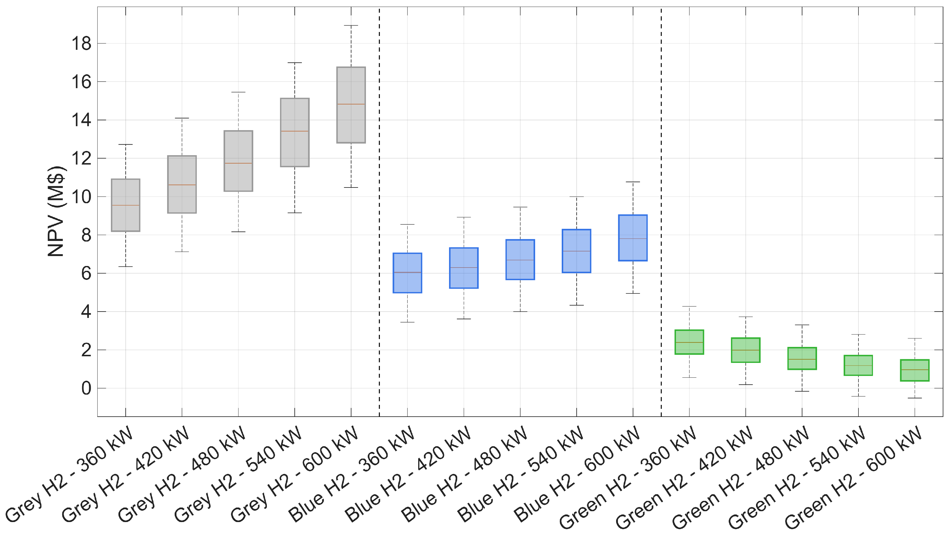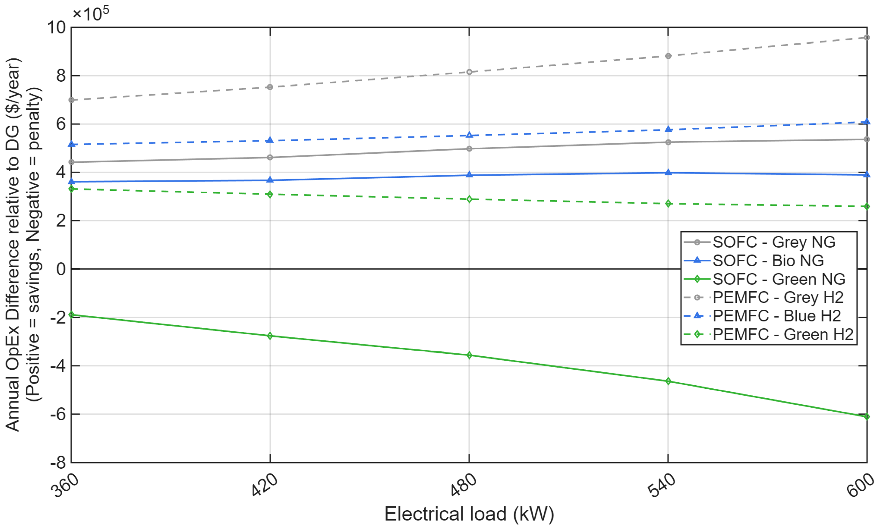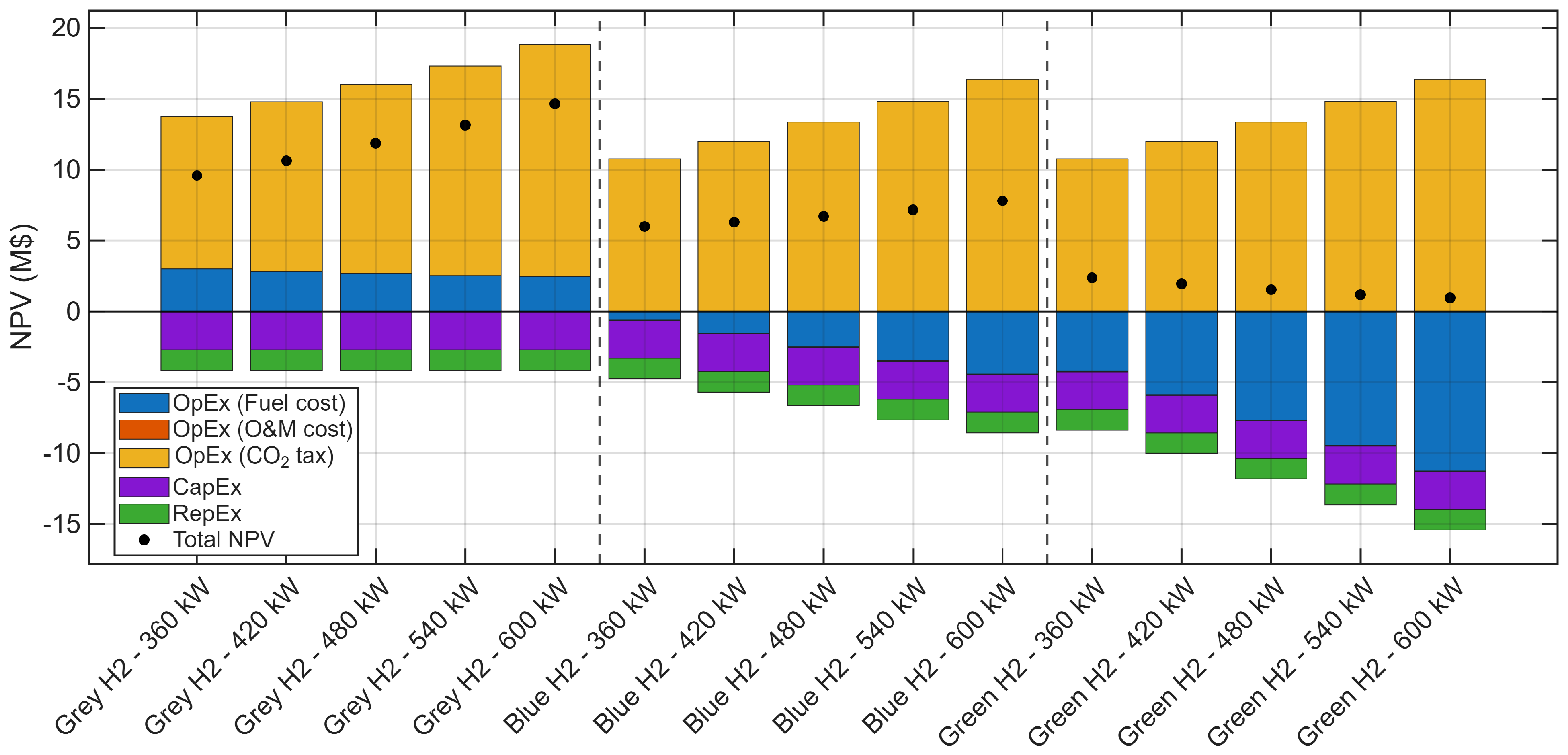 - Replacement costs (RepEx): costs of periodic replacement of fuel cell stacks and battery modules. Replacement costs are applied at predefined intervals, reflecting finite stack lifetimes, and are discounted to present value.