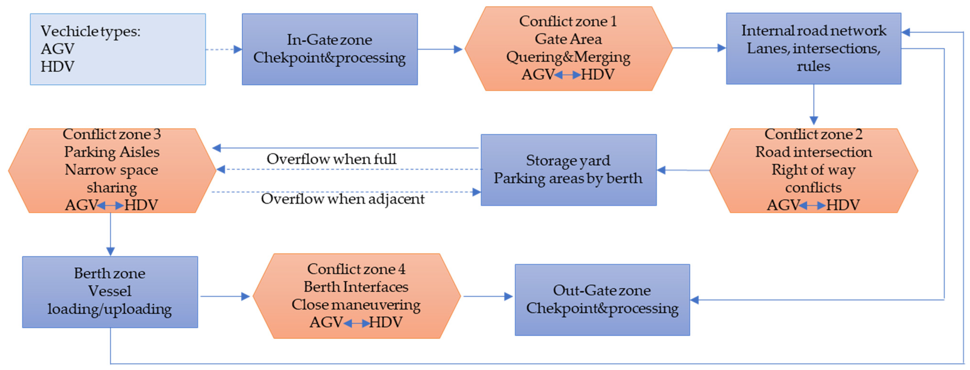 Operational rules and procedures govern all vehicle movements. At gates, vehicles experience delays due to customs, security checks, or administrative formalities—stops that are mandatory and vary in duration. Once inside, vehicles are assigned to specific parking areas based on their destination berth; however, if a designated area reaches full capacity, vehicles overflow into adjacent zones, leading to unplanned interactions. Finally, at the berths, vehicles must interact closely with vessel ramps and loading equipment, requiring careful coordination and precise movements to ensure safe and efficient loading and unloading processes. The environment naturally generates specific points where interactions between unmanned and human-driven vehicles are most intense and safety risks are highest.