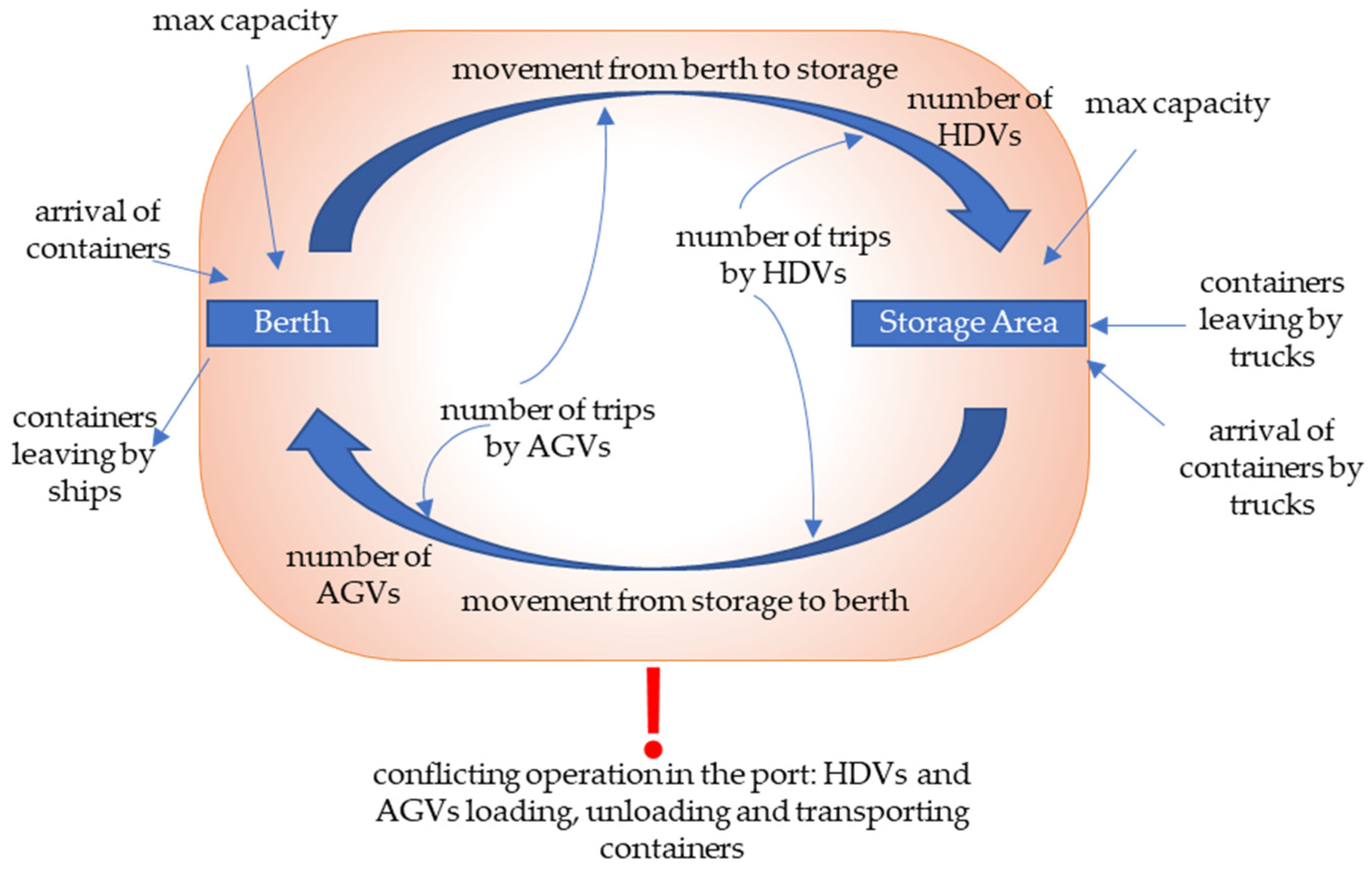 Figure 3 reformulates the port terminal as a capacity-constrained, flow-driven dynamic system in which conflicts emerge as endogenous products of interacting operational subsystems. In this representation, the berth and storage yard function as interconnected service nodes with finite handling capacities. Container arrivals and departures generate transport demand, which in turn induces bidirectional vehicle flows between these nodes through the internal road network.