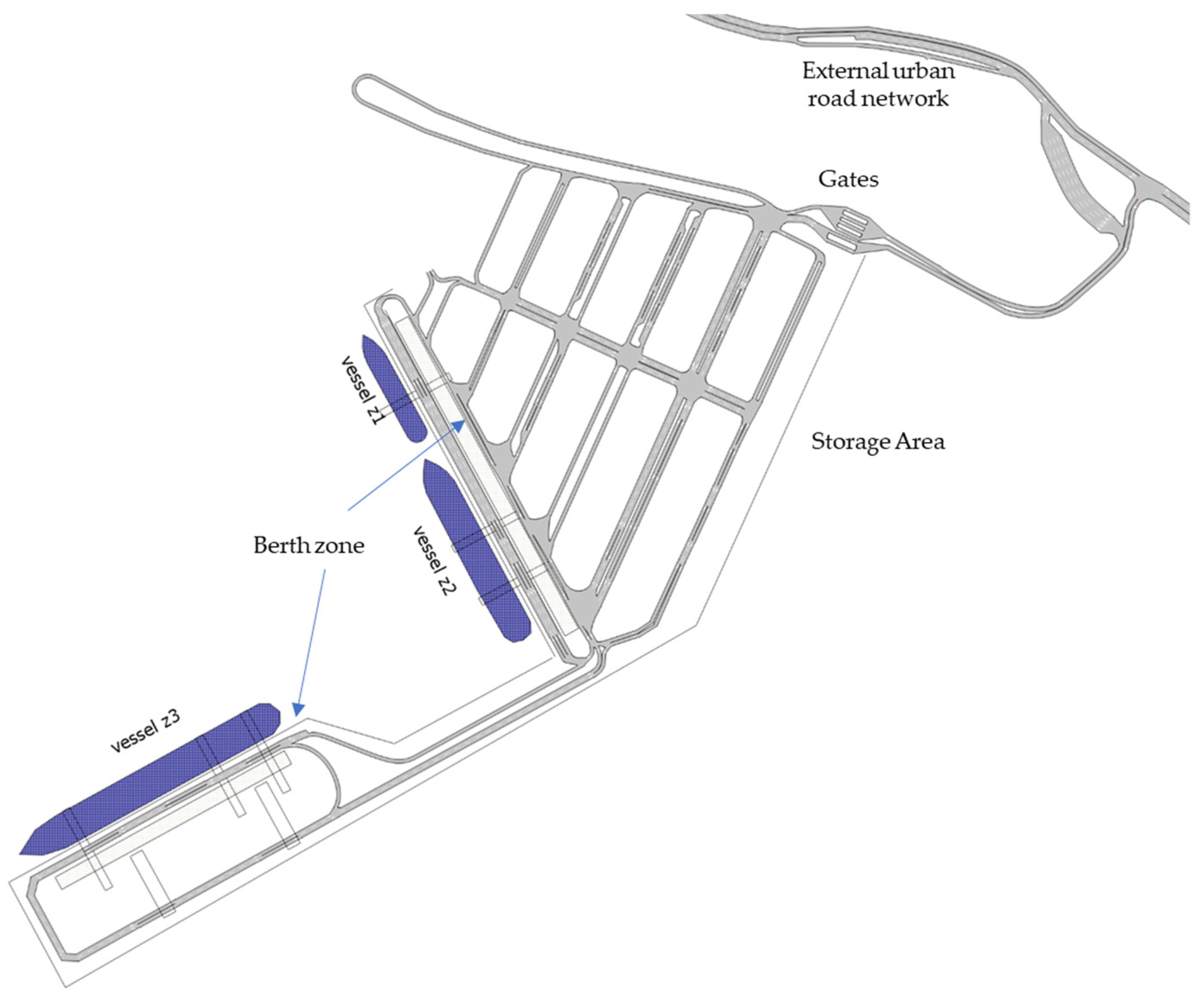 Infrastructure Zones are depicted in blue and represent the physical assets that constitute the port’s operational backbone. These include the in-gate and out-gate zones, where vehicles undergo administrative processing; the internal road network, which facilitates connectivity between functional areas; the storage yard, organized into parking zones associated with specific berths; and the berth interfaces themselves, where vessel loading and unloading occur. Each of these zones possesses distinct geometric and operational characteristics that influence vehicle behavior and interaction patterns.