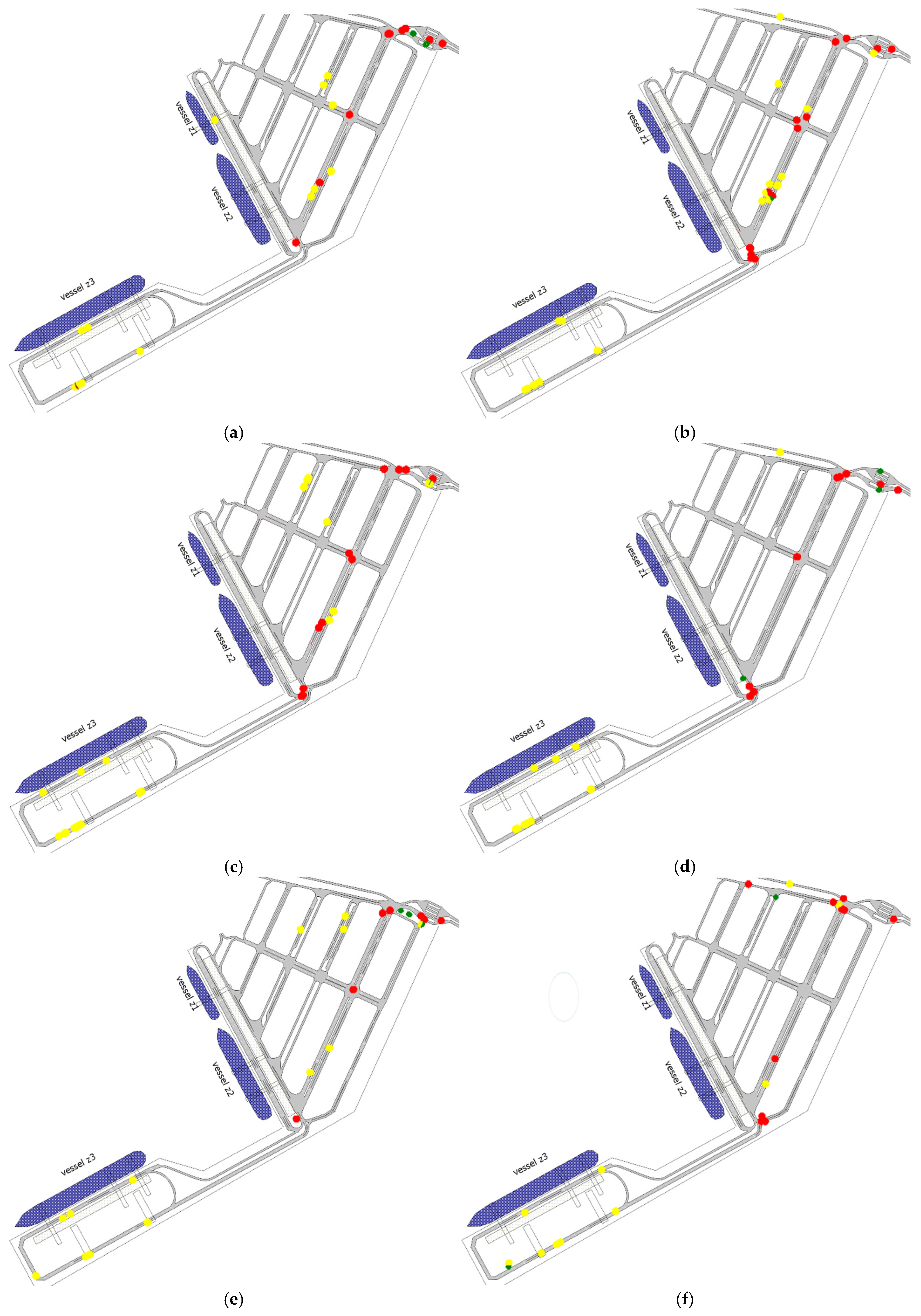 The integration of these elements within a single diagrammatic framework enables systematic analysis of port operations from a safety perspective. By mapping infrastructure, conflict zones, and vehicle trajectories onto a common spatial reference, researchers and practitioners can identify vulnerable points in the system, design targeted interventions, and evaluate the potential impacts of introducing unmanned vehicles into existing operational environments. This visual tool thus serves not merely as an illustration but as an analytical instrument for understanding and mitigating conflict dynamics in mixed-traffic port settings.