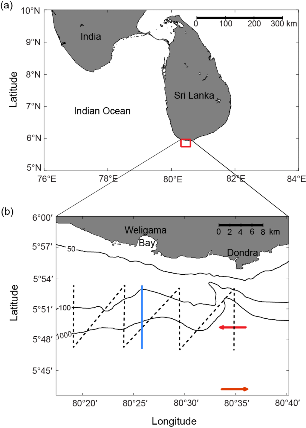 (a) Location map of study area on the southern coast of Sri Lanka delineated by the red box. (b) Dashed lines indicate saw tooth transect tracklines in 2011 and 2012. Blue-grey vertical line directly south of Weligama Bay represents the Conductivity-Temperature-Depth (CTD) transect used to gather salinity, temperature and density data. Red arrows indicate the major east-west shipping route across the Indian Ocean from Admiralty charts.