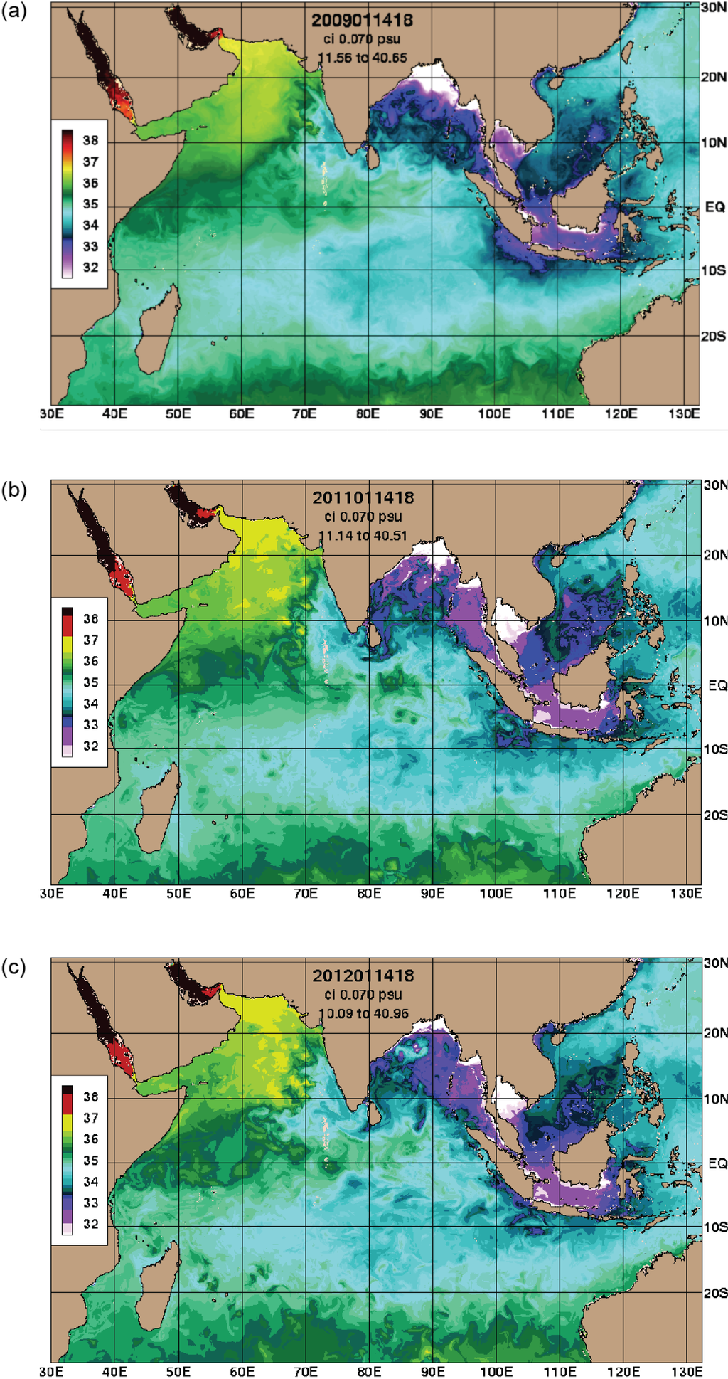 Sea surface salinity in the Indian Ocean from (a) 14 January 2009 (b) 14 January 2011 and (c) 14 January 2012 from HYCOM global hindcast model.
