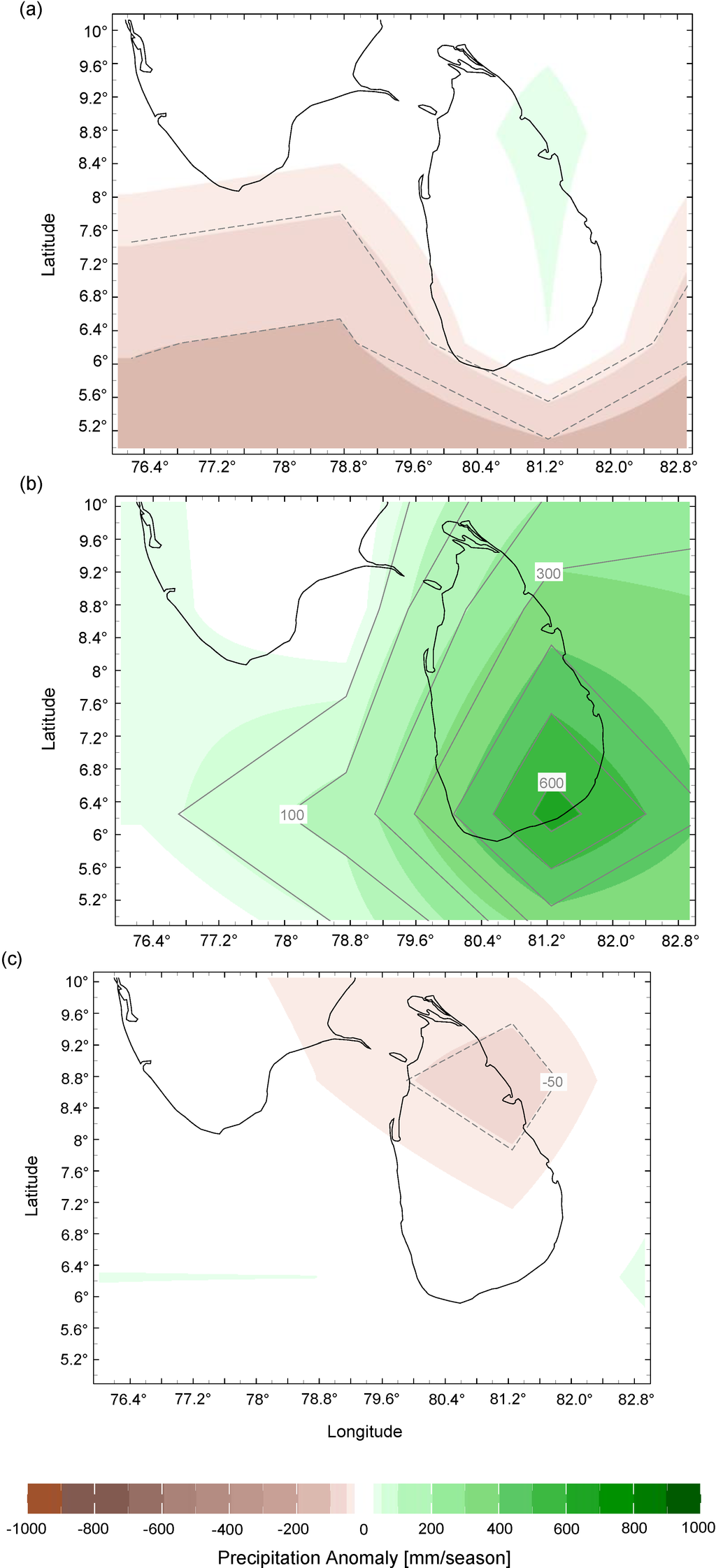 Seasonal precipitation anomaly around Sri Lanka for the period of (a) January–March 2009 (b) January–March 2011 and (c) January–March 2012. Green represents positive precipitation anomalies while brown represents negative precipitation anomalies.
